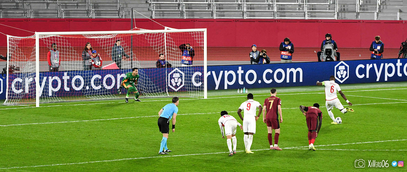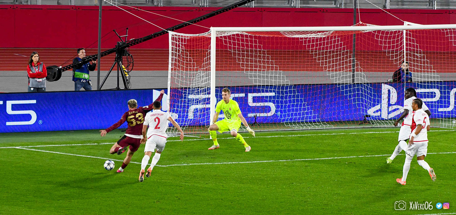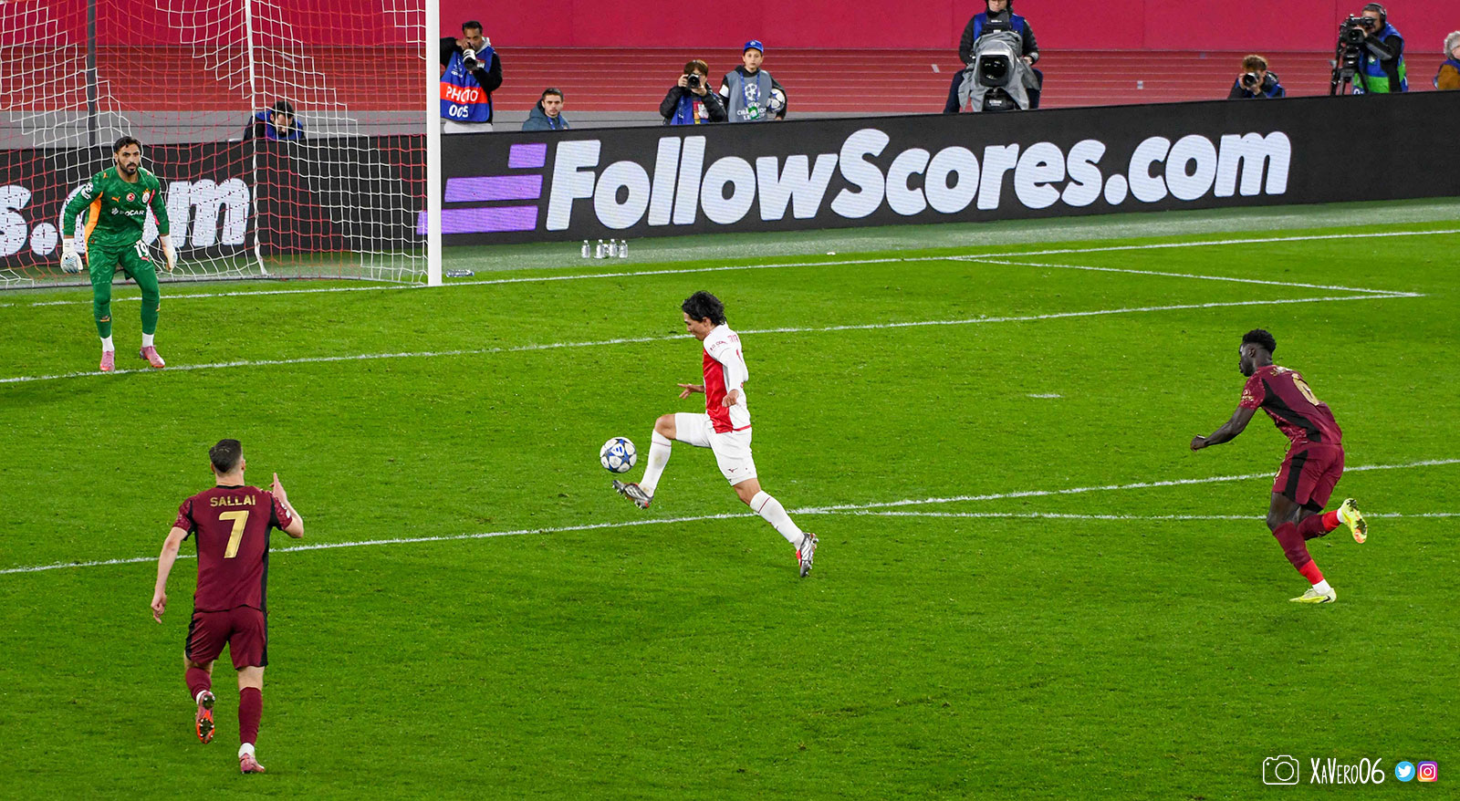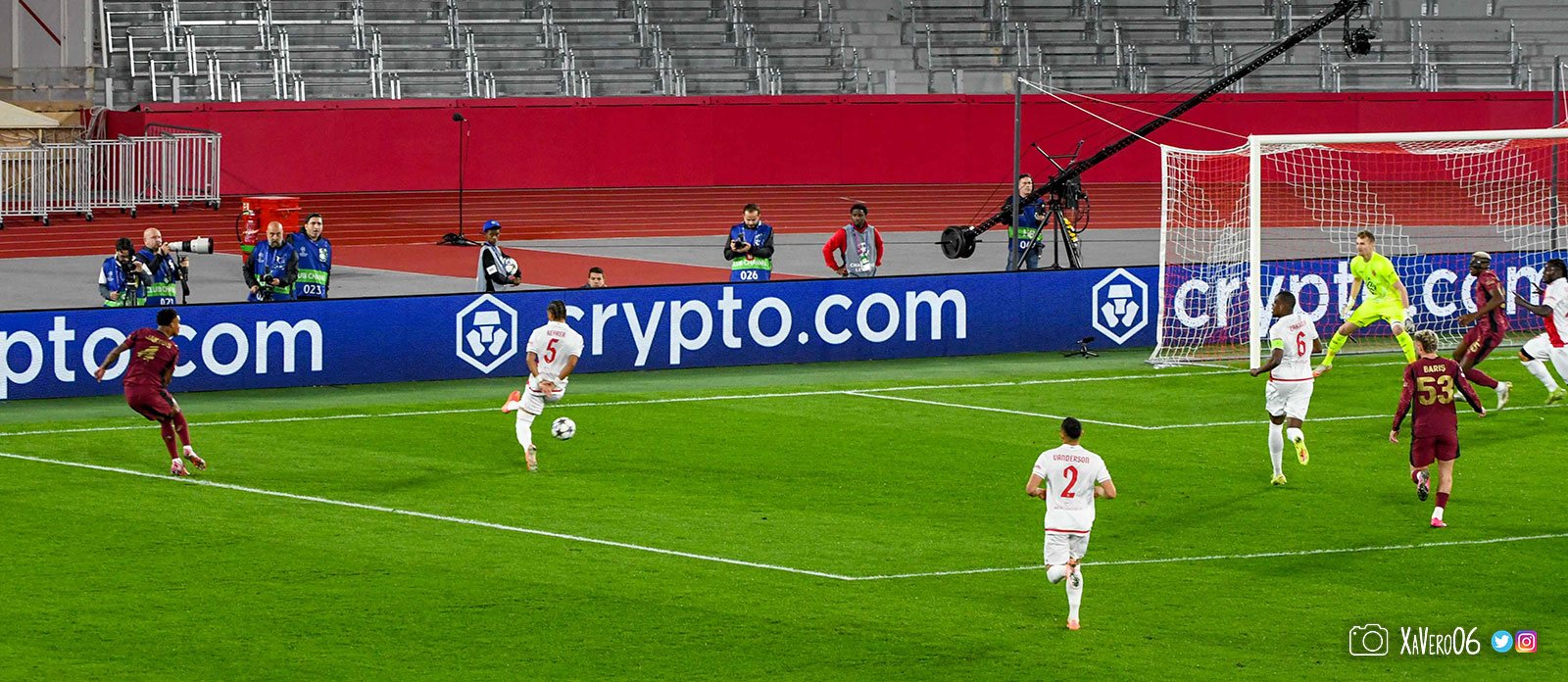 Pressing monégasque payant aux 30m, Vanderson est trouvé à droite et centre immédiatement pour le point de pénalty au-dessus de Sánchez, pour la volée du plat du pied gauche de Takumi Minamino. Çakir repousse devant lui, sur Minamino qui contrôle, passe devant Sánchez qui en voulant dégager tape dans la jambe du japonais qui s'est positionné devant lui (48e).