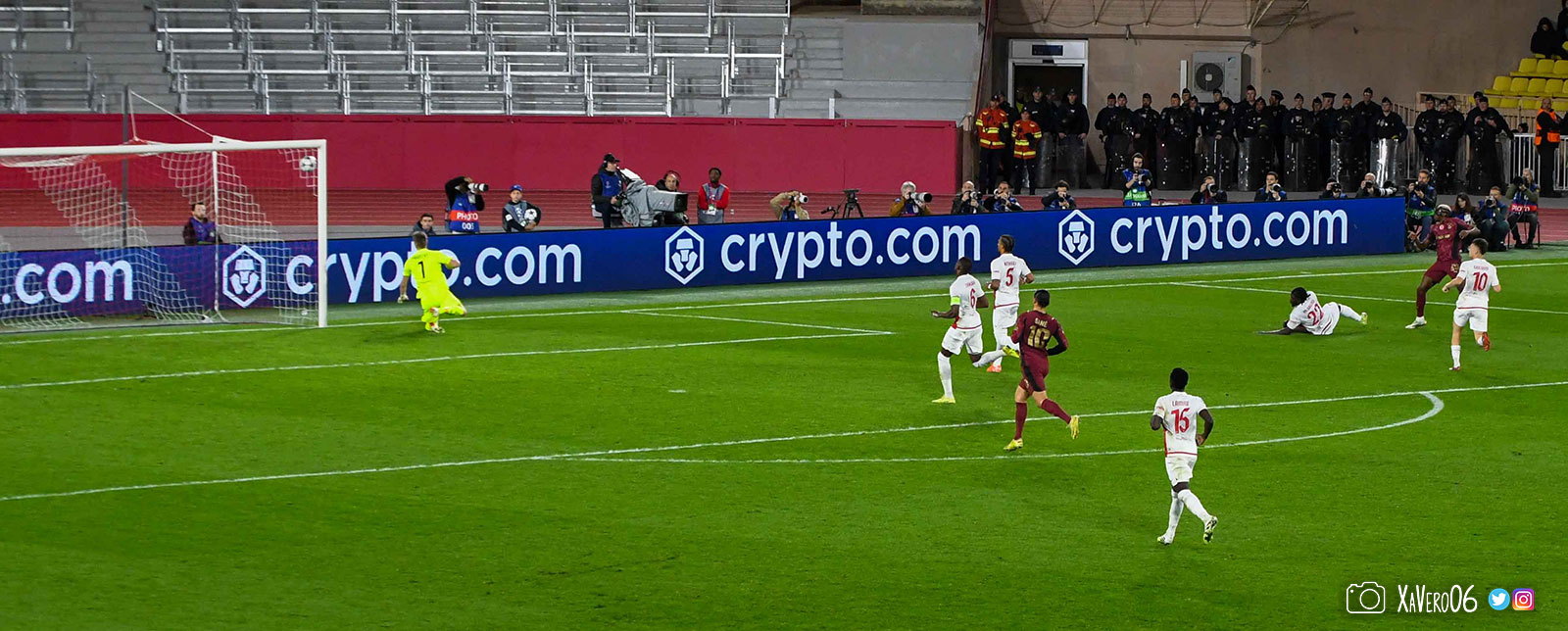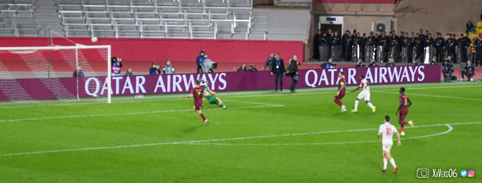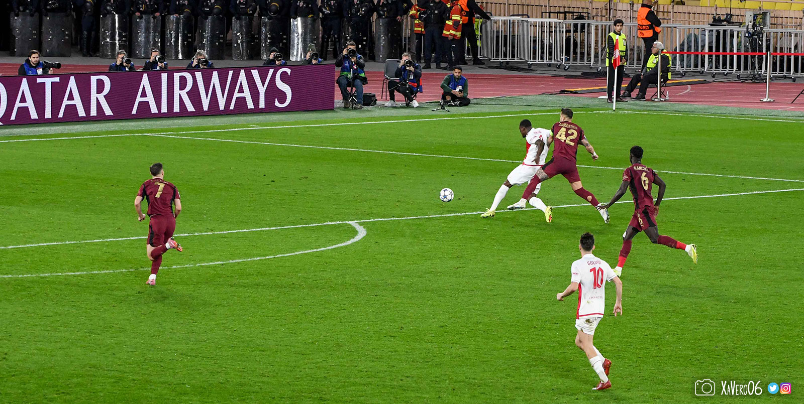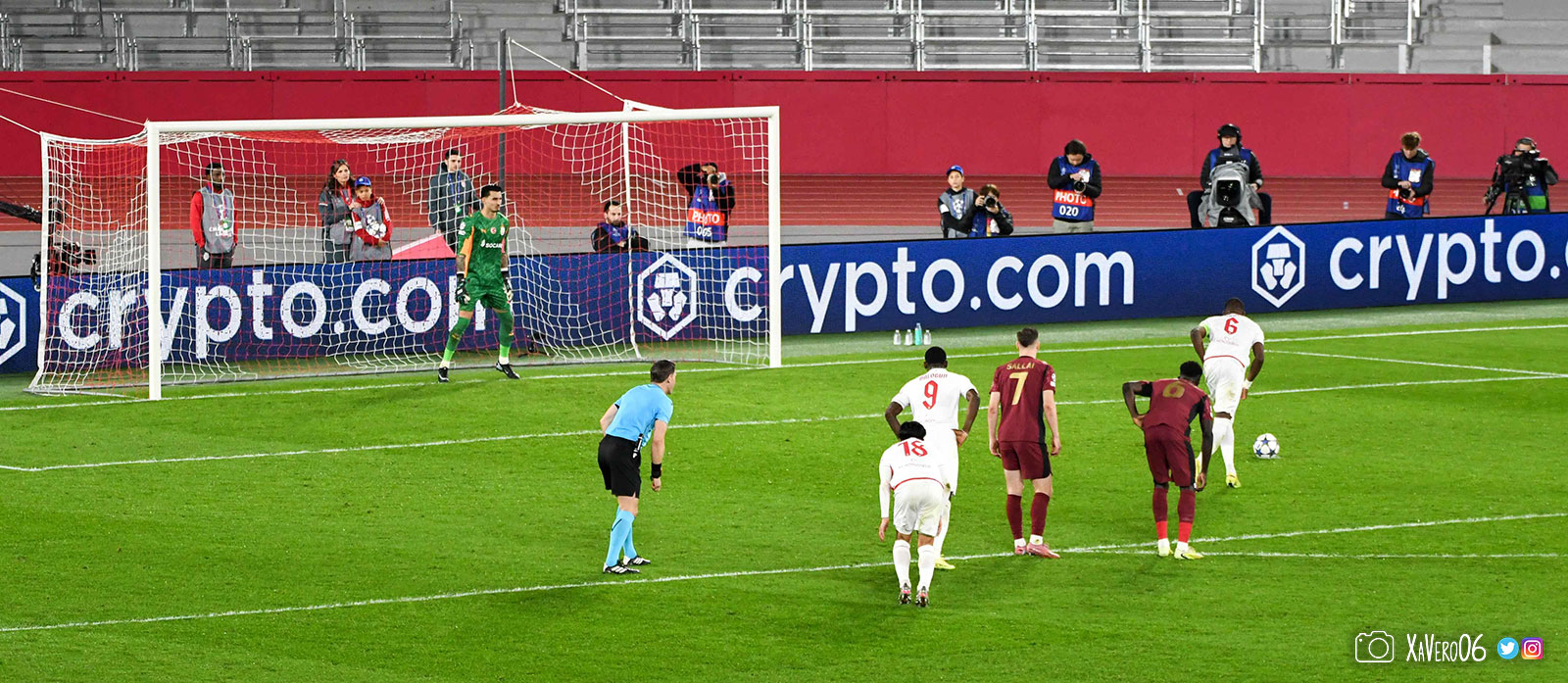 Pressing monégasque payant aux 30m, Vanderson est trouvé à droite et centre immédiatement pour le point de pénalty au-dessus de Sánchez, pour la volée du plat du pied gauche de Takumi Minamino. Çakir repousse devant lui, sur Minamino qui contrôle, passe devant Sánchez qui en voulant dégager tape dans la jambe du japonais qui s'est positionné devant lui (48e).