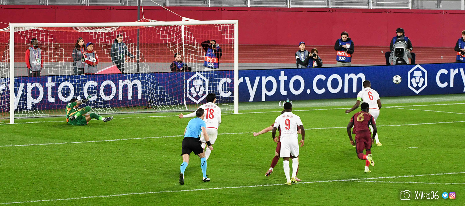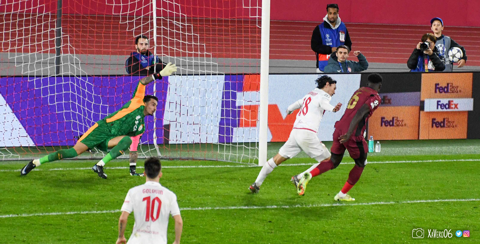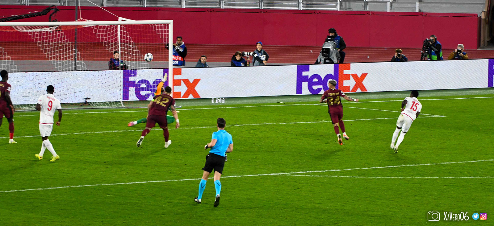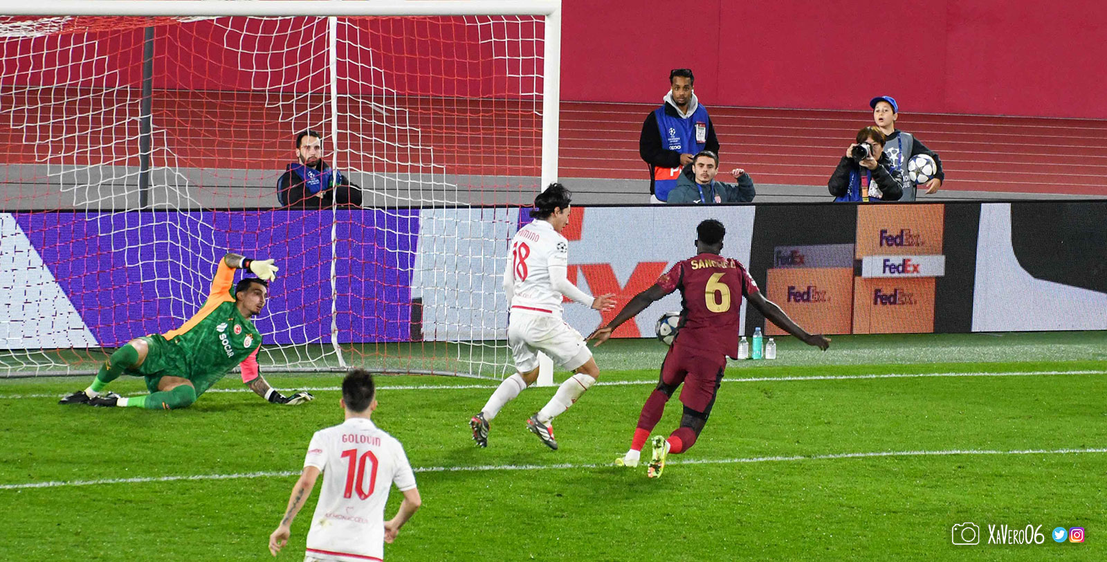 Pressing monégasque payant aux 30m, Vanderson est trouvé à droite et centre immédiatement pour le point de pénalty au-dessus de Sánchez, pour la volée du plat du pied gauche de Takumi Minamino. Çakir repousse devant lui, sur Minamino qui contrôle, passe devant Sánchez qui en voulant dégager tape dans la jambe du japonais qui s'est positionné devant lui (48e).