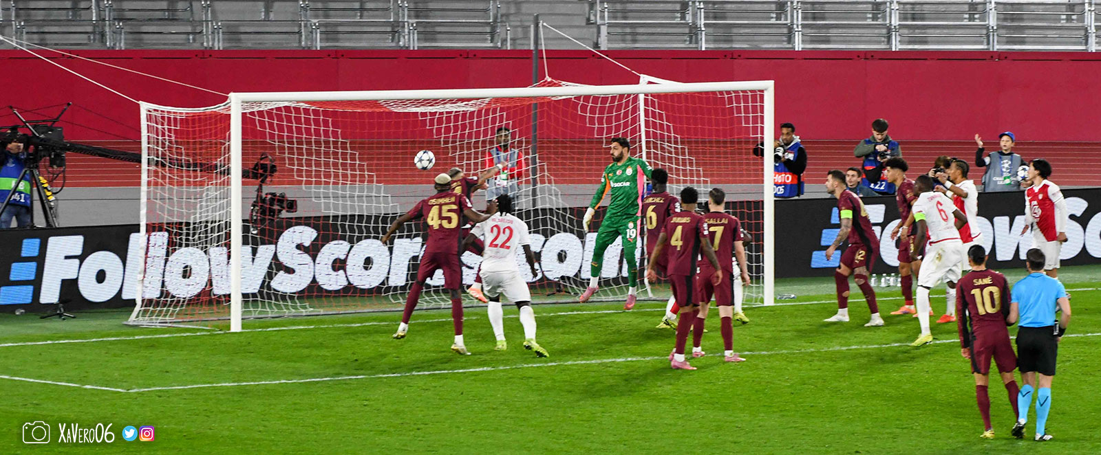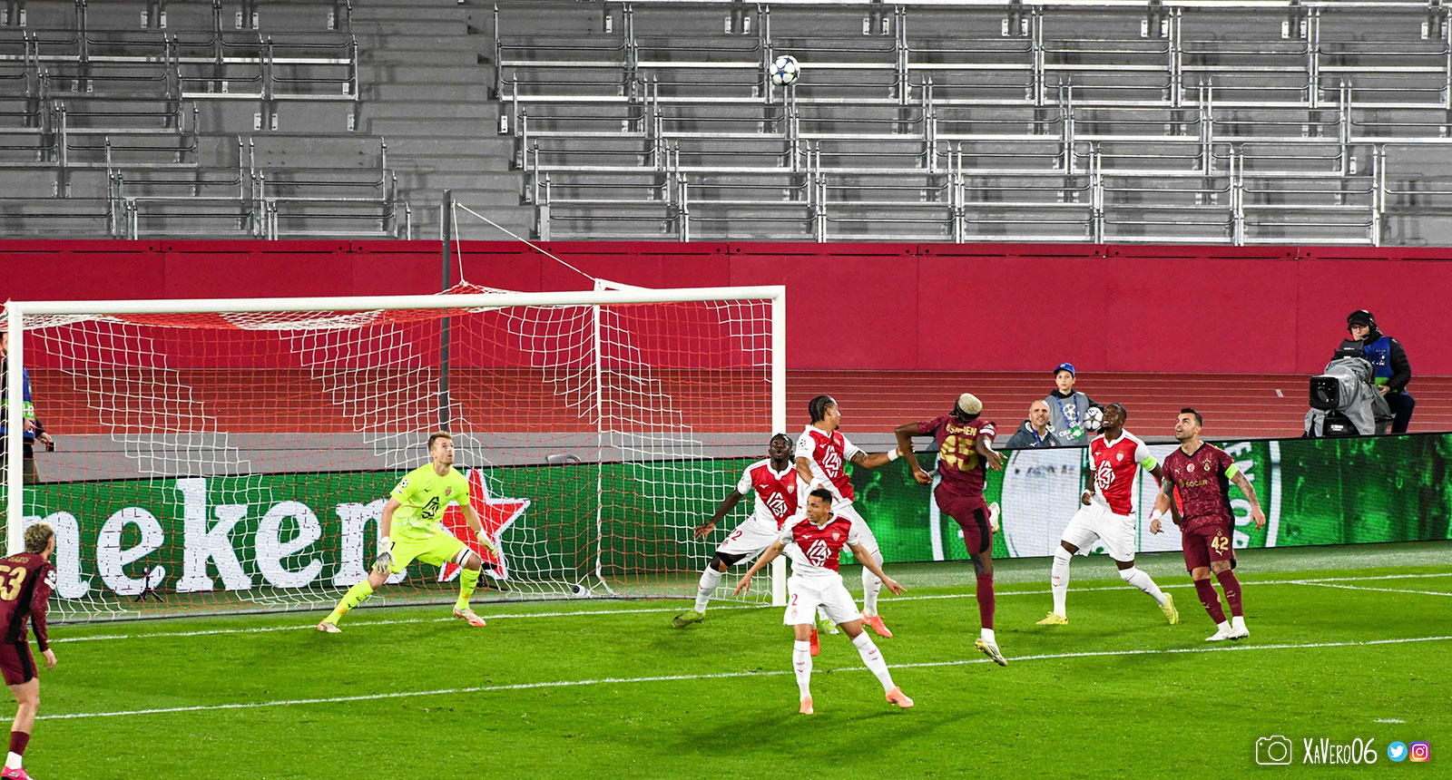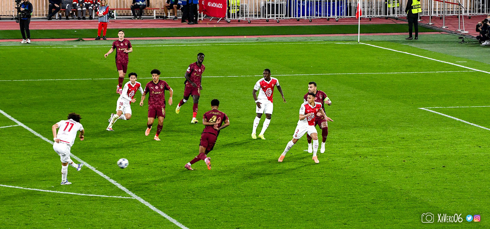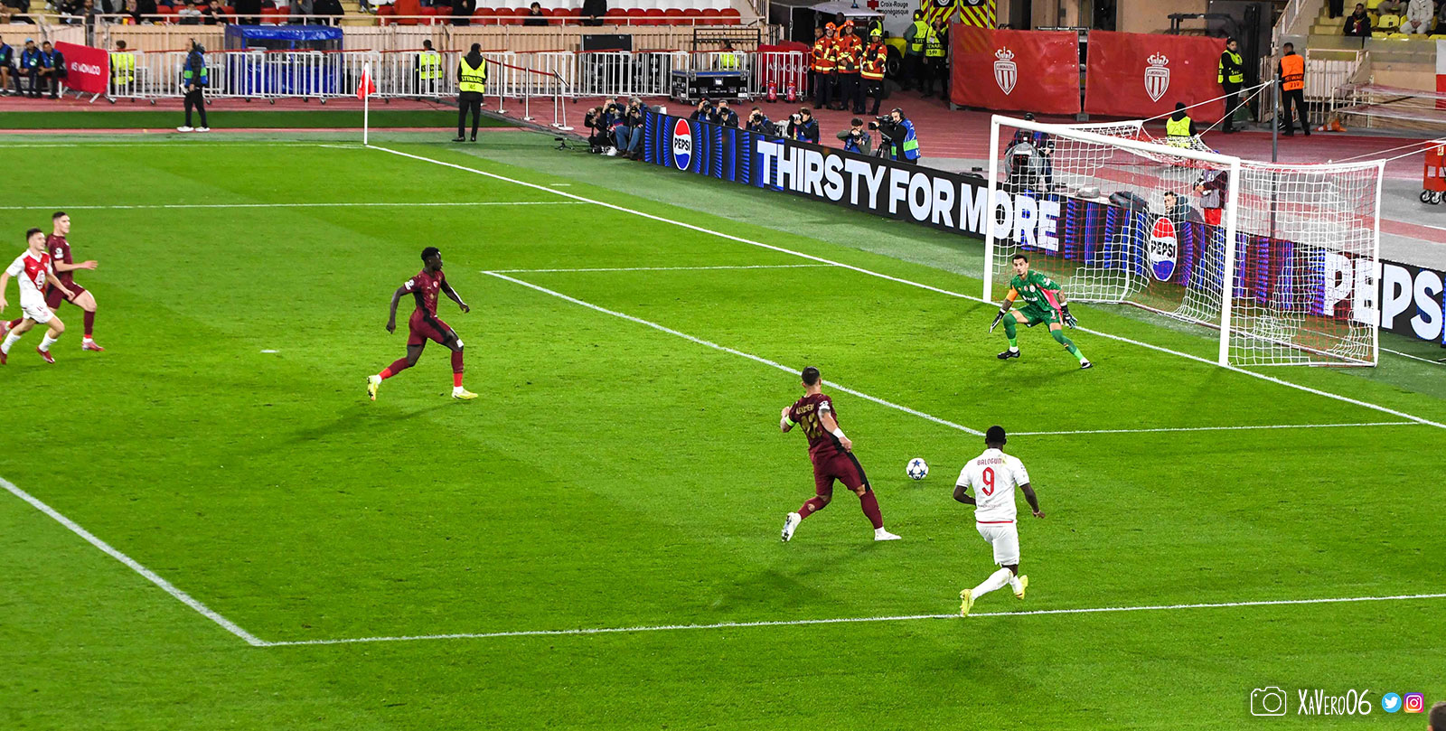 Monaco récupère encore le ballon dans son camp avec Camara le long de la touche à hauteur de la ligne médiane qui envoit un long ballon pour Minamino qui met d'une tête polongeante dans la course de Folarin Balogun dans l'axe, qui prend Bardakci de vitesse et frappe en force... de peu au-dessus (62e).
