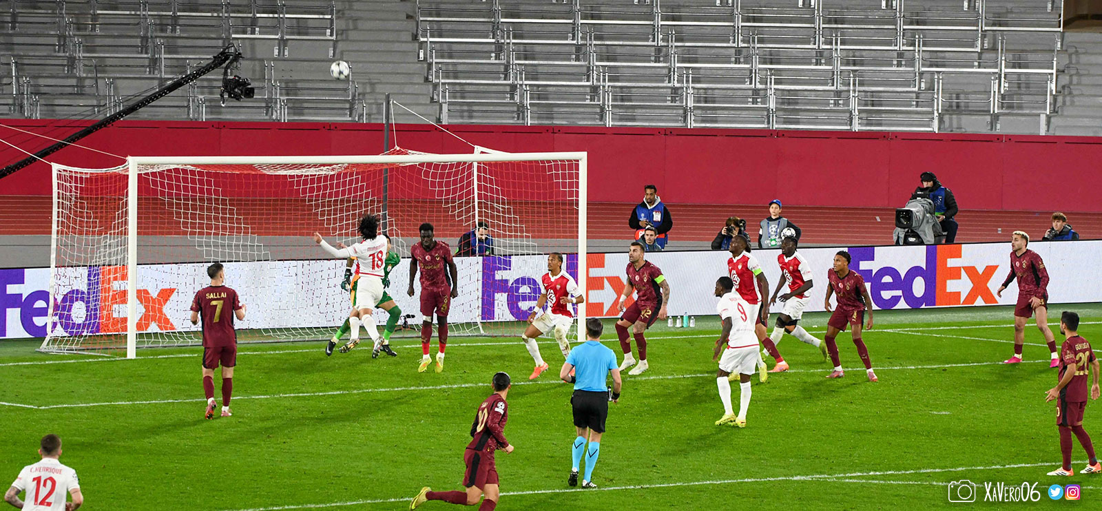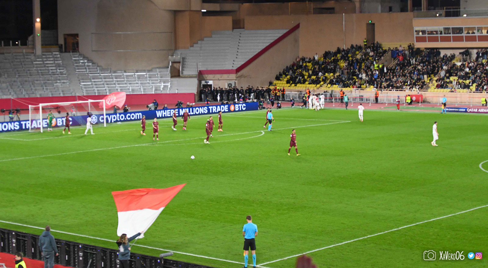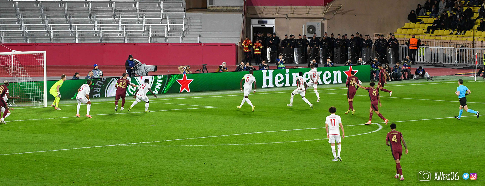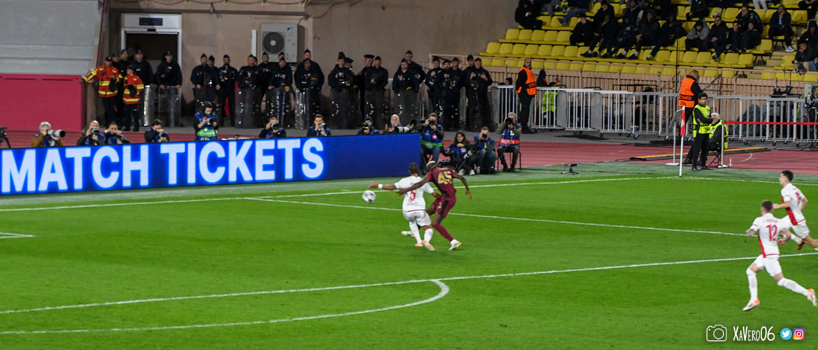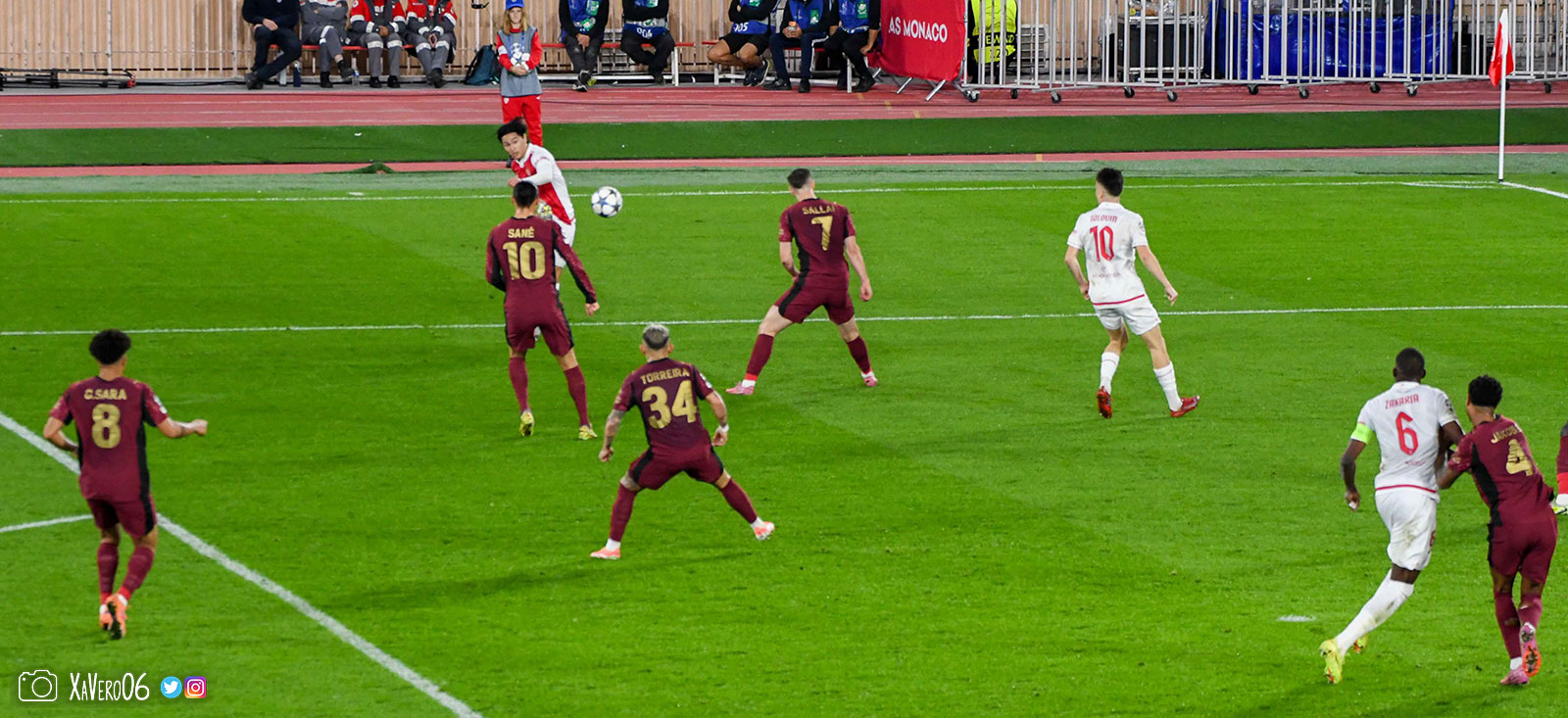 Monaco récupère encore le ballon dans son camp avec Camara le long de la touche à hauteur de la ligne médiane qui envoit un long ballon pour Minamino qui met d'une tête polongeante dans la course de Folarin Balogun dans l'axe, qui prend Bardakci de vitesse et frappe en force... de peu au-dessus (62e).