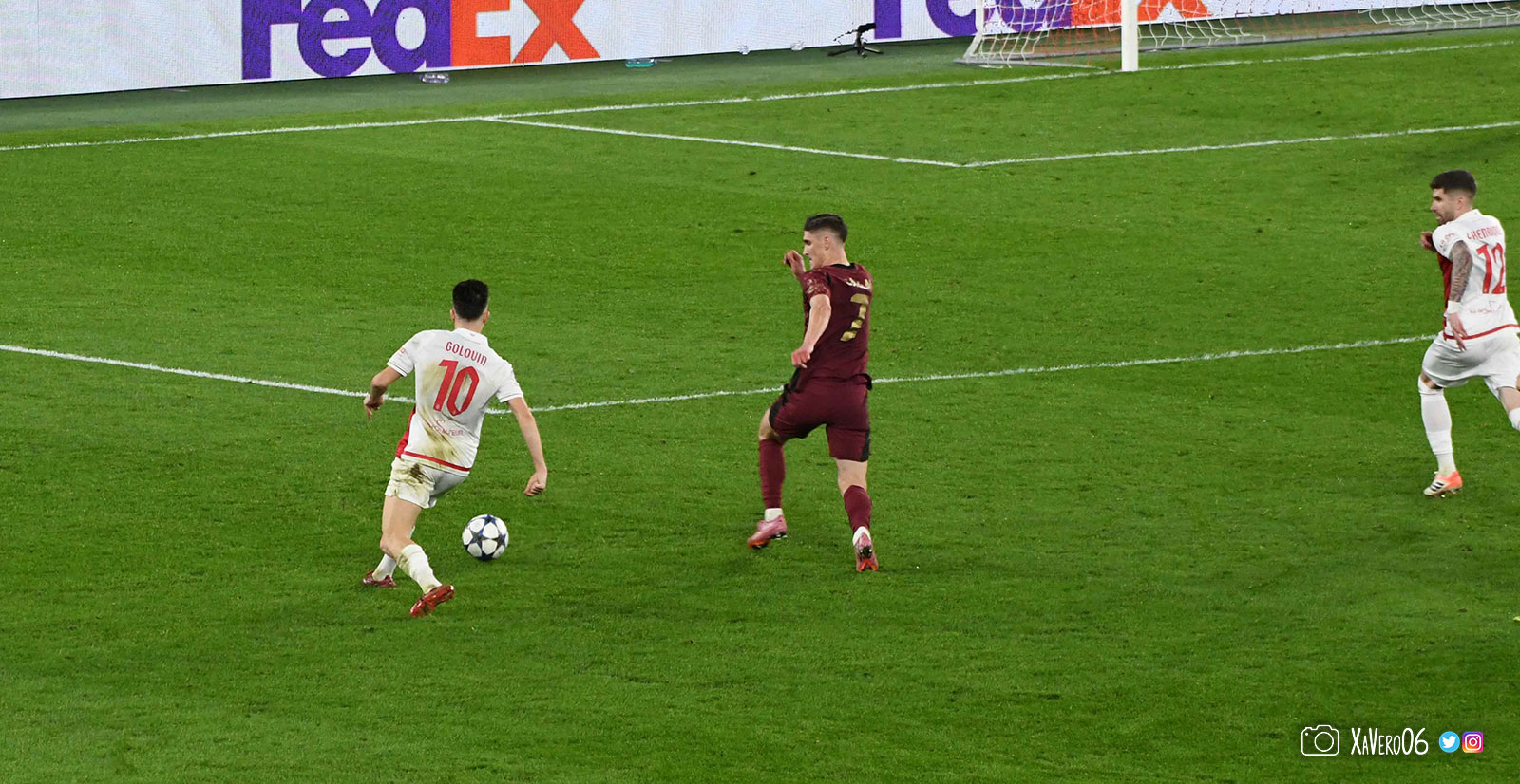 - Longue balle en profondeur d'Akliouche pour Takumi Minamino dans l'axe, entre Sánchez et Sallai, qui n'arrive pas à frapper en déséquilibre (72e).