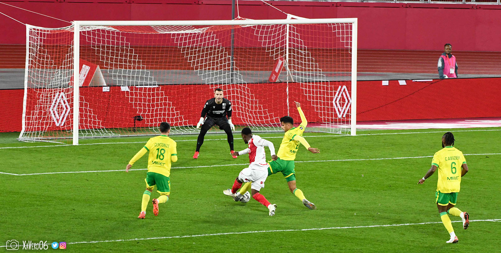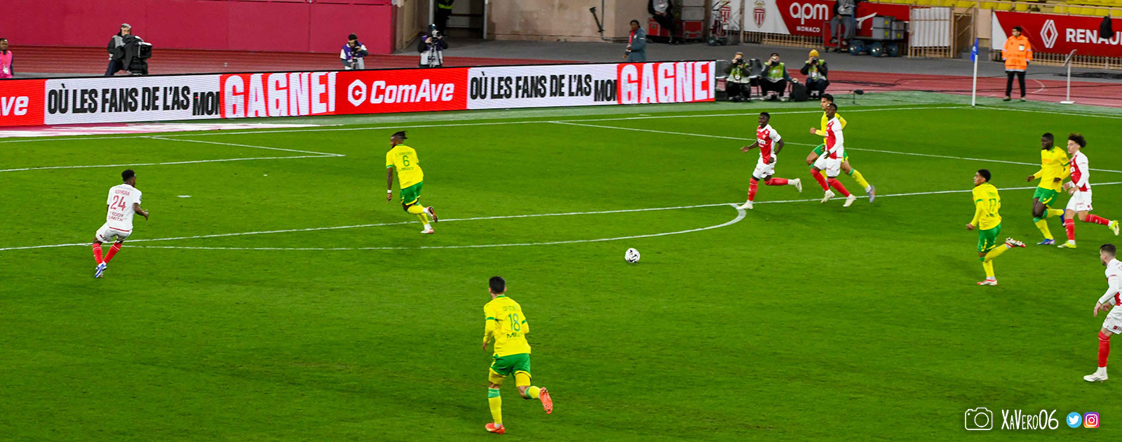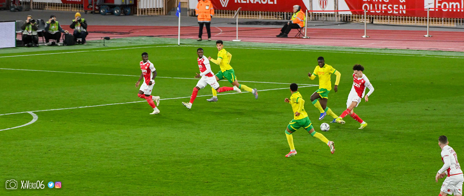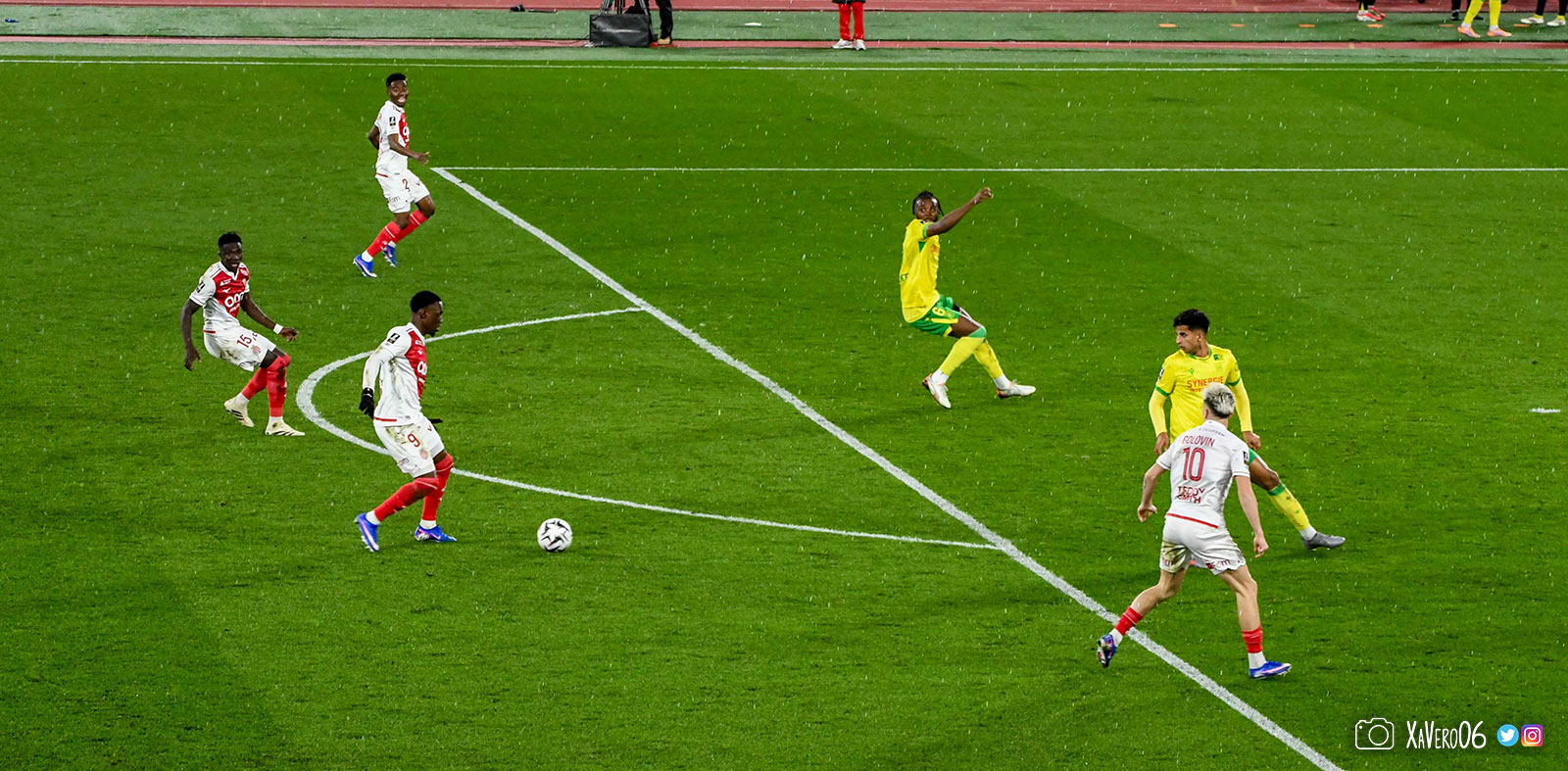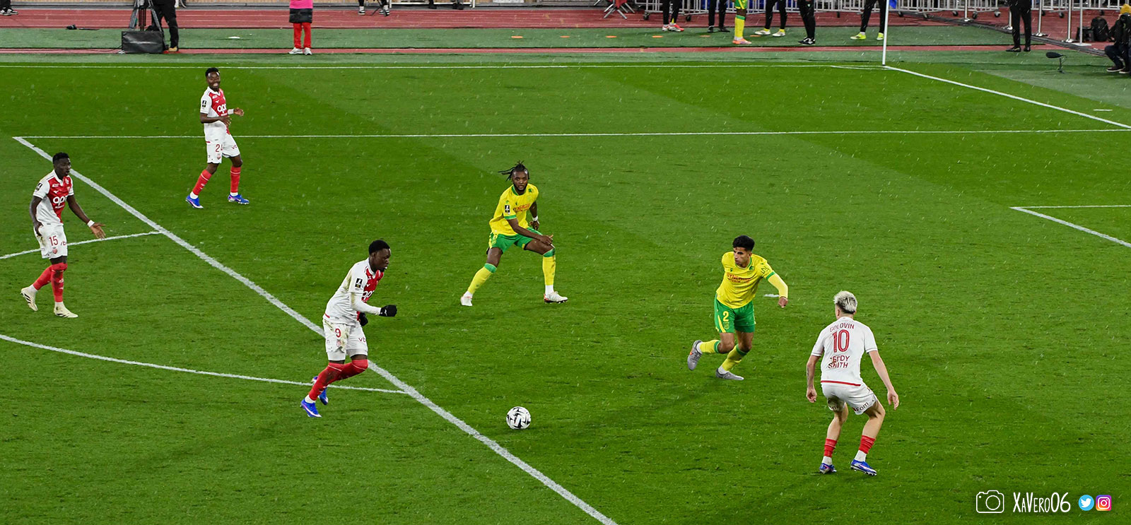 Nantes est encore gêné par le pressing et met en retrait pour sa défense aux 35m. Yousuf cherche Coquelin dans le rond central, pressé par Zakaria, qui pousse le ballon sur Golovin entre le passeur et le receveur, qui se retourne pour lancer un contre à 5 contre 2, avec Akliouche et Balogun à droite, le capitaine de l'ASM et le double buteur à gauche, avec Sylla et Yousuf au milieu.