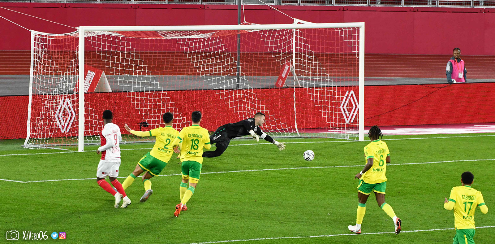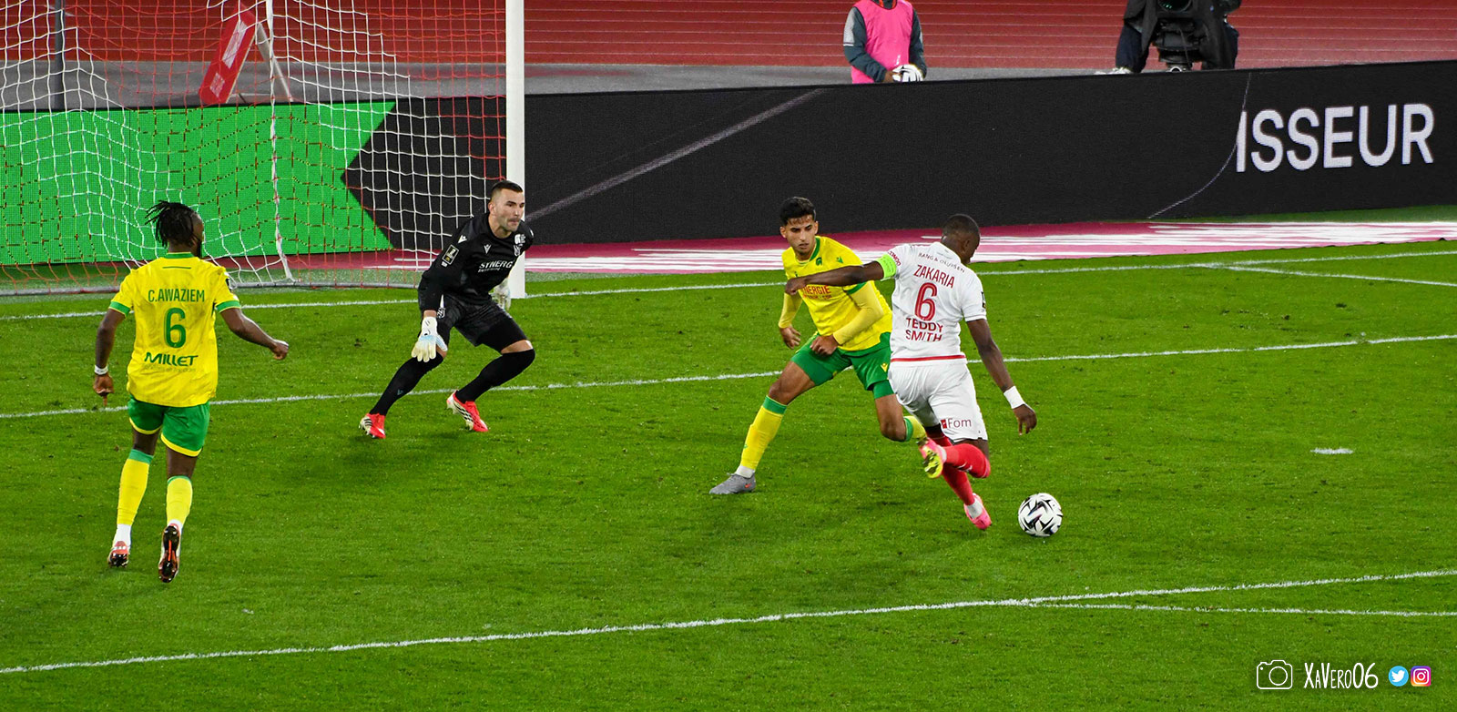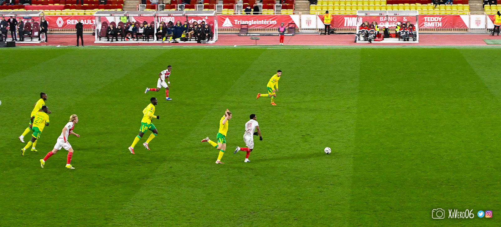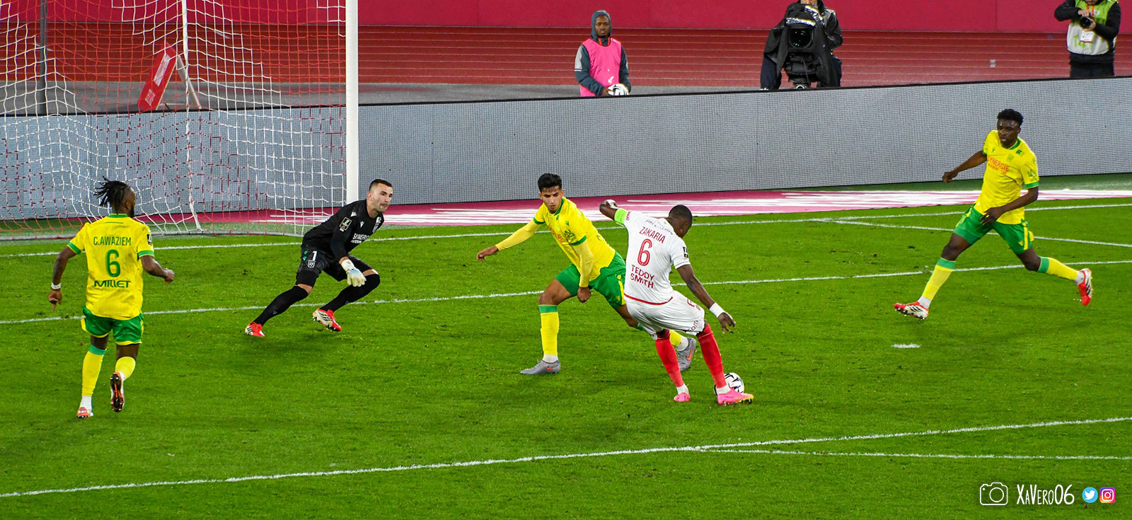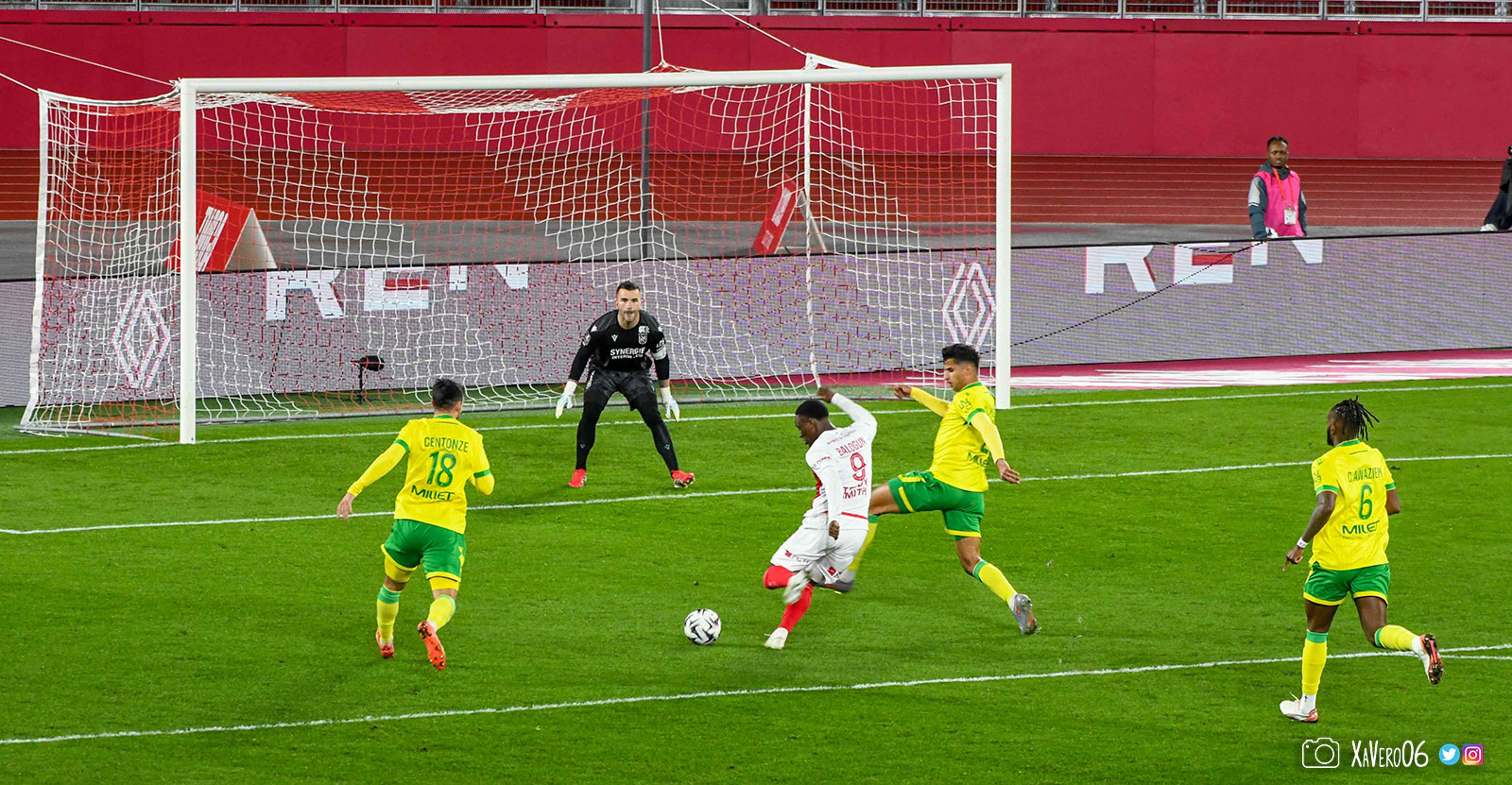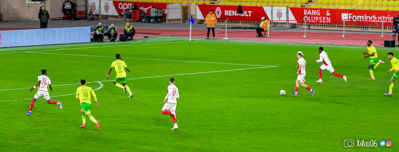 Nantes est encore gêné par le pressing et met en retrait pour sa défense aux 35m. Yousuf cherche Coquelin dans le rond central, pressé par Zakaria, qui pousse le ballon sur Golovin entre le passeur et le receveur, qui se retourne pour lancer un contre à 5 contre 2, avec Akliouche et Balogun à droite, le capitaine de l'ASM et le double buteur à gauche, avec Sylla et Yousuf au milieu.