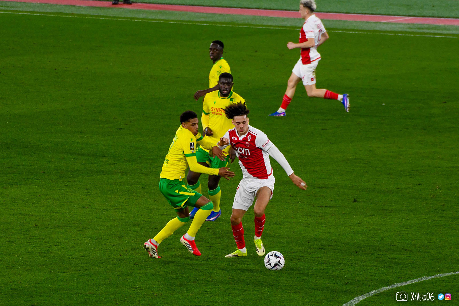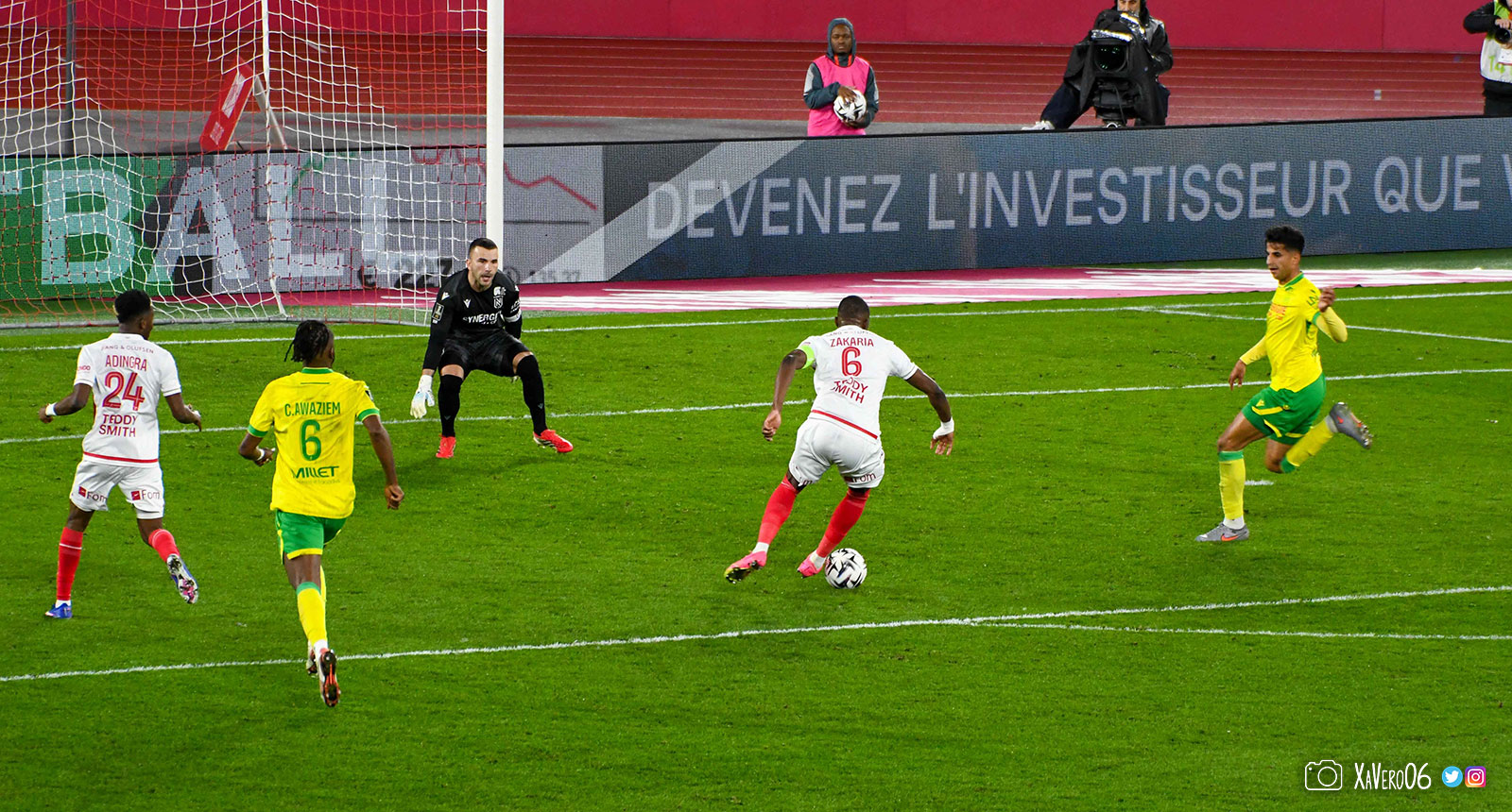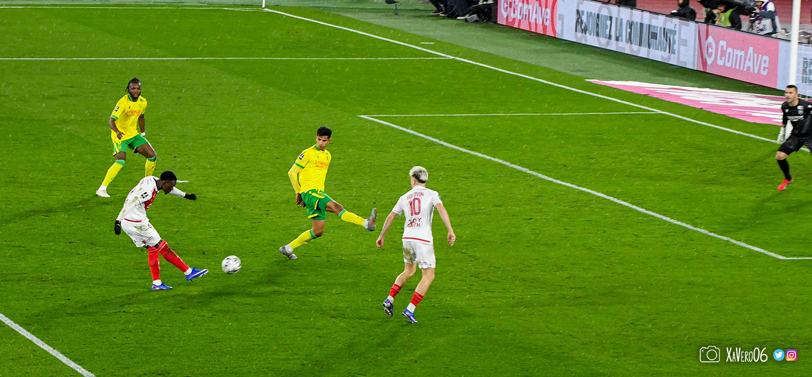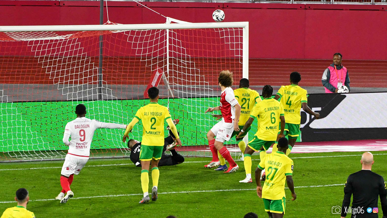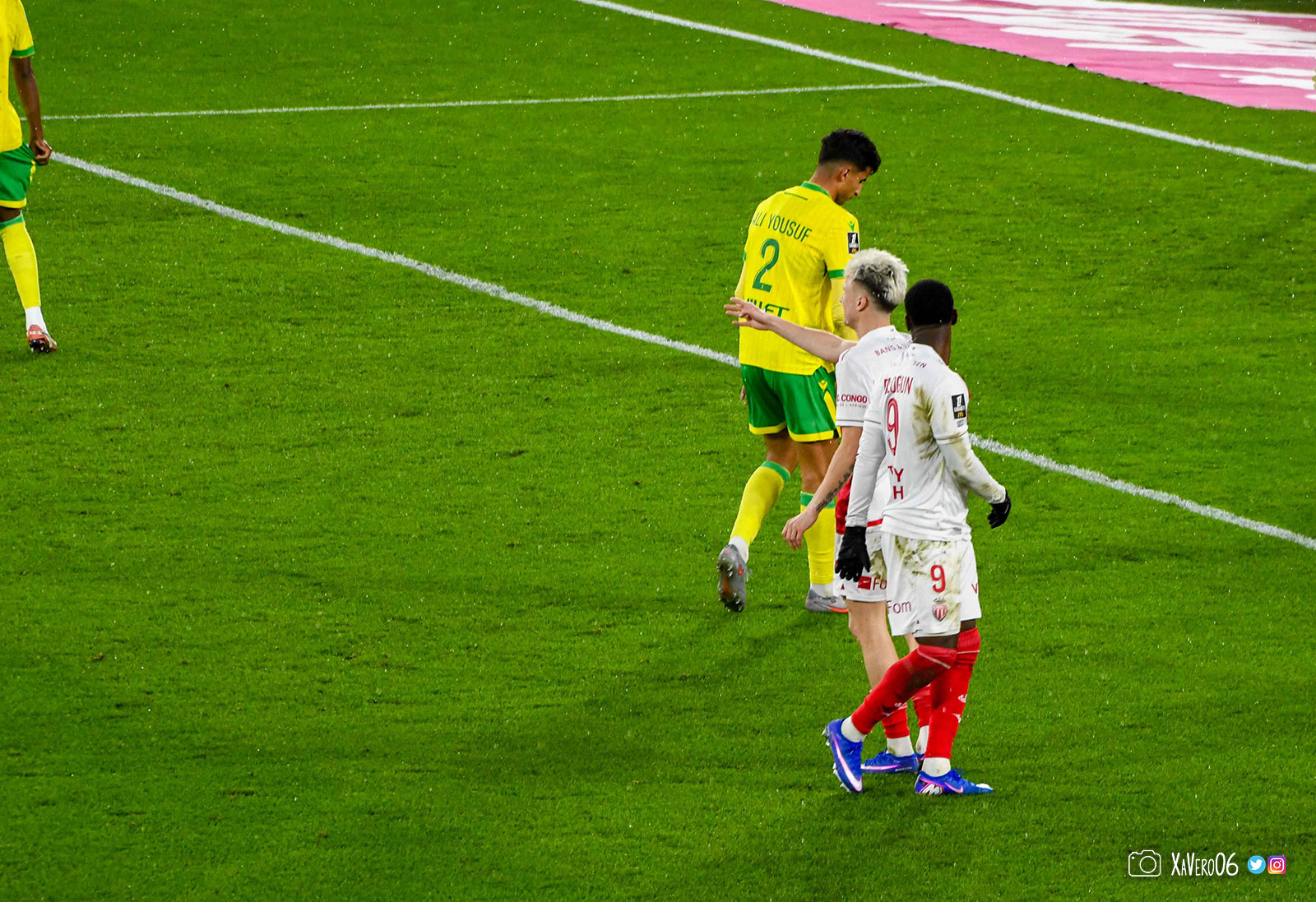 Nantes est encore gêné par le pressing et met en retrait pour sa défense aux 35m. Yousuf cherche Coquelin dans le rond central, pressé par Zakaria, qui pousse le ballon sur Golovin entre le passeur et le receveur, qui se retourne pour lancer un contre à 5 contre 2, avec Akliouche et Balogun à droite, le capitaine de l'ASM et le double buteur à gauche, avec Sylla et Yousuf au milieu.