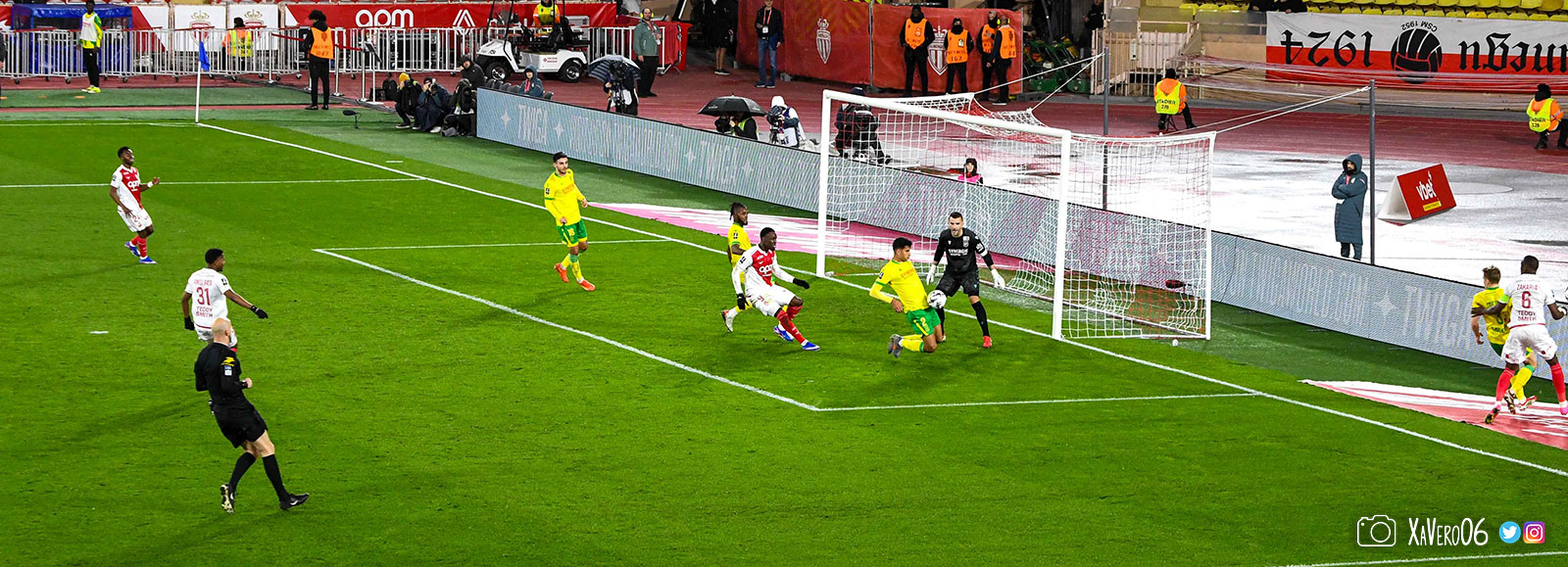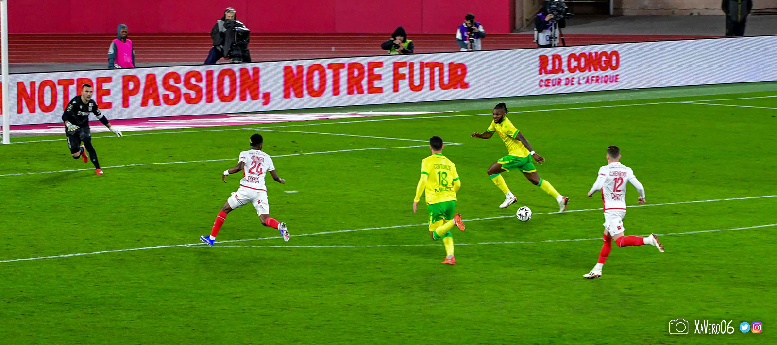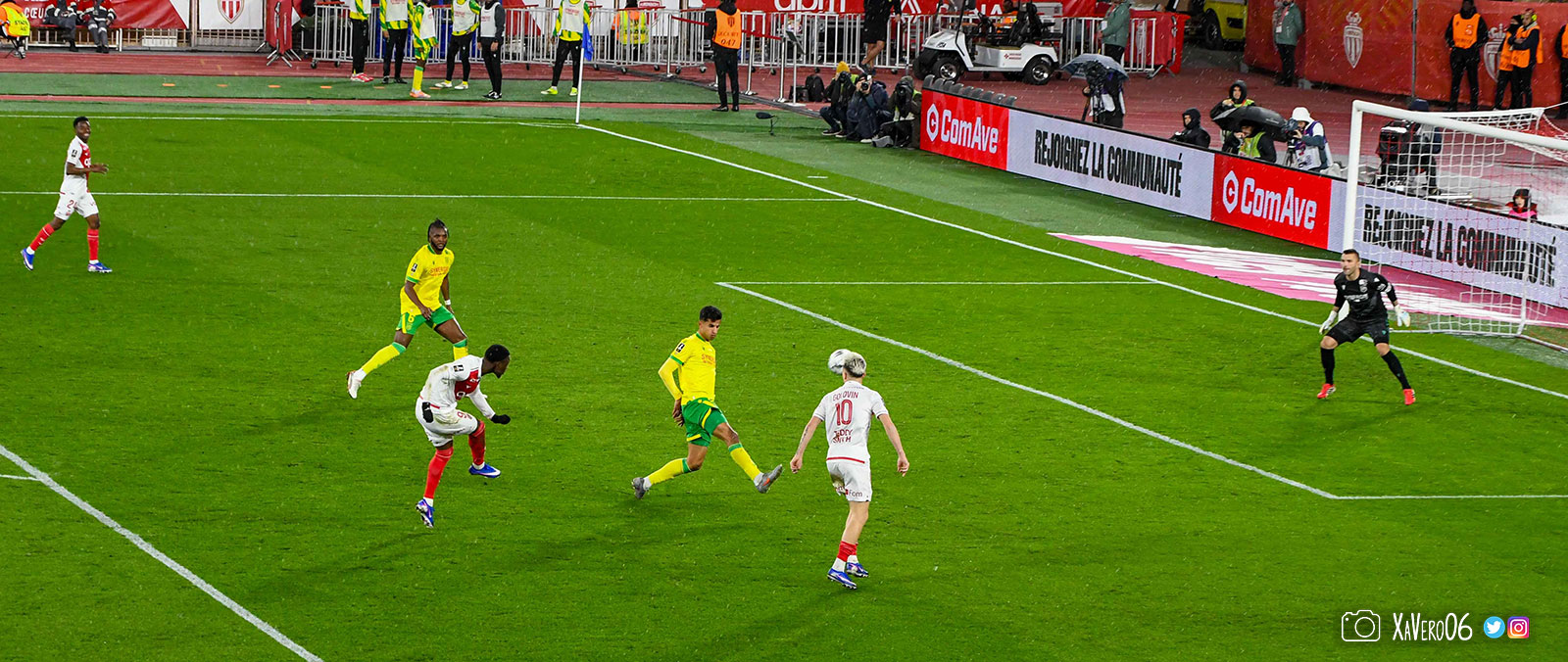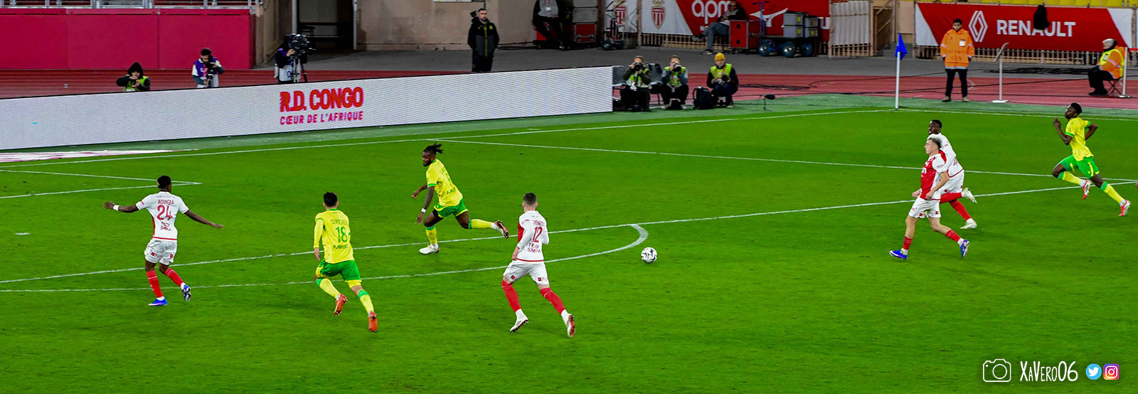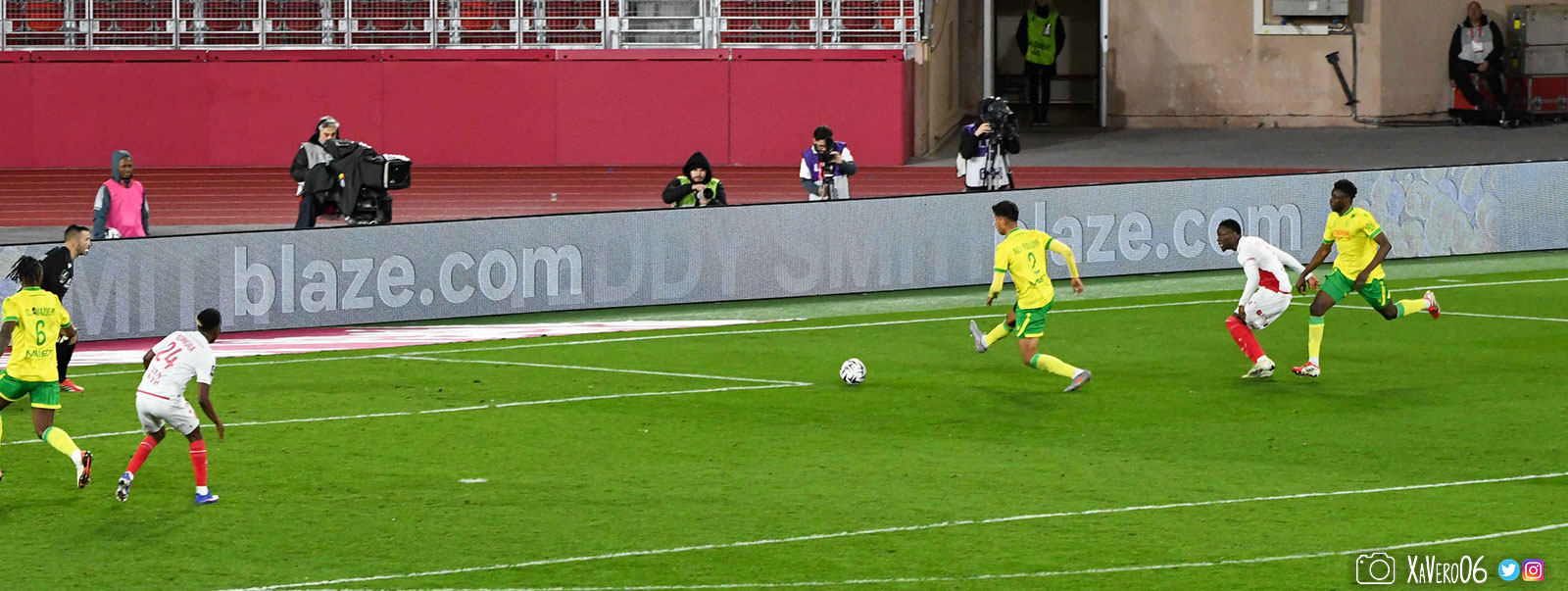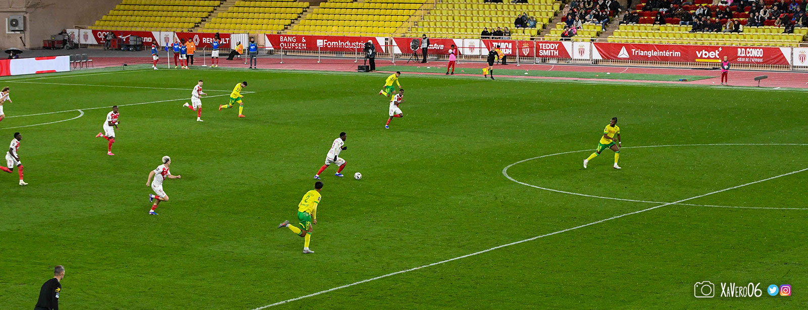 Nantes est encore gêné par le pressing et met en retrait pour sa défense aux 35m. Yousuf cherche Coquelin dans le rond central, pressé par Zakaria, qui pousse le ballon sur Golovin entre le passeur et le receveur, qui se retourne pour lancer un contre à 5 contre 2, avec Akliouche et Balogun à droite, le capitaine de l'ASM et le double buteur à gauche, avec Sylla et Yousuf au milieu.