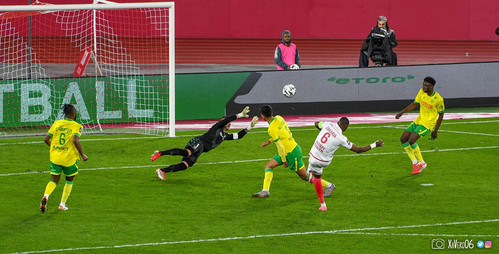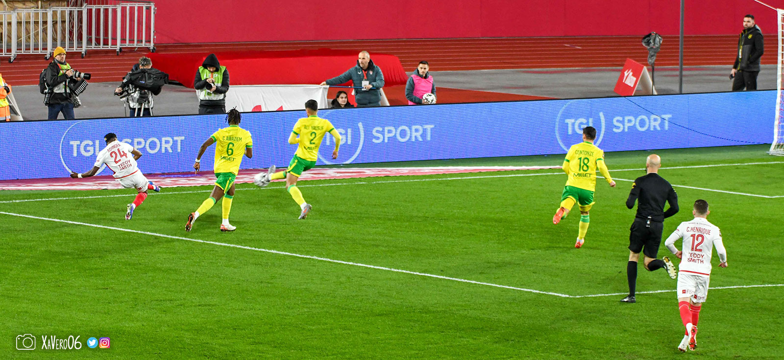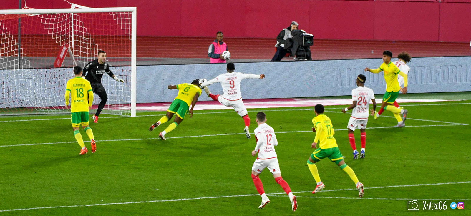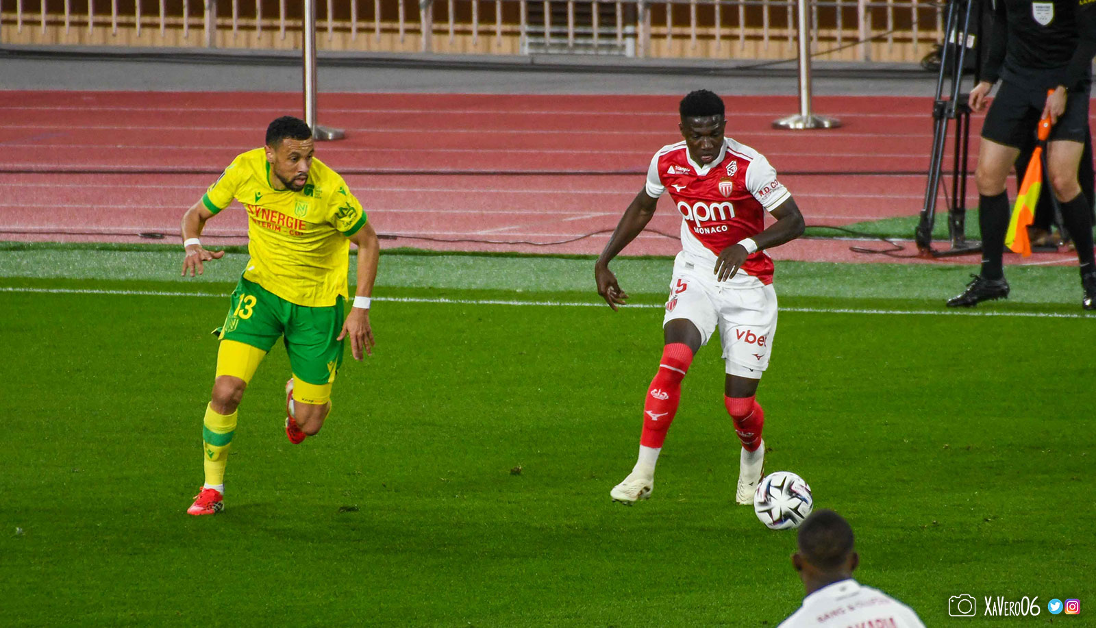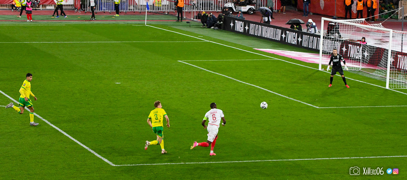 Nantes est encore gêné par le pressing et met en retrait pour sa défense aux 35m. Yousuf cherche Coquelin dans le rond central, pressé par Zakaria, qui pousse le ballon sur Golovin entre le passeur et le receveur, qui se retourne pour lancer un contre à 5 contre 2, avec Akliouche et Balogun à droite, le capitaine de l'ASM et le double buteur à gauche, avec Sylla et Yousuf au milieu.