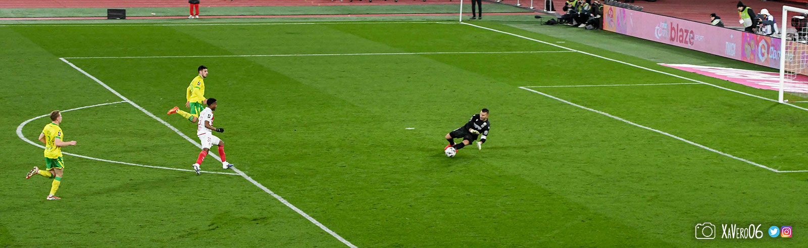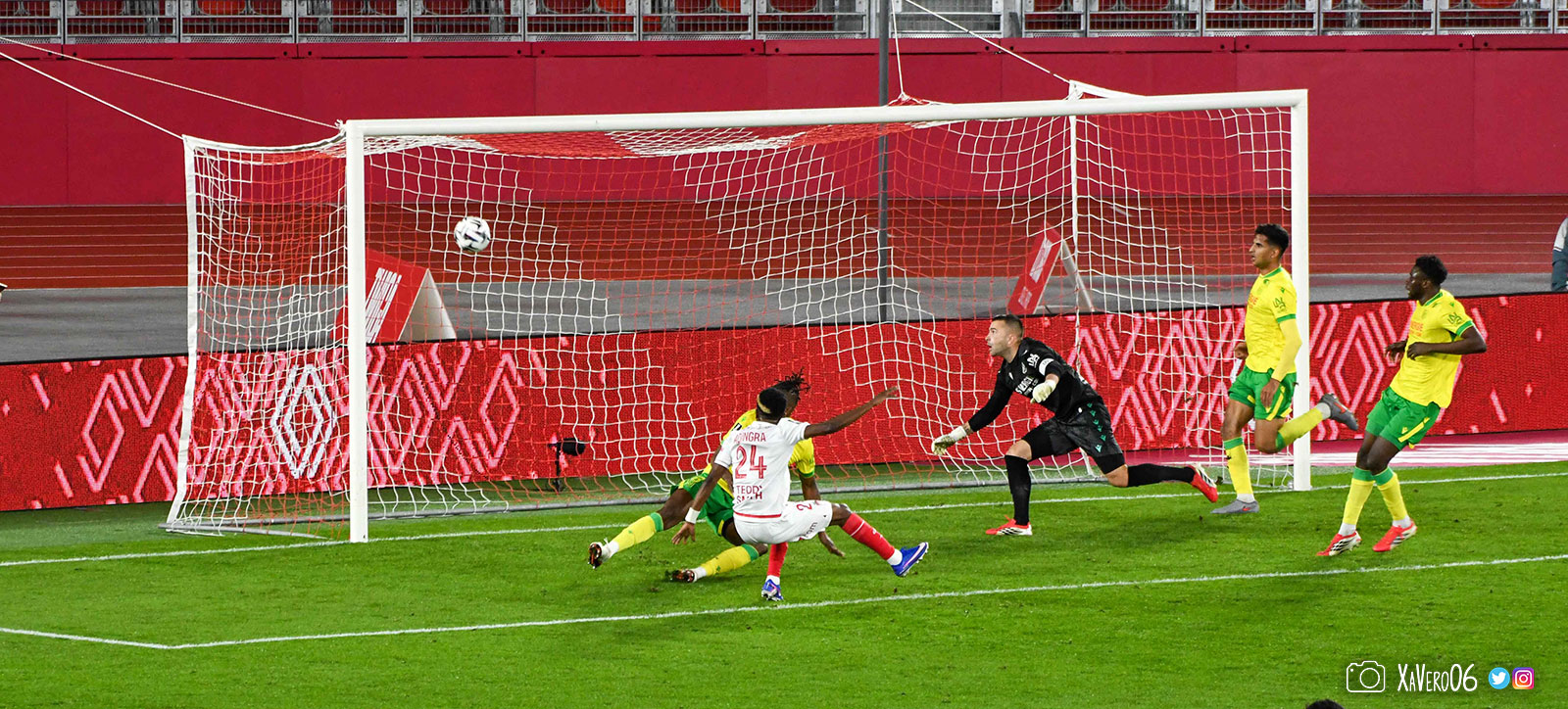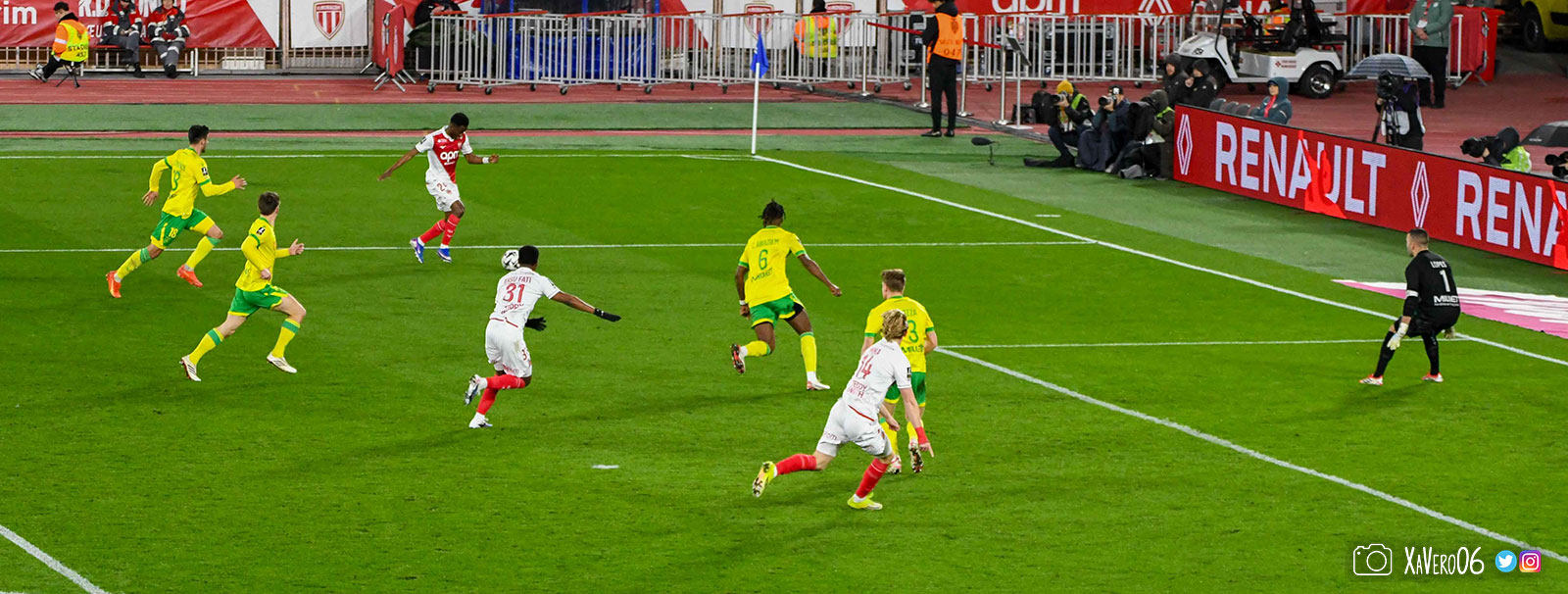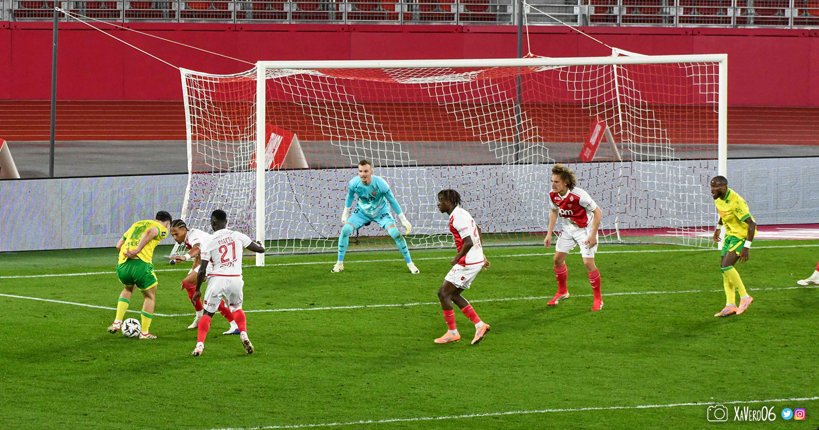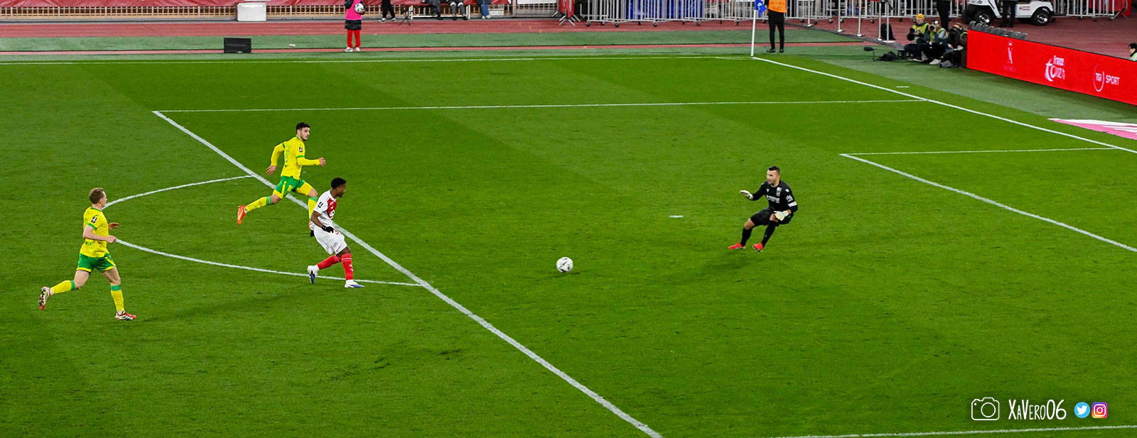 - Nantes a le ballon, fait tourner sans trouver la faille aux 25-30m. Monaco contre avec Teze dans le rond central qui met à gauche sur Simon Adingra qui efface facilement Tabibou, rentre dans la surface et met en retrait au point de pénalty où il n'y a personne car Fati et Biereth avaient fait le même appel aux 6m devant le but (82e).