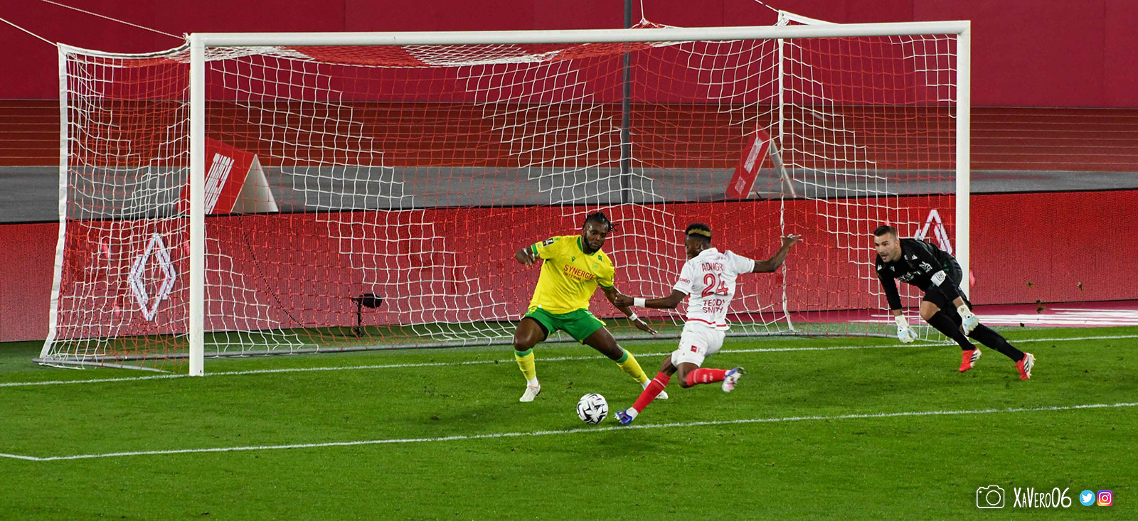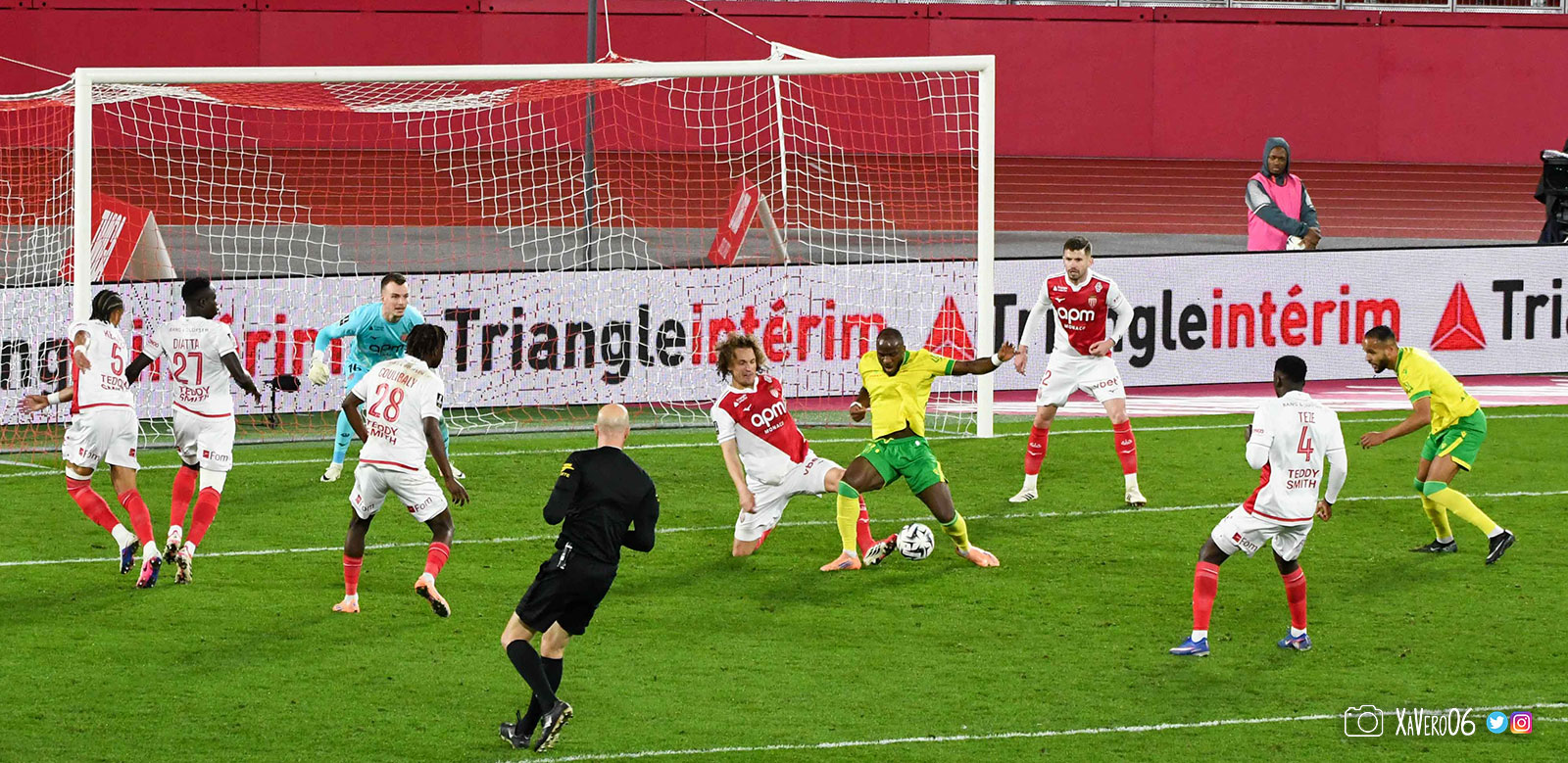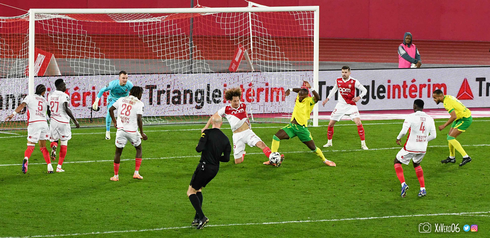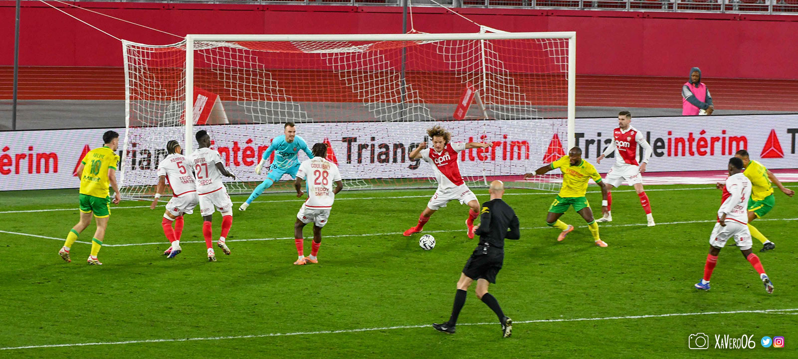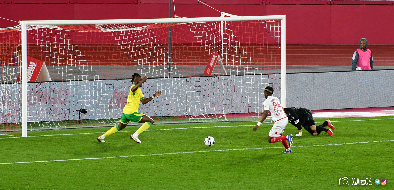 - Nantes a le ballon, fait tourner sans trouver la faille aux 25-30m. Monaco contre avec Teze dans le rond central qui met à gauche sur Simon Adingra qui efface facilement Tabibou, rentre dans la surface et met en retrait au point de pénalty où il n'y a personne car Fati et Biereth avaient fait le même appel aux 6m devant le but (82e).