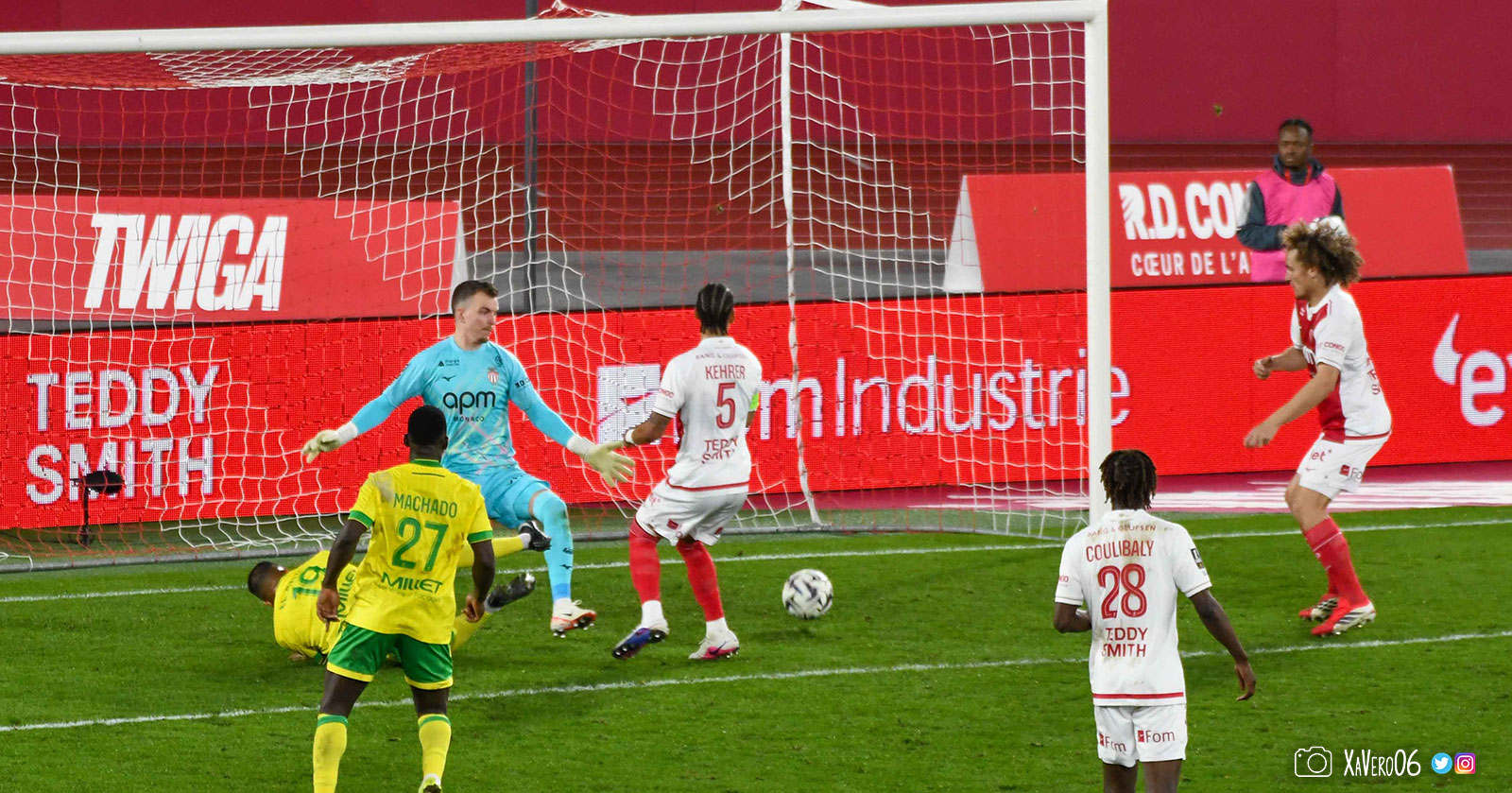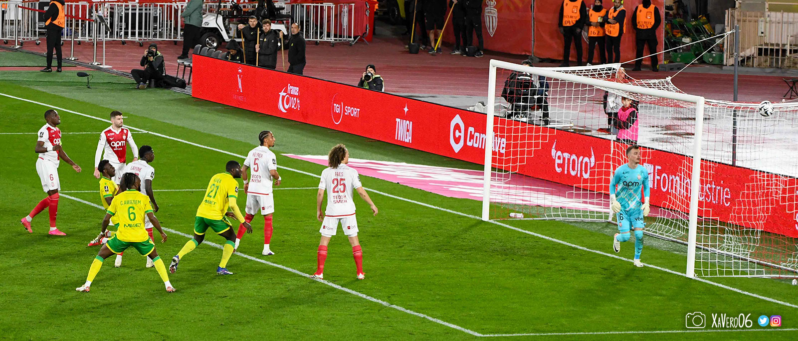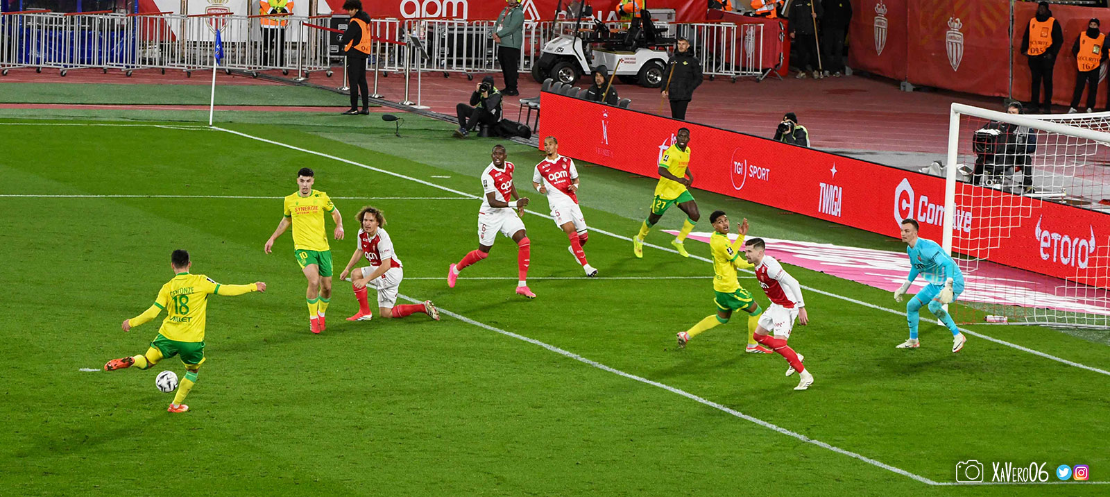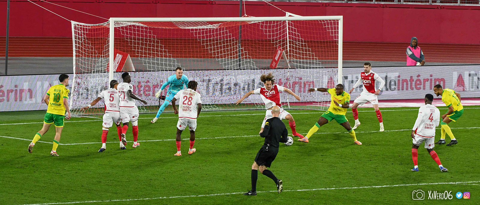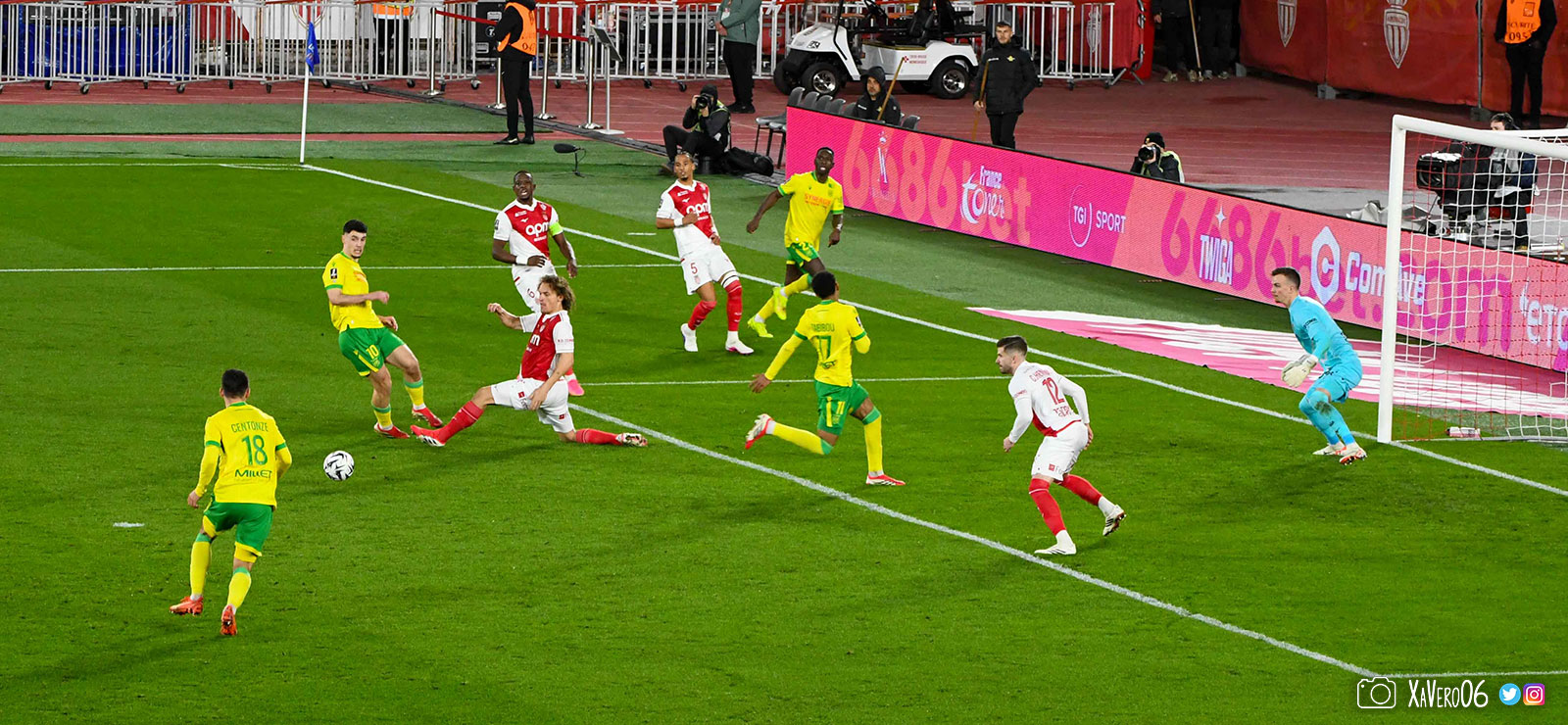 - Nantes a le ballon, fait tourner sans trouver la faille aux 25-30m. Monaco contre avec Teze dans le rond central qui met à gauche sur Simon Adingra qui efface facilement Tabibou, rentre dans la surface et met en retrait au point de pénalty où il n'y a personne car Fati et Biereth avaient fait le même appel aux 6m devant le but (82e).