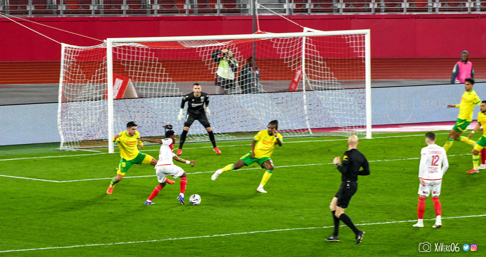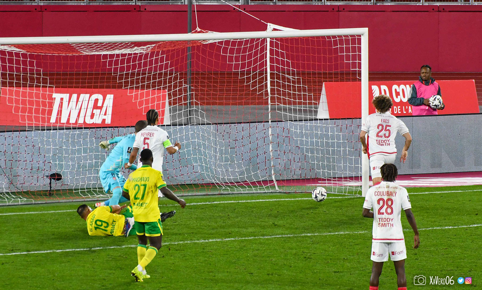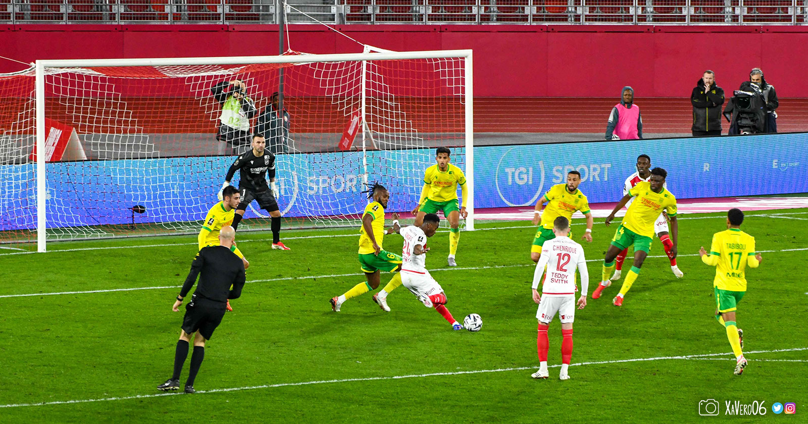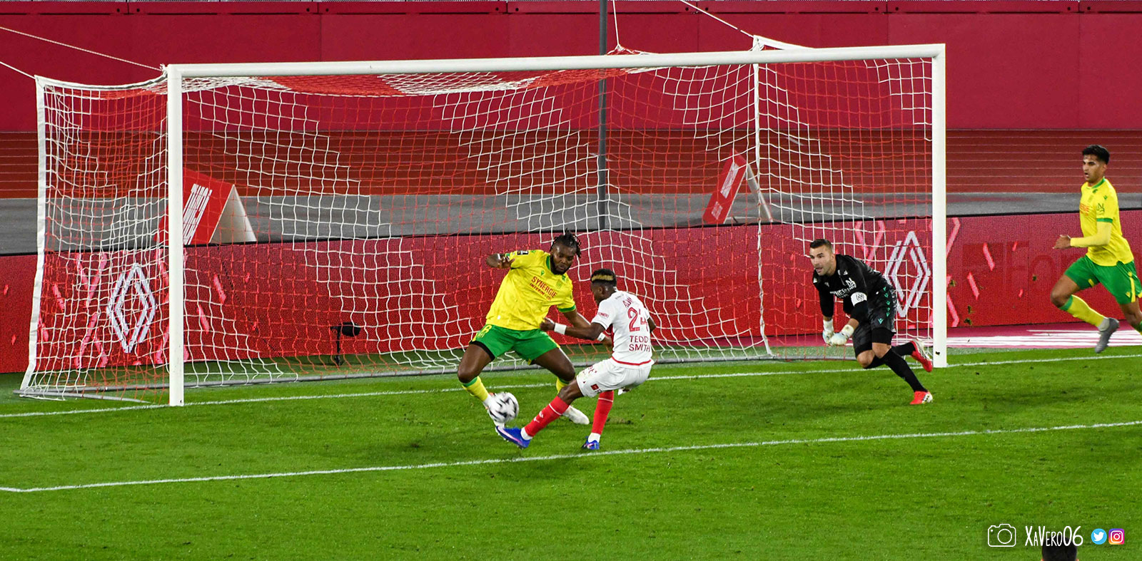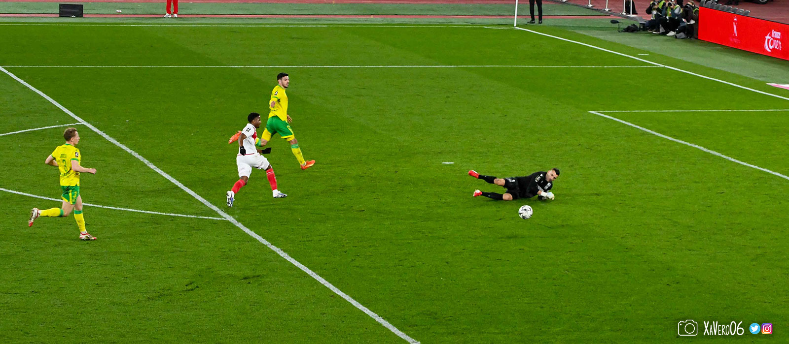 - Nantes a le ballon, fait tourner sans trouver la faille aux 25-30m. Monaco contre avec Teze dans le rond central qui met à gauche sur Simon Adingra qui efface facilement Tabibou, rentre dans la surface et met en retrait au point de pénalty où il n'y a personne car Fati et Biereth avaient fait le même appel aux 6m devant le but (82e).