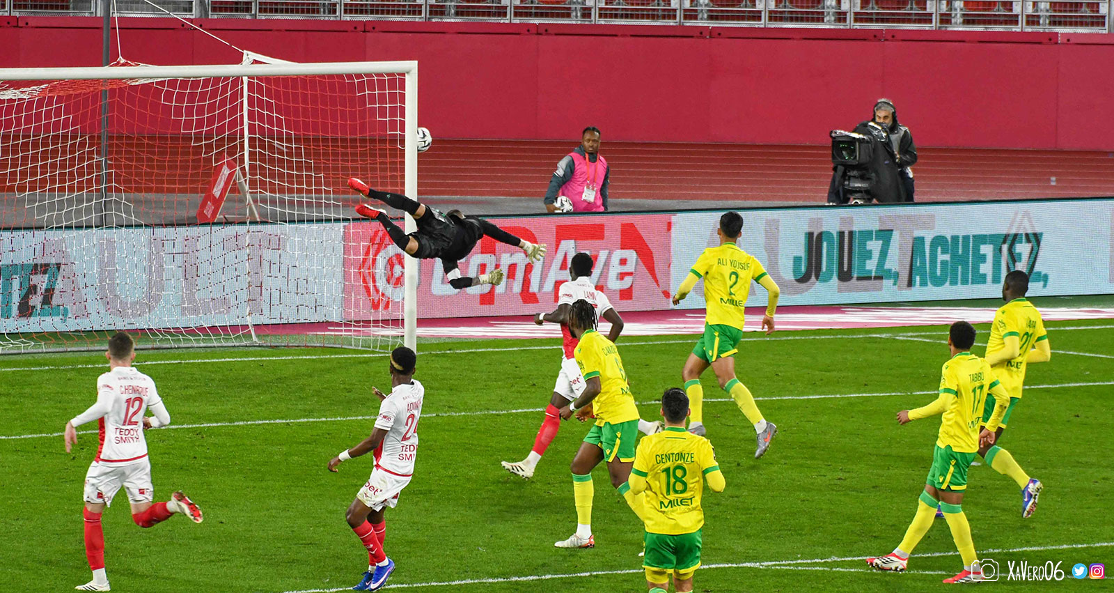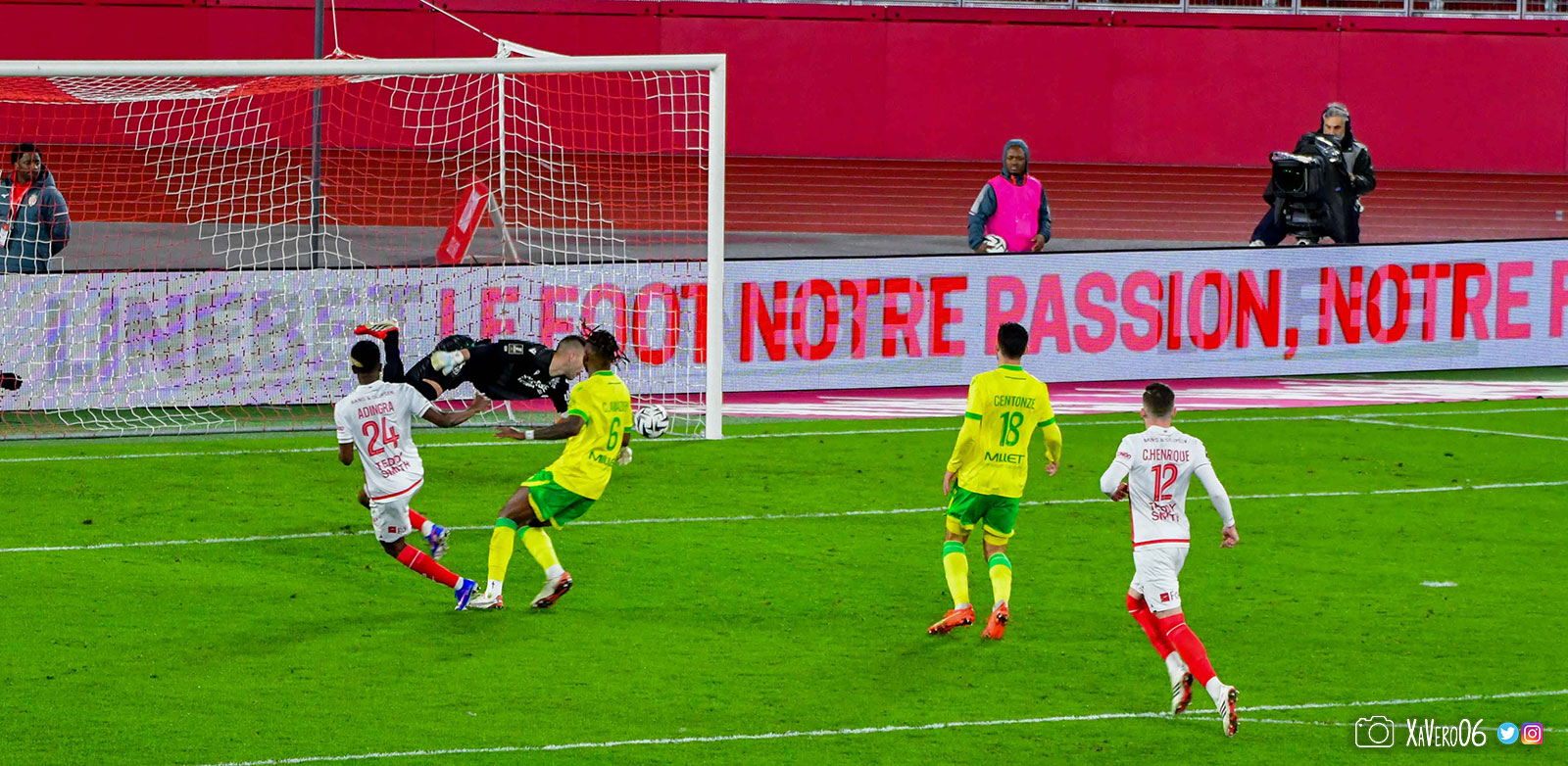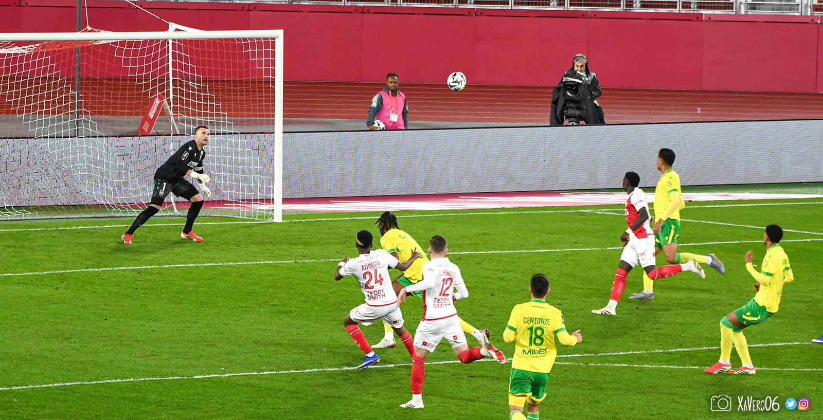 - Côté droit, Akliouche arrive à donner le ballon pour Golovin dans l'axe, qui donne pour Caio sur sa gauche aux 25m qui s'avance tranquillement face au bloc nantais pour donner à Adingra sur la gauche de la surface. Contrôle pour se défaire de Centonze, corchet pour s'éloigner d'Awaziem et frappe, détournée par Yousuf. Corner (40e).