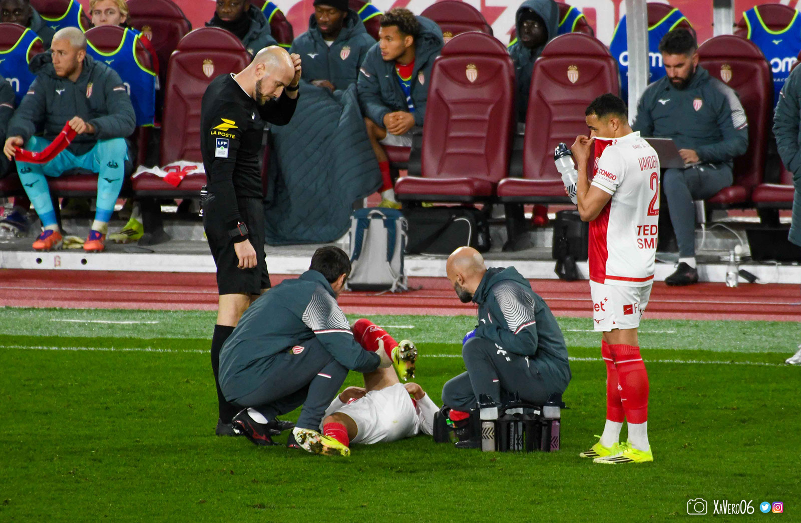Maghnes Akliouche est resté au sol, les soigneurs sont venus le voir et il demande à sortir (41e).