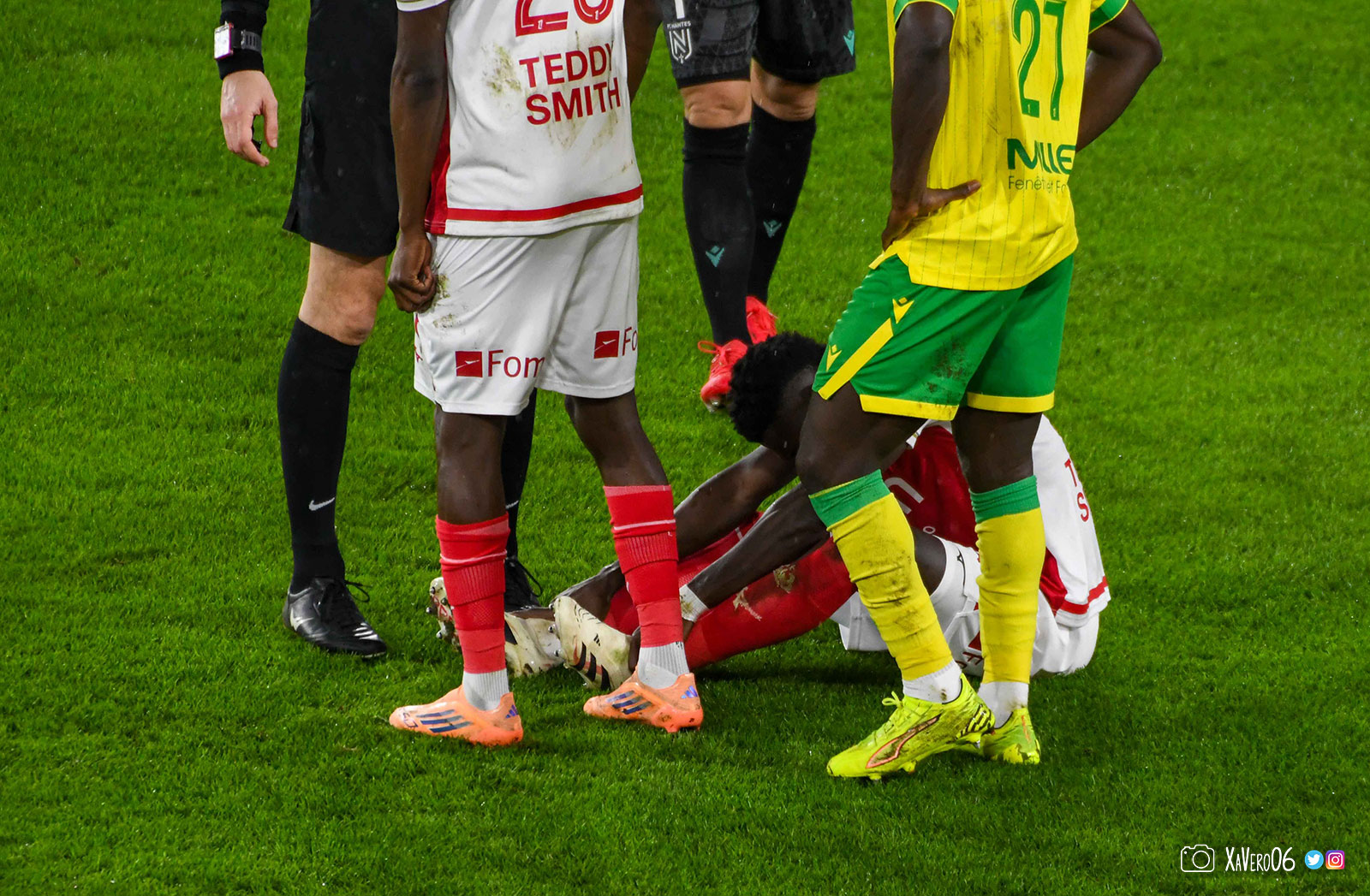 Récupération haute monégasque avec Fati qui vient contester dans les pieds de Kaba qui reste au sol, Golovin récupère et cherche à jouer dans la profondeur pour Balogun, mais est contré par Awaziem, et réclame une main. L'arbitre arrête le jeu, mais pour venir voir le nantais resté au sol.