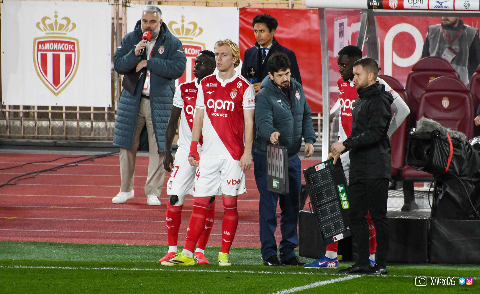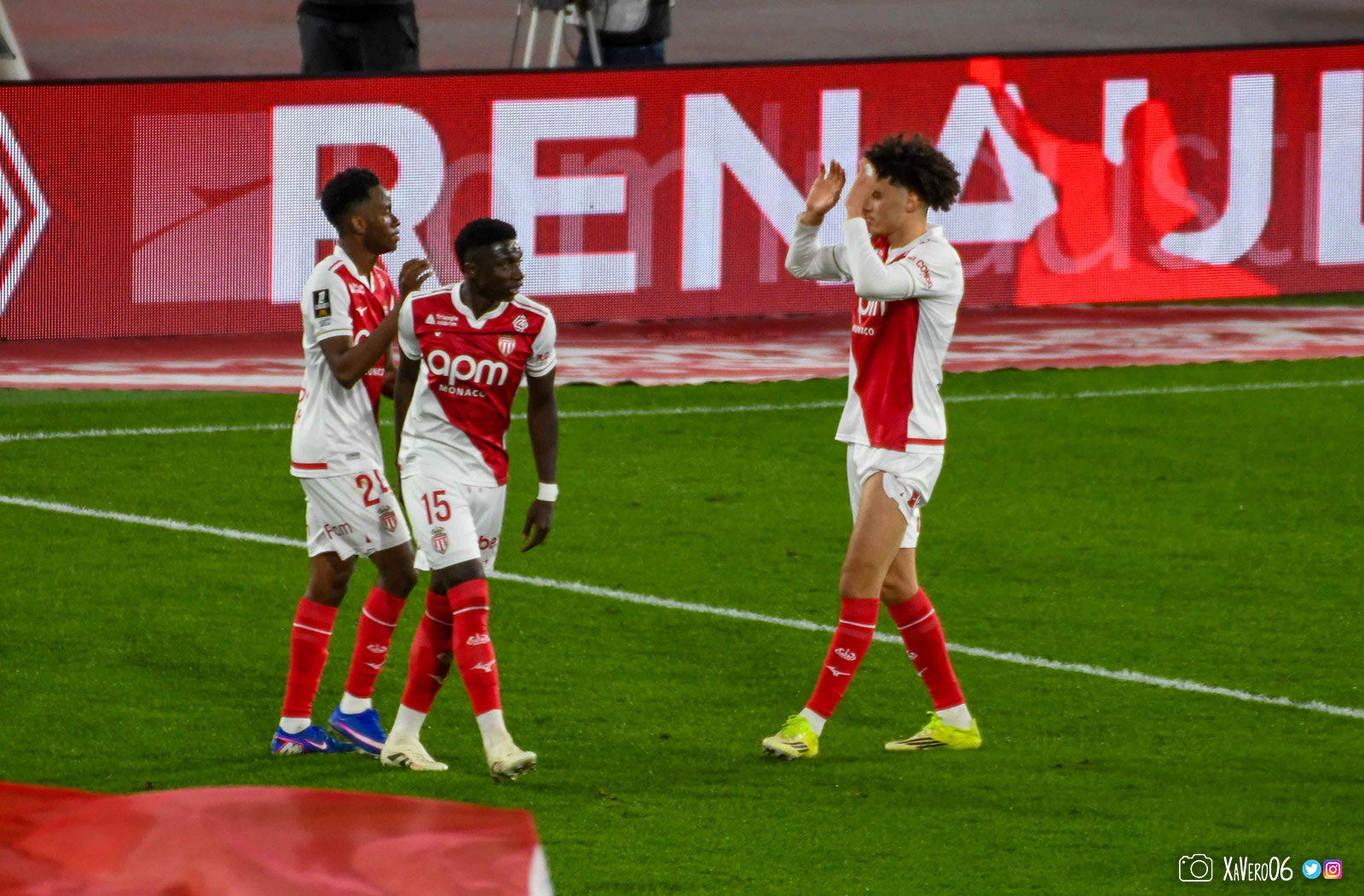 Fort de ses 3 buts d'avance, Monaco baisse de rythme, avec un Akliouche qui se plaint de son genou gauche depuis la 10ème minute, après avoir été pris à contre-pied sur une passe avec un pied d'appui qui avait glissé sur la pelouse humide.