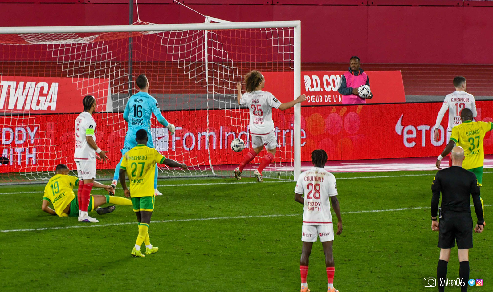 - Coup-franc axial dans le camp nantais avec un long ballon mis dans la profondeur pour Abline, parti dans le dos de Faes. Après un rebond aux 20m, l'ancien rémois est le mieux placé et décide de mettre en retrait de la tête pour son gardien qui s'est avancé, et ne lui met pas dessus. Köhn est obligé de retourner vers son poteau droit pour capter le ballon (15e).
