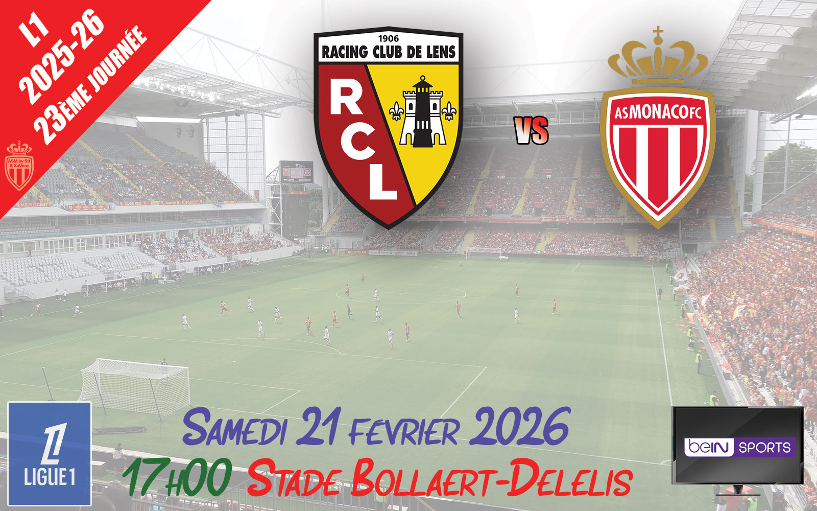 Pour la 23ème journée de Ligue 1, l'AS Monaco (8ème) se rend chez le RC Lens (1er).