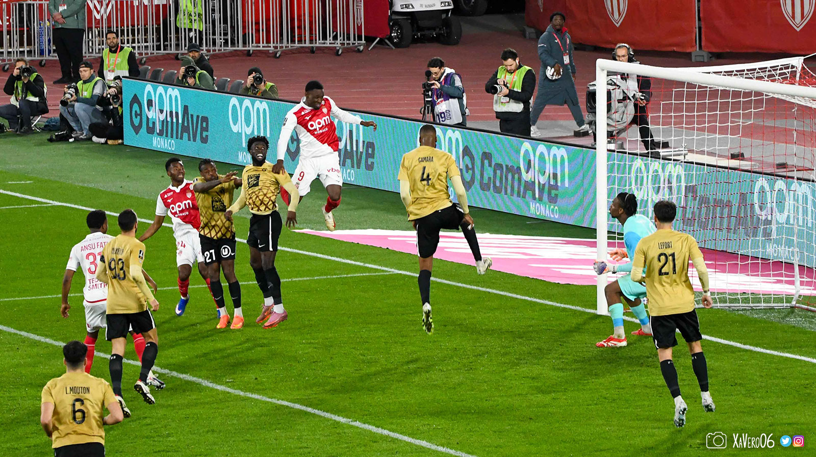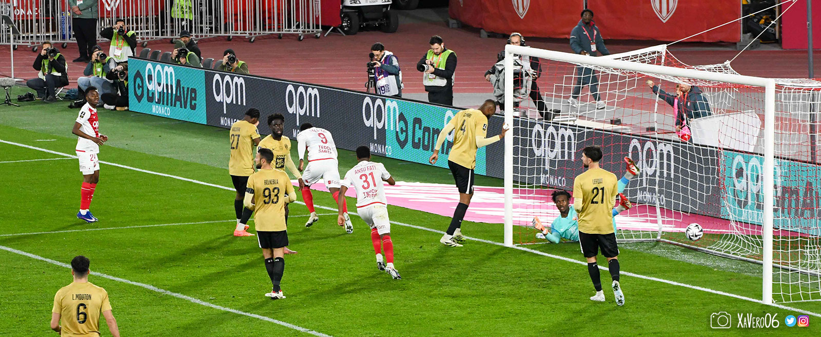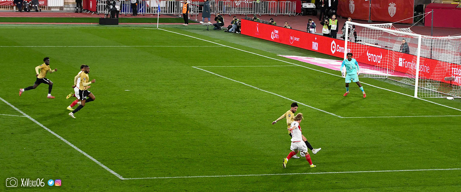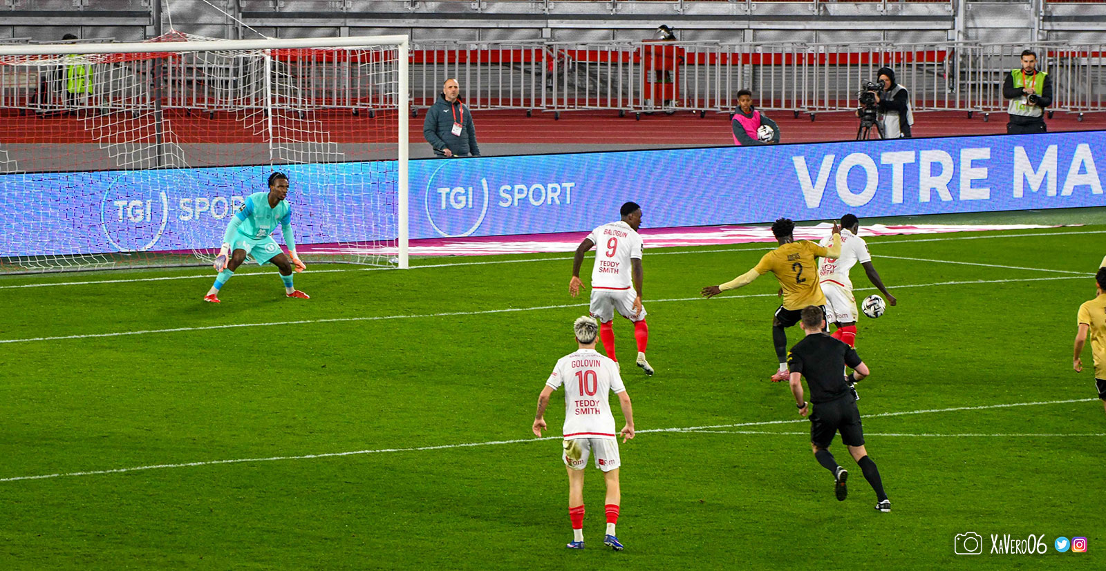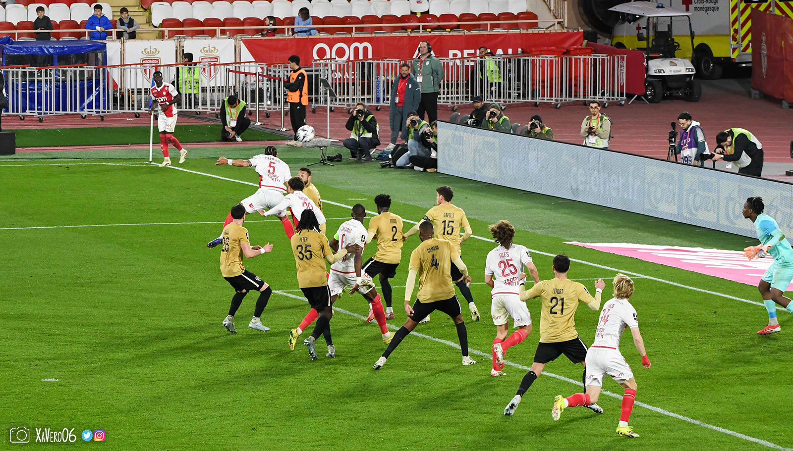 Corner monégasque, raté par Camara. Sur sa deuxième chance, Pona boxe le ballon et Raolisoa récupère et accélère côté gauche, bloqué par Golovin le long de la touche, mais il revient sur son pied droit et centre dans l'axe pour Belkhdim, oublié au marquage par Adingra qui lui court 3m derrière.