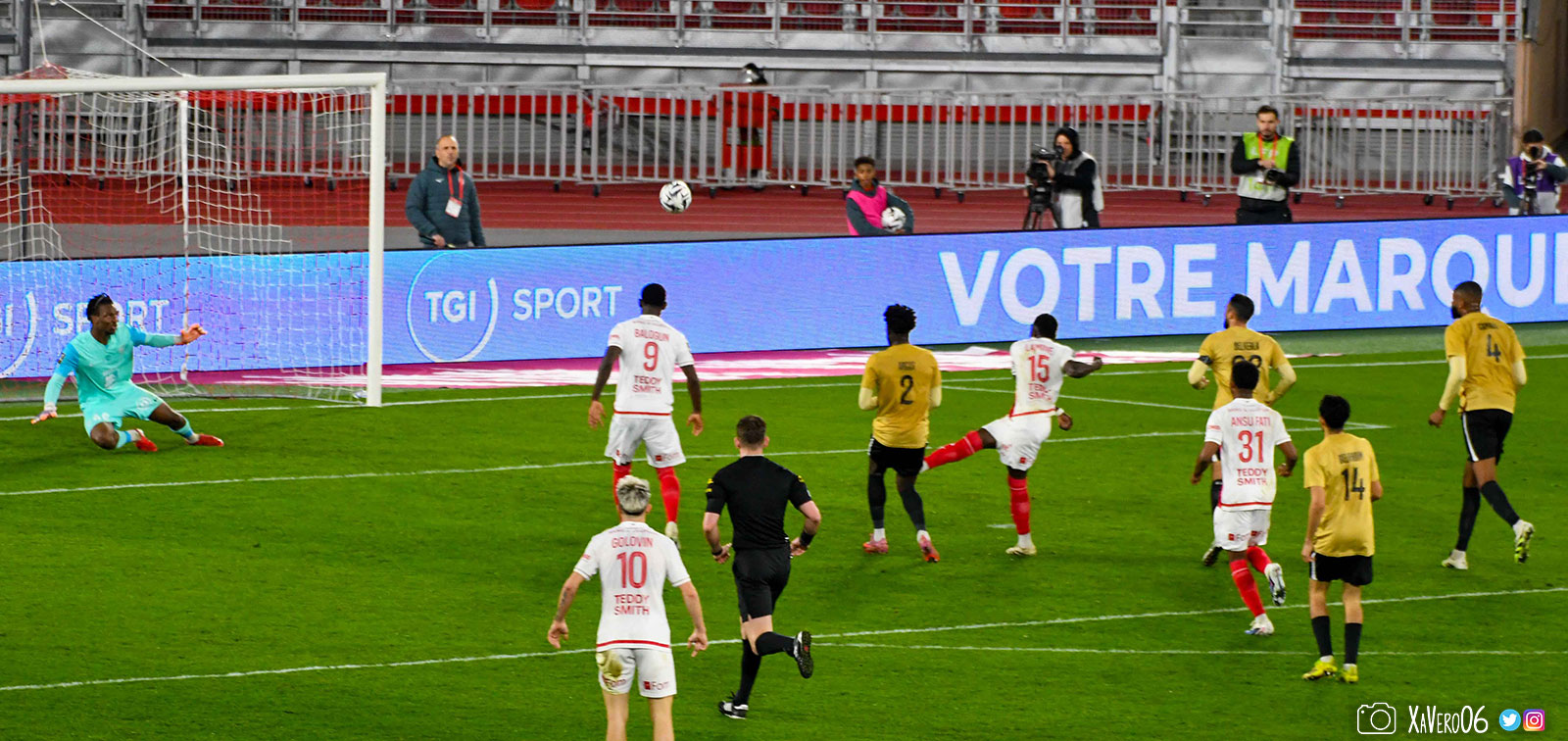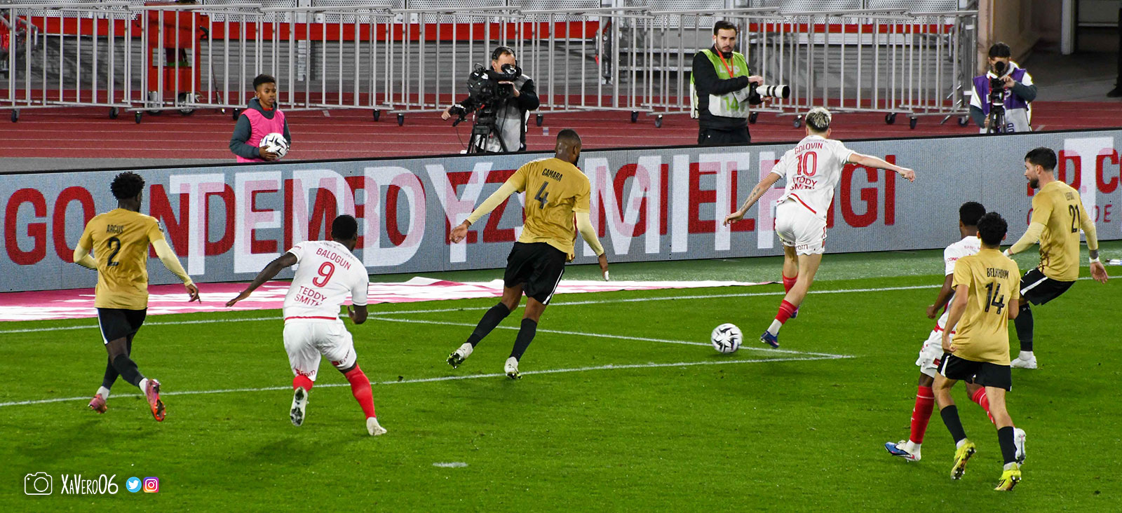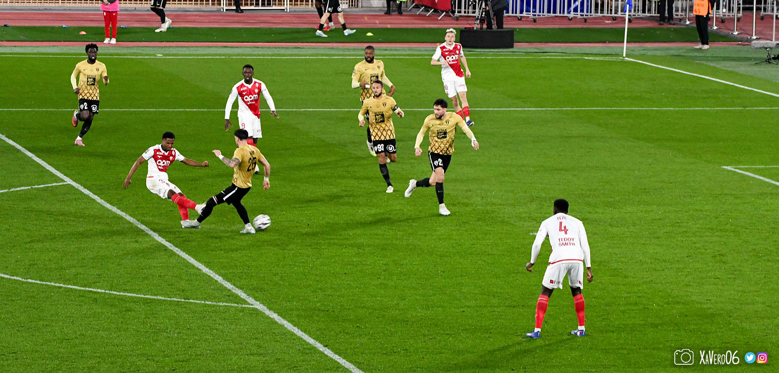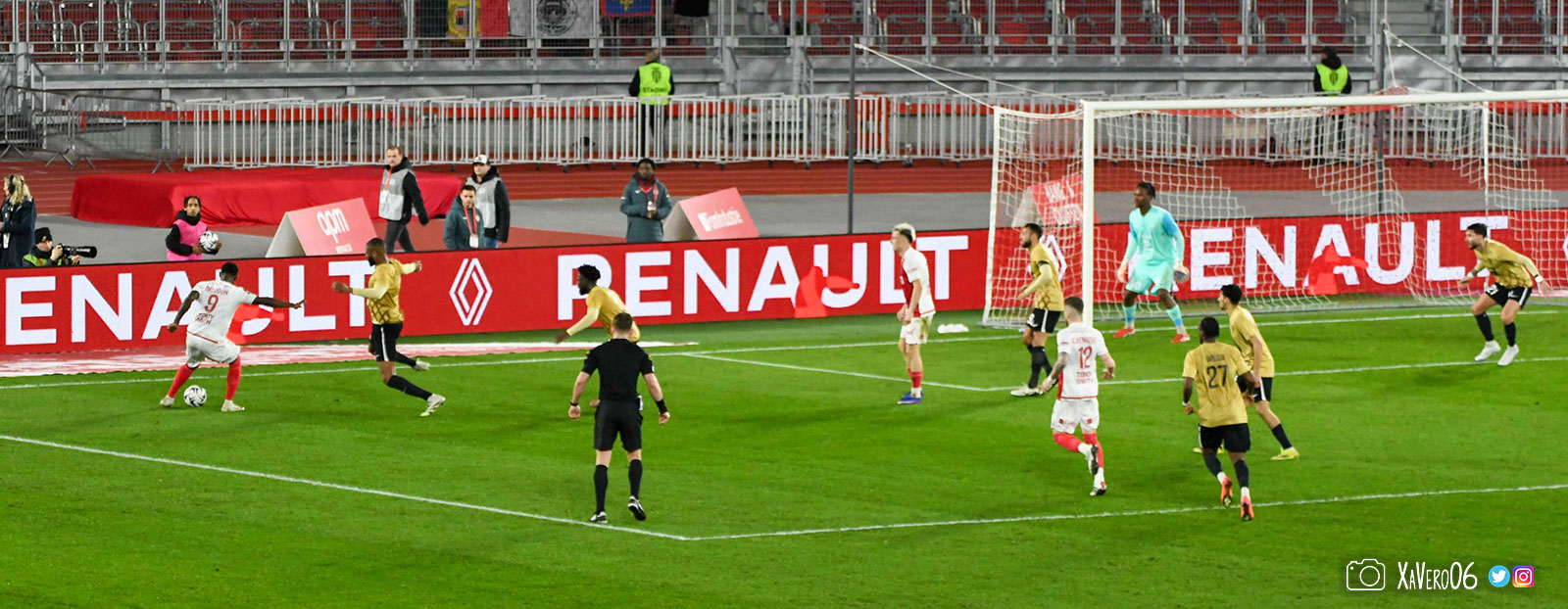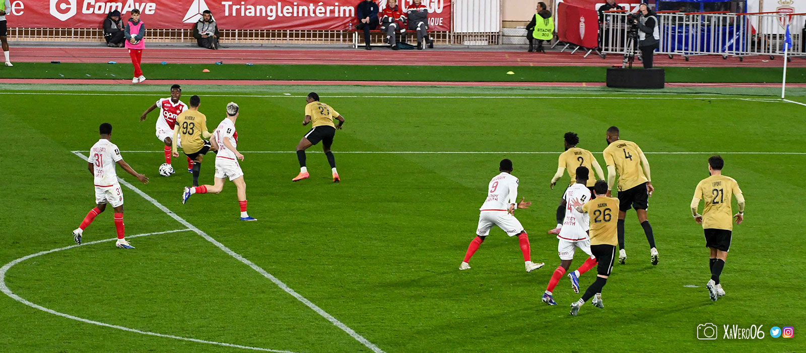 Corner monégasque, raté par Camara. Sur sa deuxième chance, Pona boxe le ballon et Raolisoa récupère et accélère côté gauche, bloqué par Golovin le long de la touche, mais il revient sur son pied droit et centre dans l'axe pour Belkhdim, oublié au marquage par Adingra qui lui court 3m derrière.
