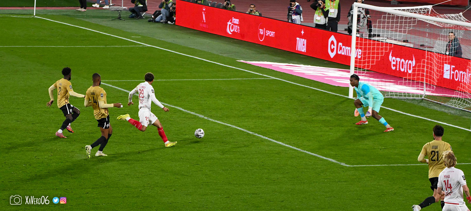 Surnombre apporté par Zakaria qui vient côté gauche pour jouer avec Adingra, qui voit l'appel de Golovin, qui dévie pour Balogun à l'entrée de la surface côté gauche. Il doit attendre le ballon et se retourne, voyant Ansu Fati seul dans l'arc de cercle face au but, qui contrôle et écrasé sa frappe à ras de terre que Pona capte facilement sur sa ligne, oubliant Jordan Teze tout seul sur la droite dans la surface (47e).