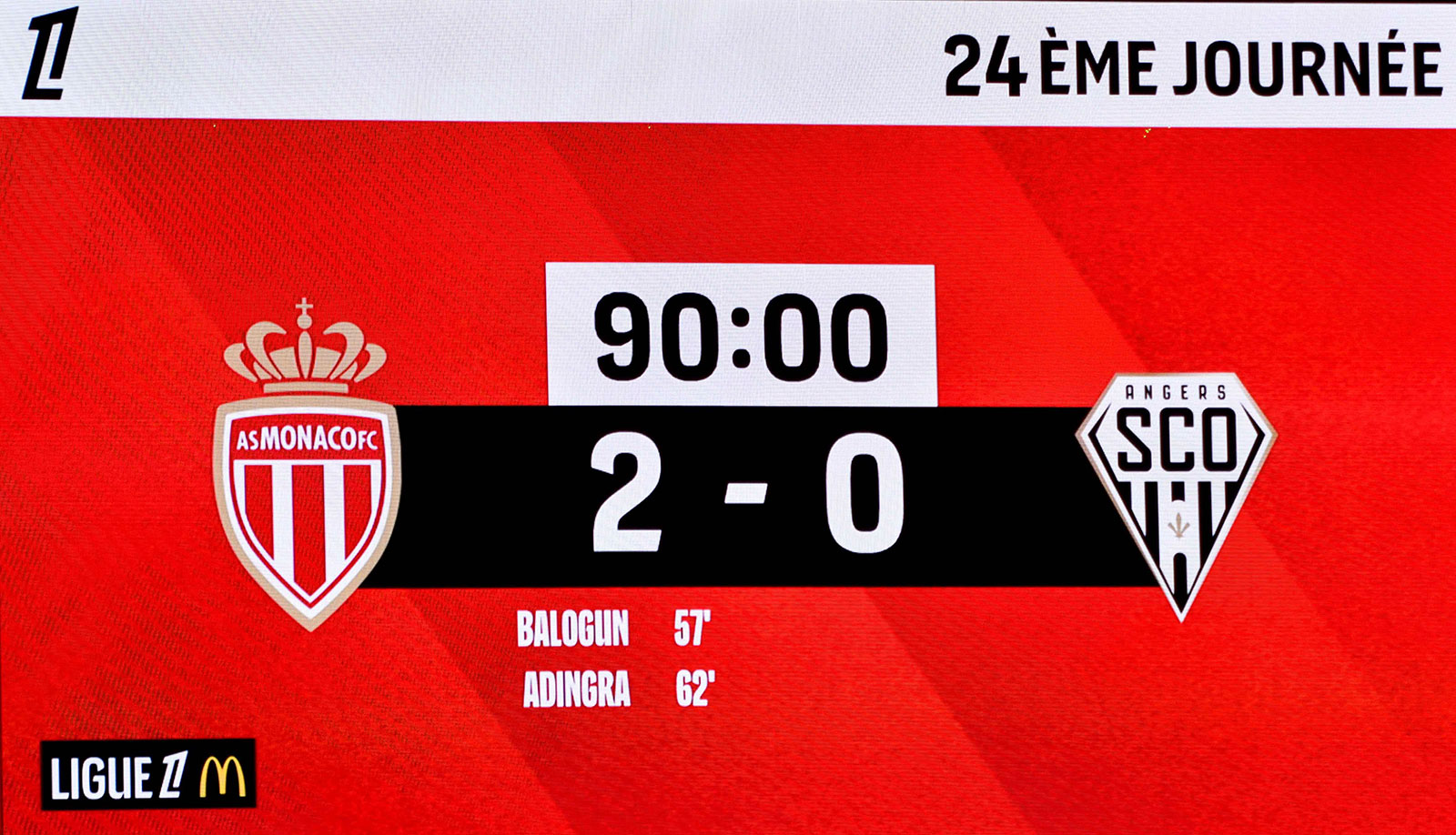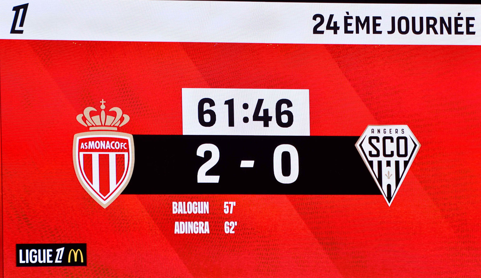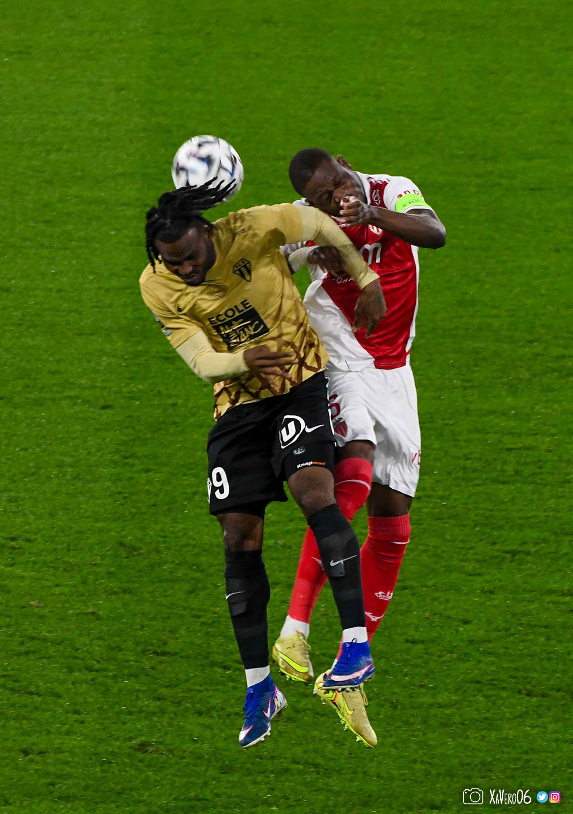 - Aladji Bamba tente de surprendre la défense angevine d'une balle croisée dans la profondeur pour Balogun et dans le dos de Lefort. Pona sort de son but et vient se coucher devant le buteur monégasque (12e).