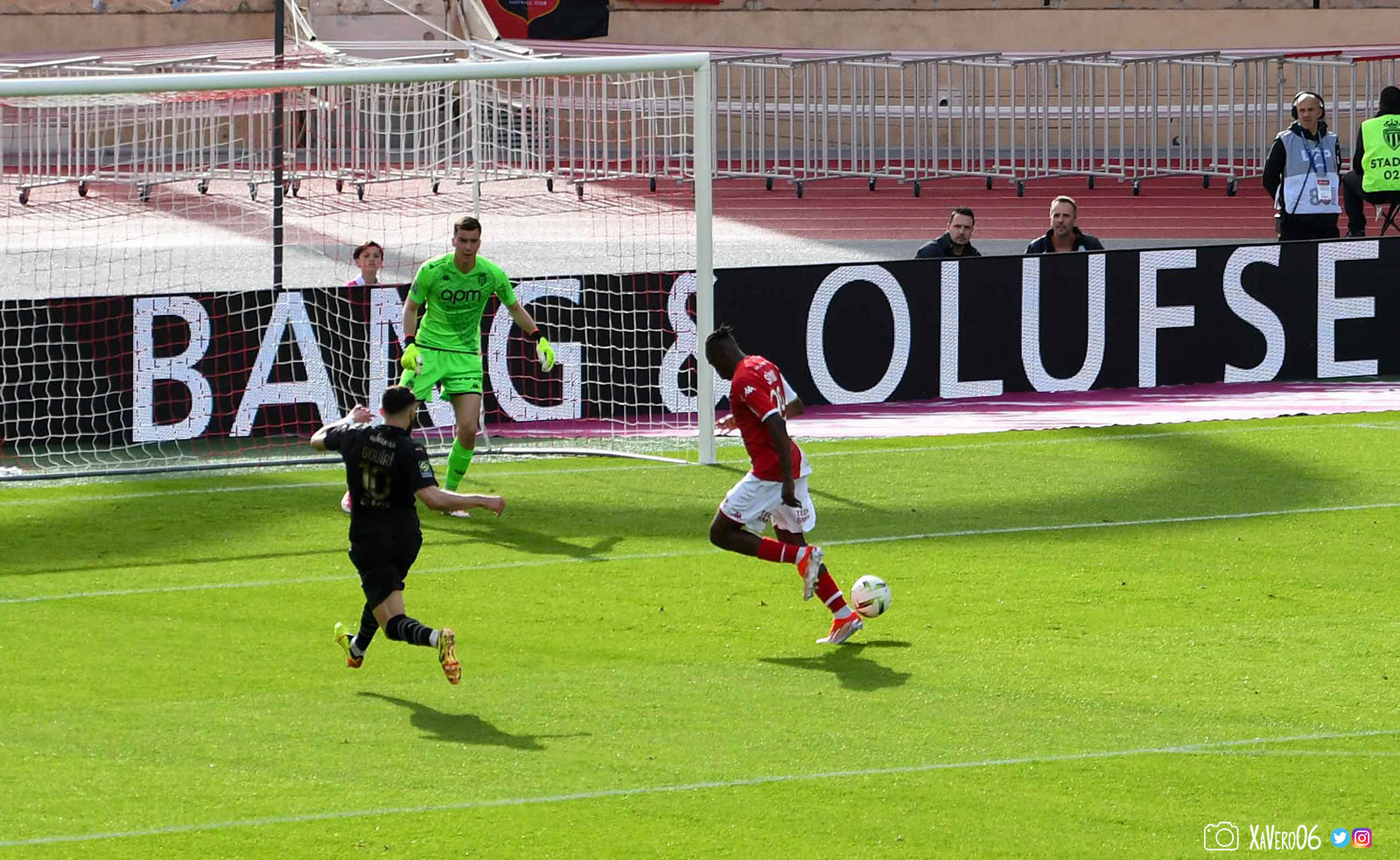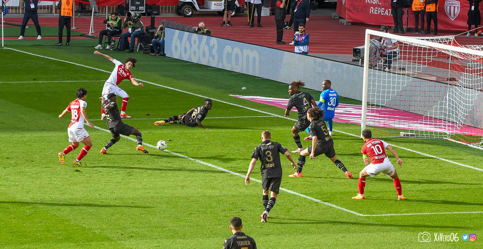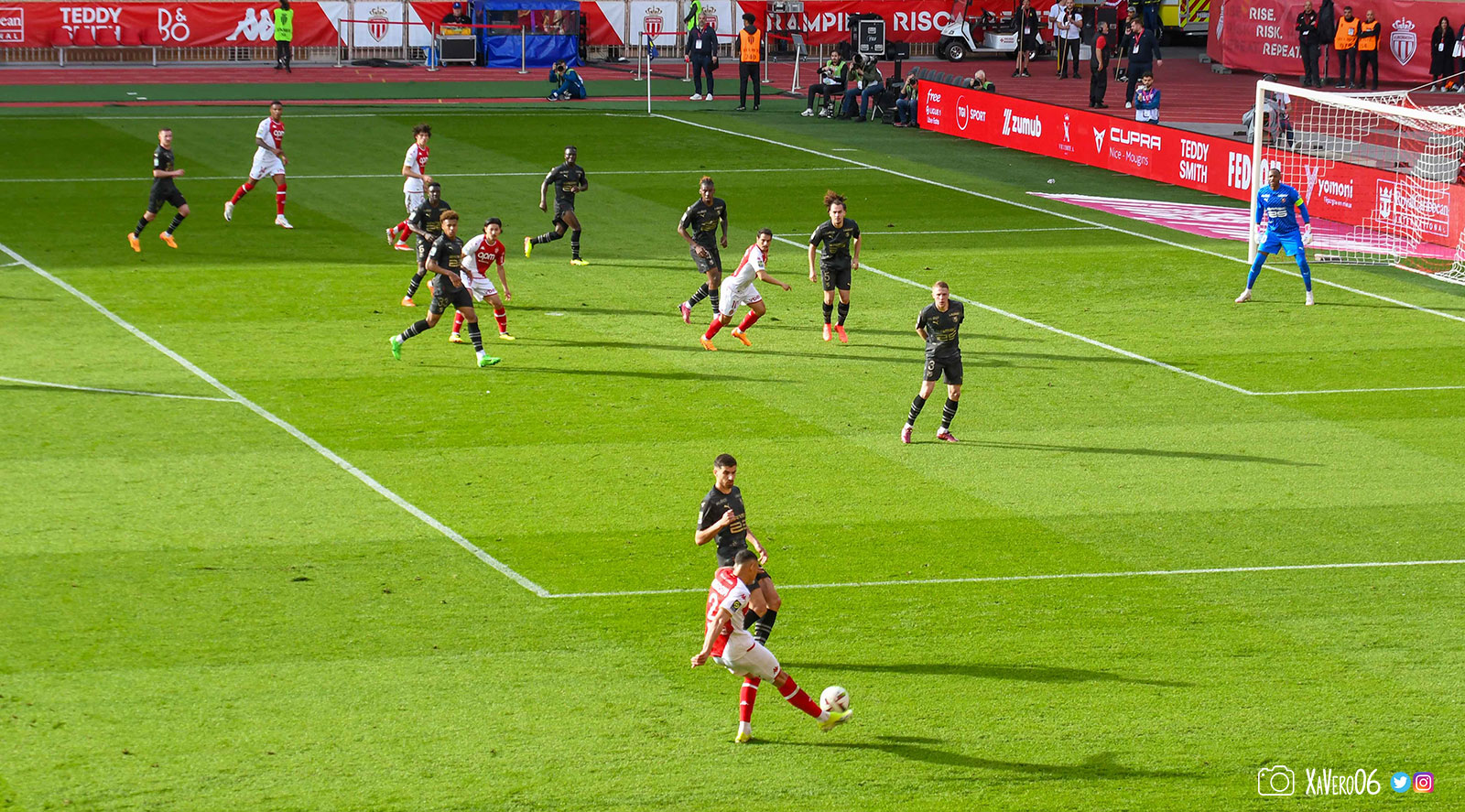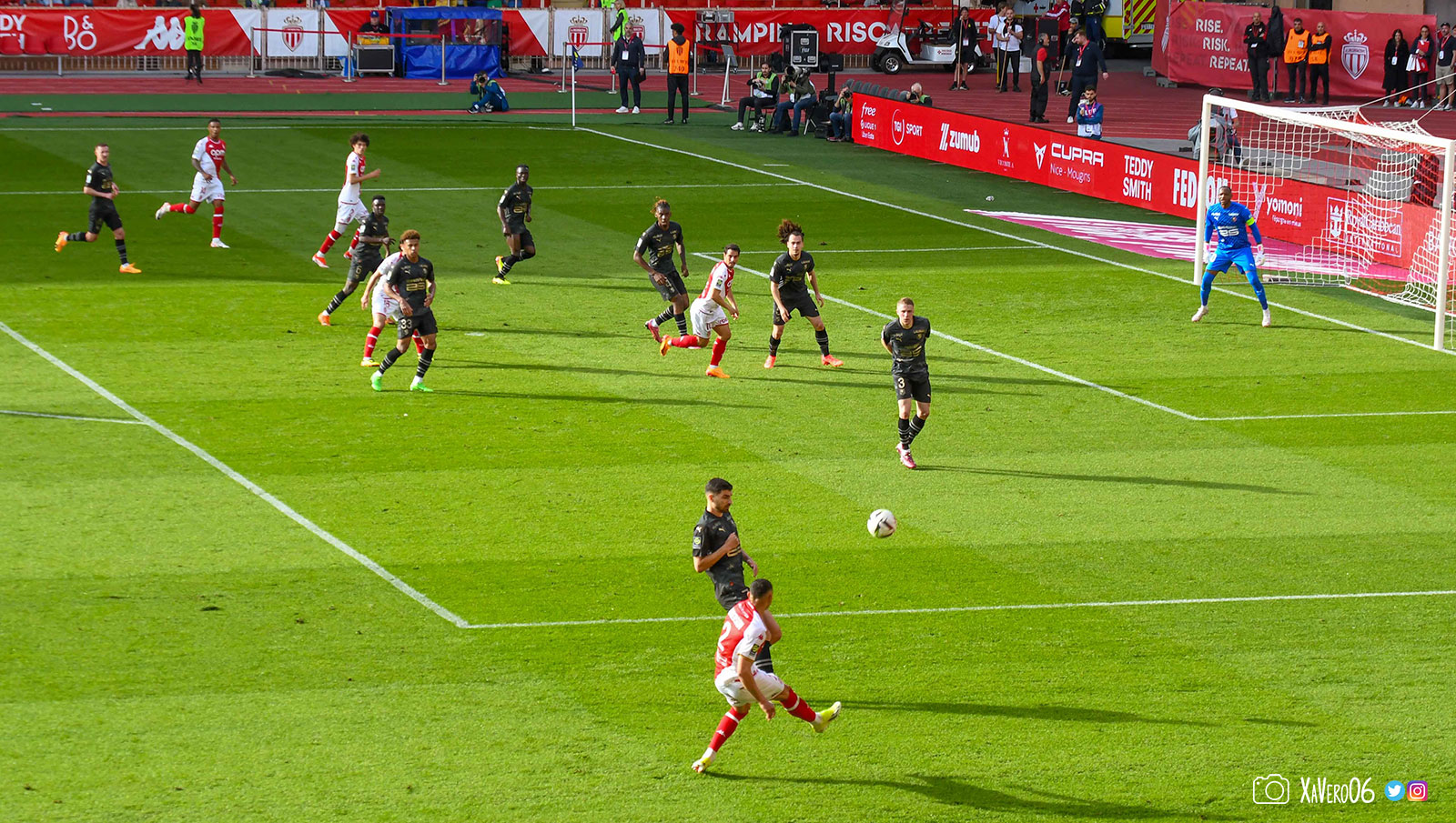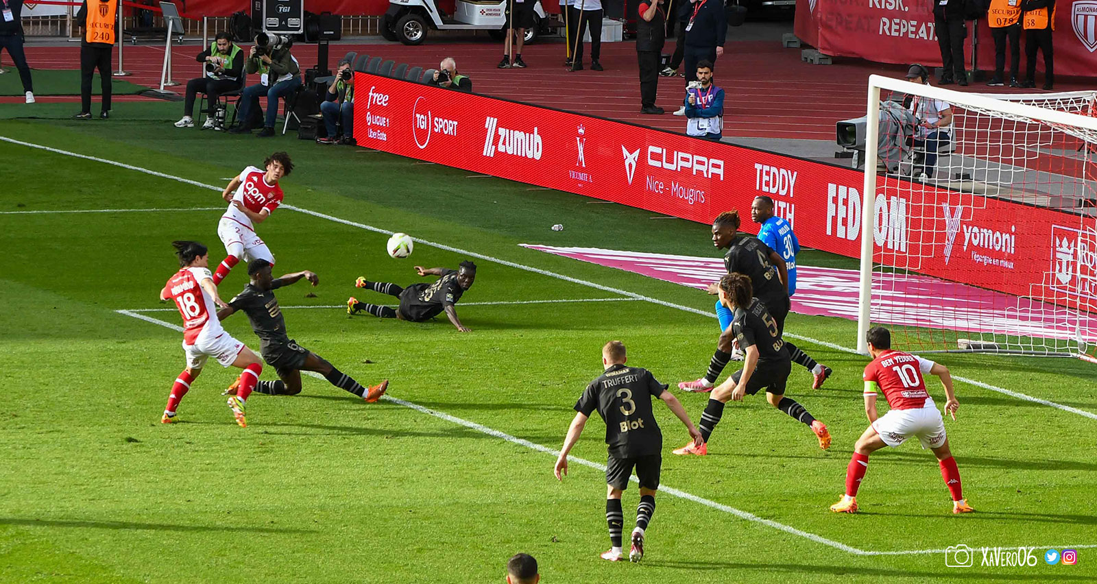 Attaque de l'ASM, avec un centre de Vanderson côté droit. Seidu est trop court au second poteau et prolonge du crâne derrière lui, sur Akliouche à l'angle des 6m, qui contrôle, feinte la frappe en centrant en retrait pour Minamino devancé par le tacle de Matusiwa. Corner (45e+1).