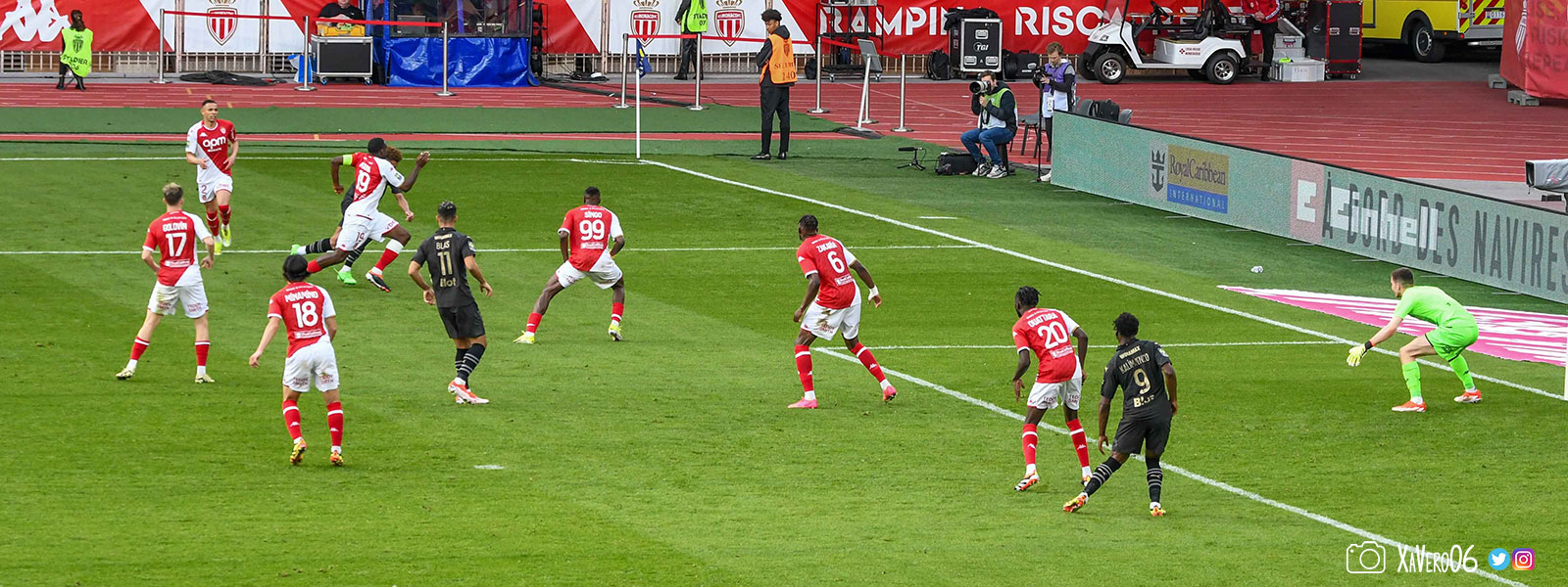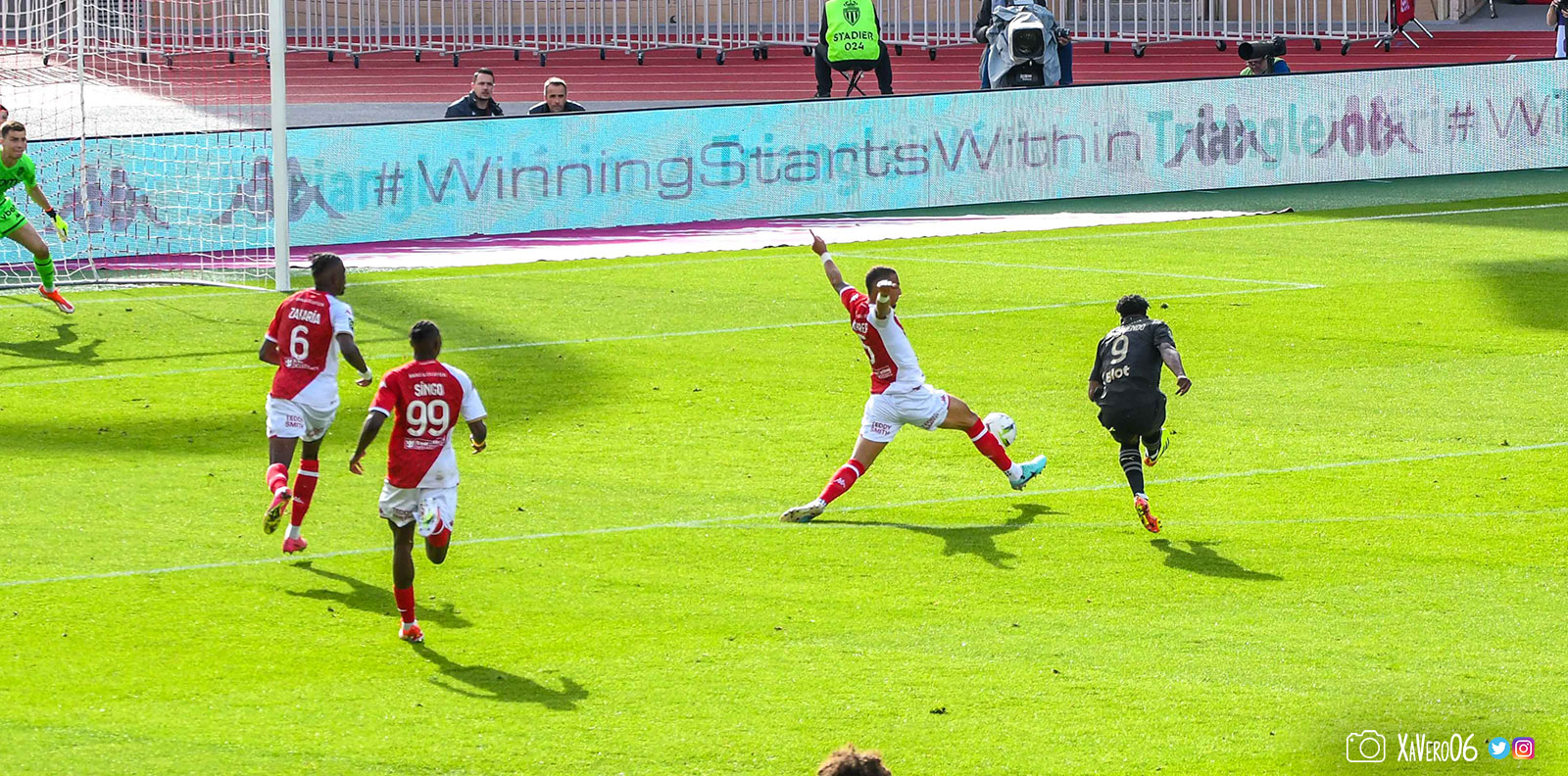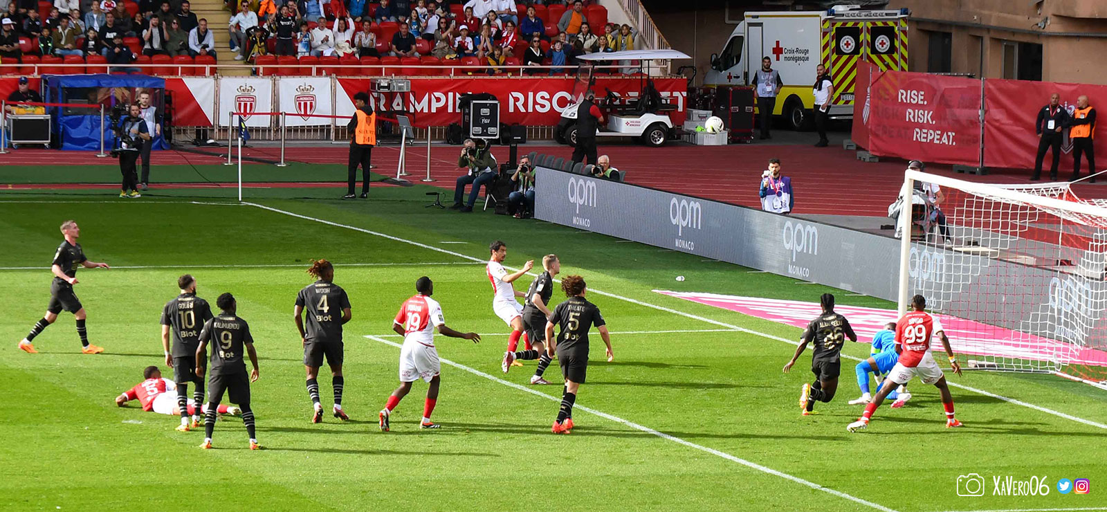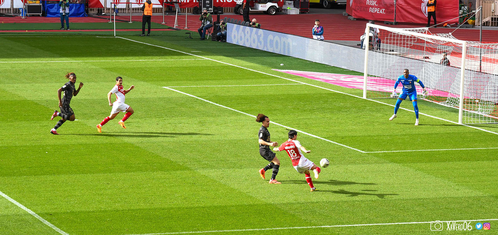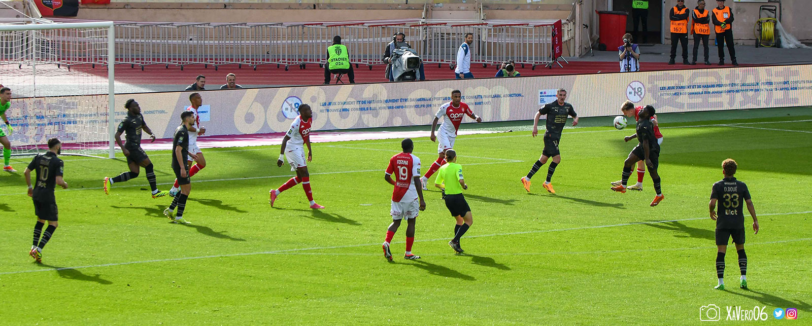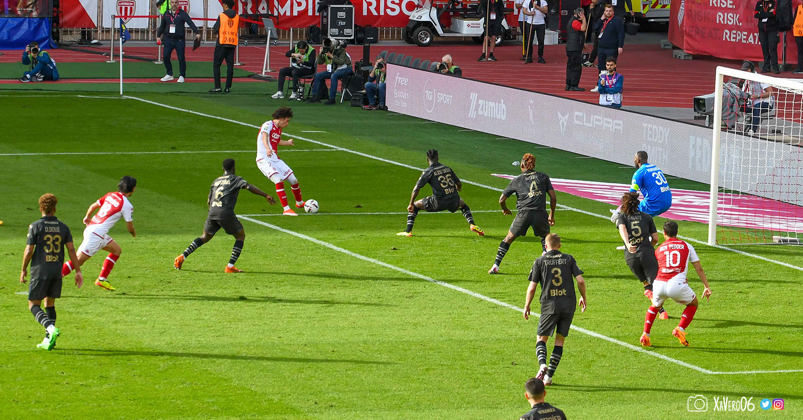 Attaque de l'ASM, avec un centre de Vanderson côté droit. Seidu est trop court au second poteau et prolonge du crâne derrière lui, sur Akliouche à l'angle des 6m, qui contrôle, feinte la frappe en centrant en retrait pour Minamino devancé par le tacle de Matusiwa. Corner (45e+1).