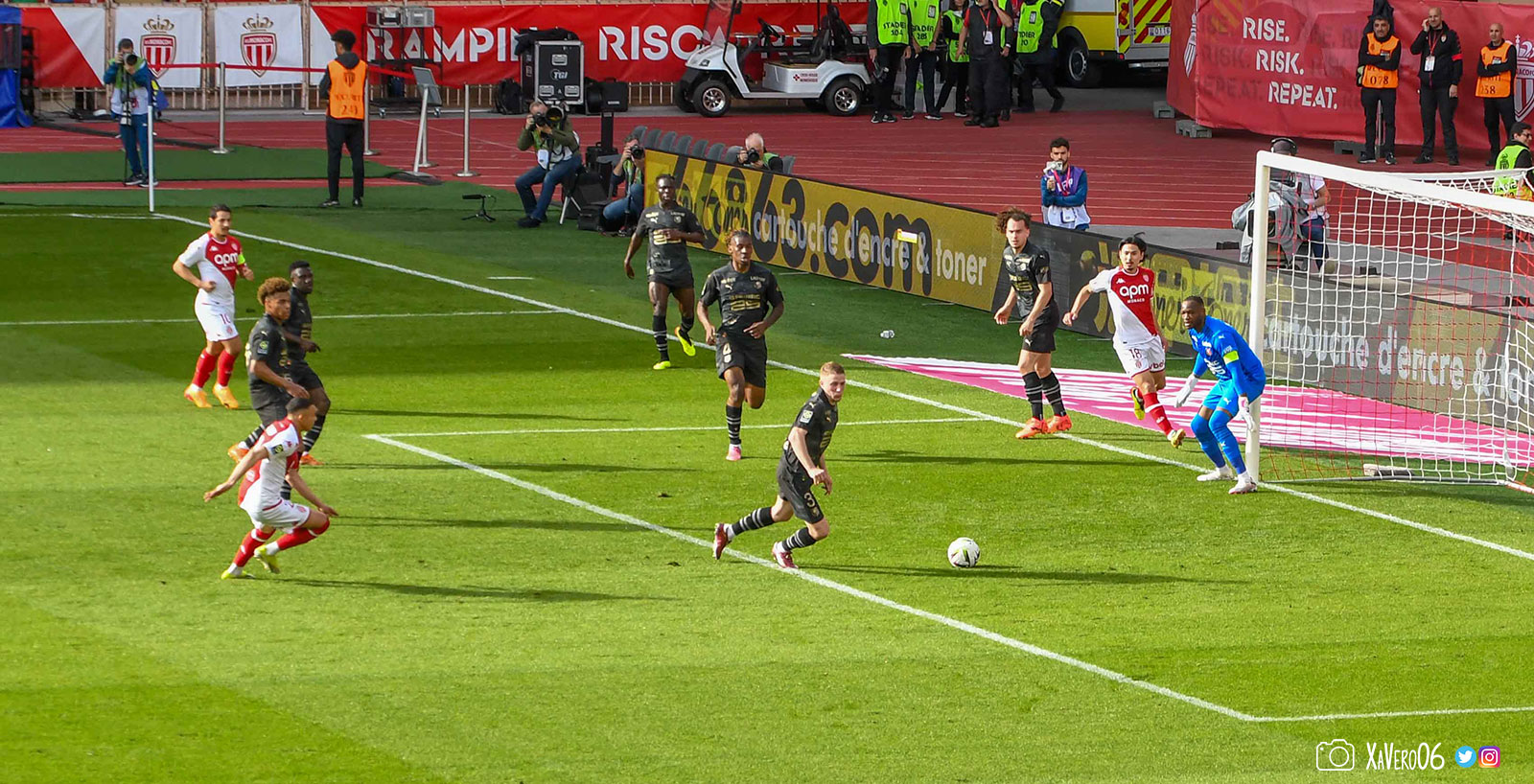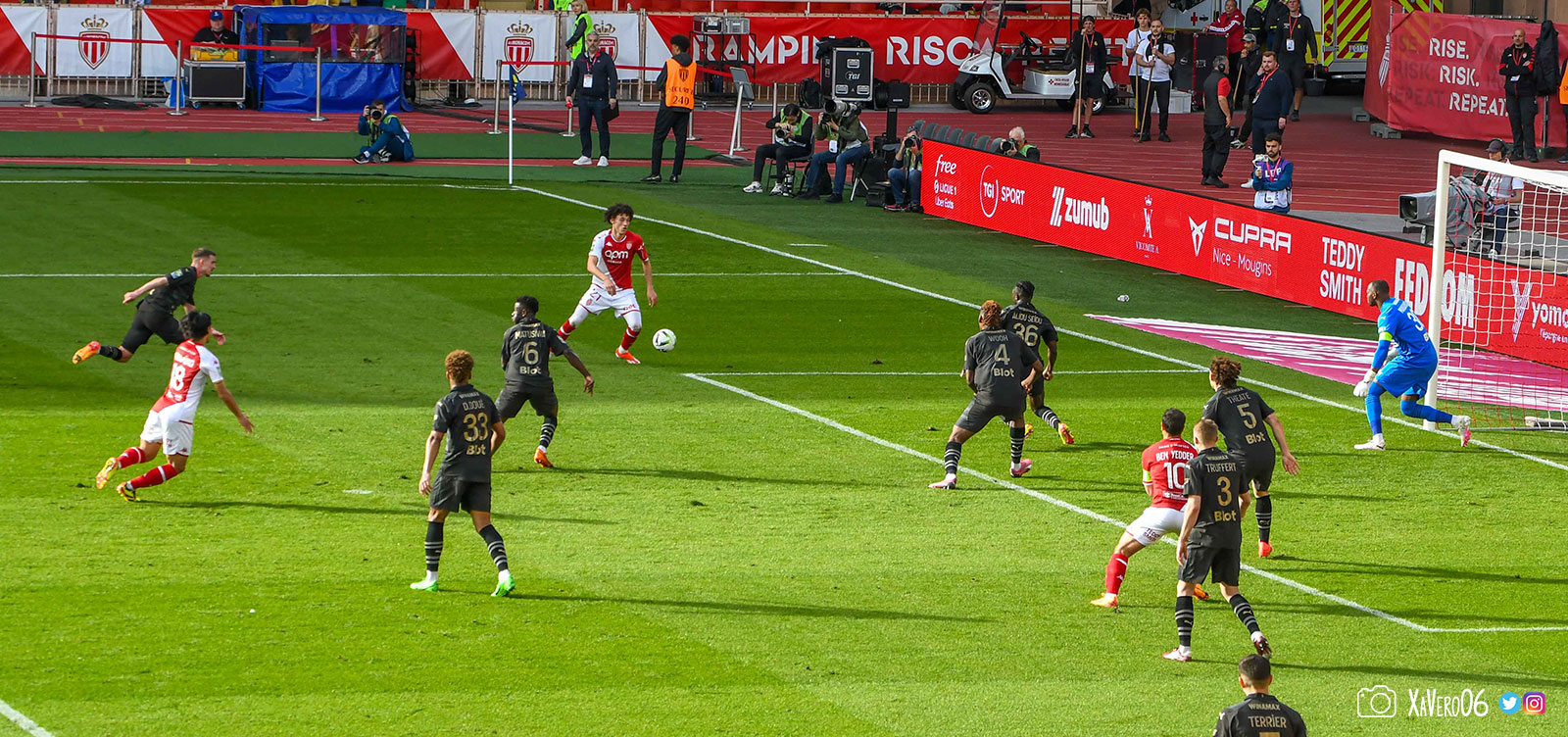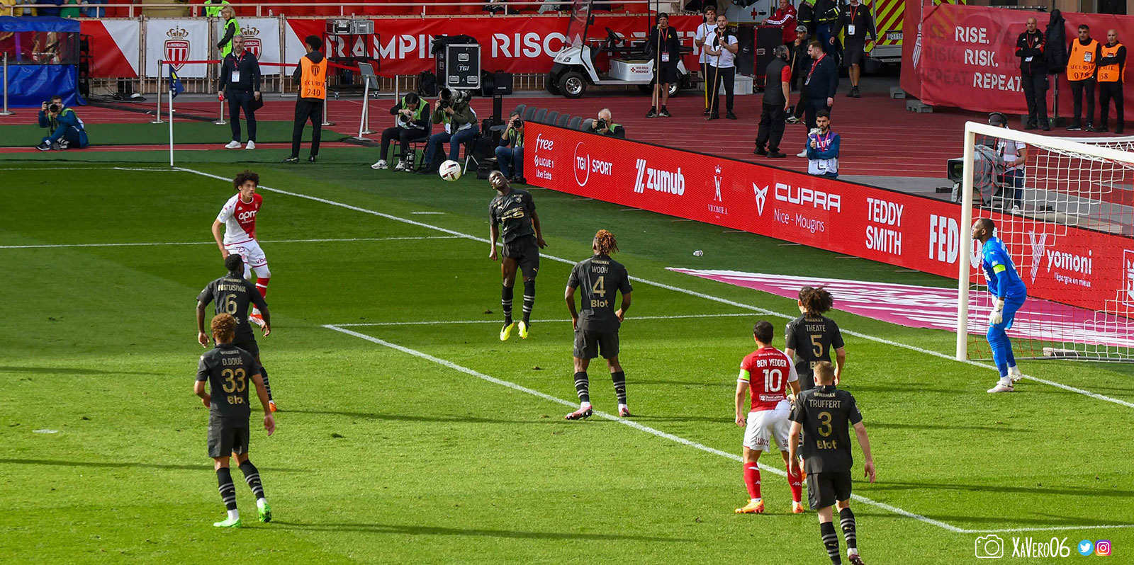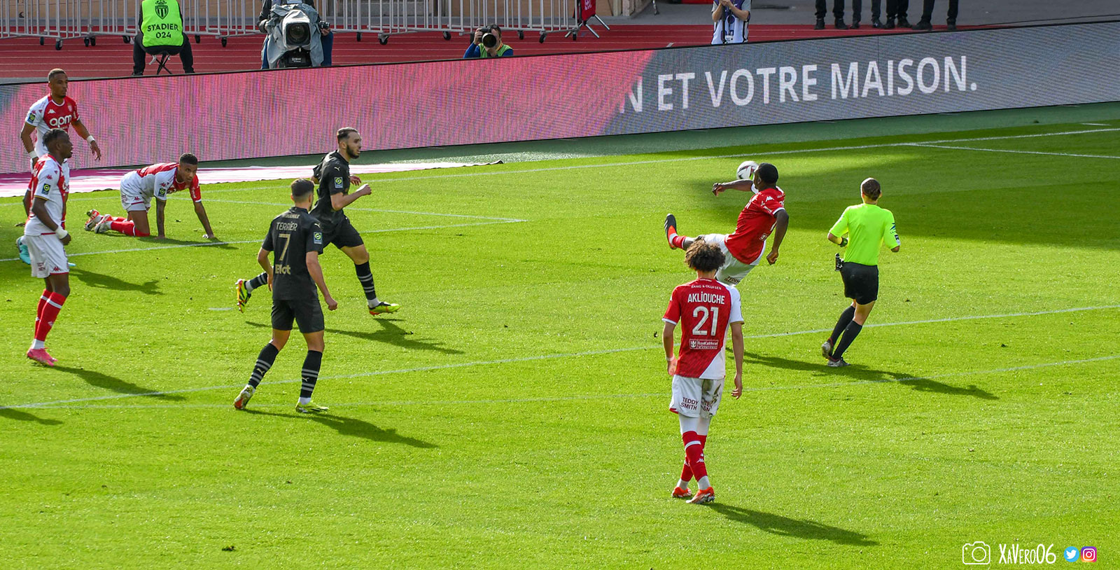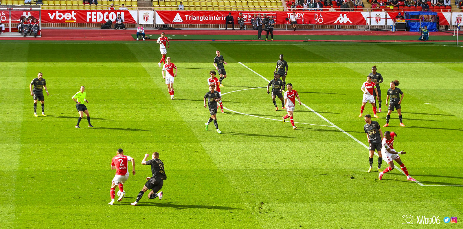 Attaque de l'ASM, avec un centre de Vanderson côté droit. Seidu est trop court au second poteau et prolonge du crâne derrière lui, sur Akliouche à l'angle des 6m, qui contrôle, feinte la frappe en centrant en retrait pour Minamino devancé par le tacle de Matusiwa. Corner (45e+1).