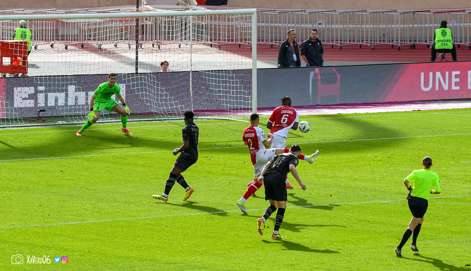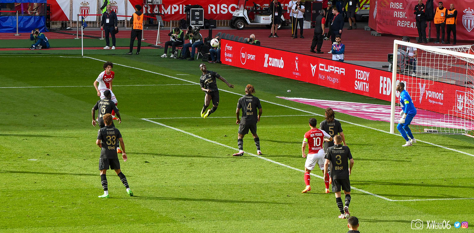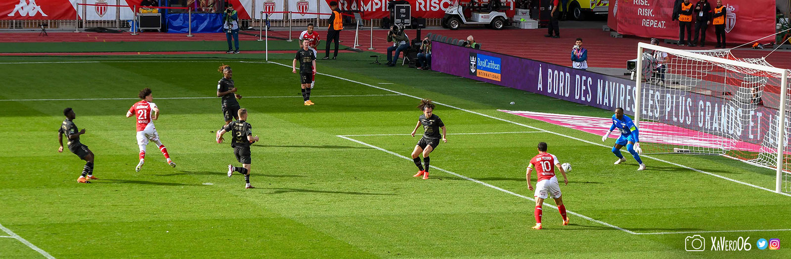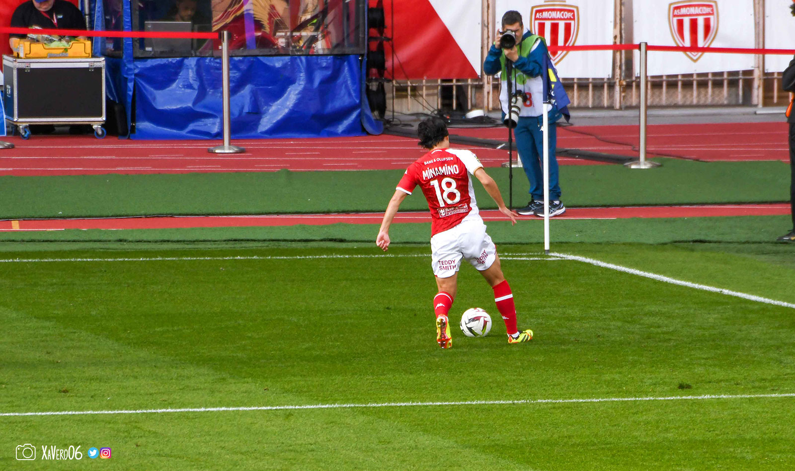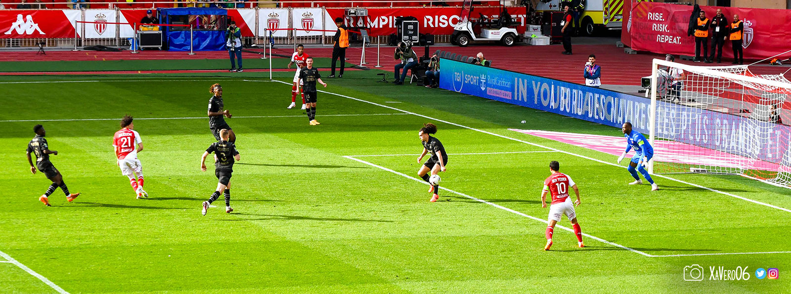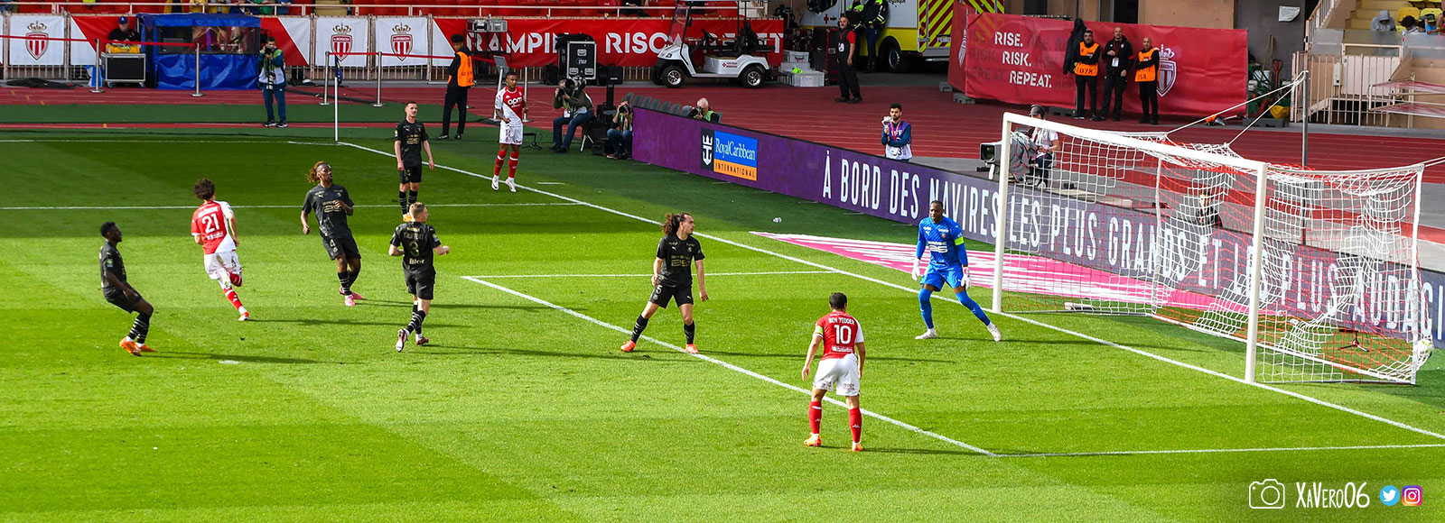 Attaque de l'ASM, avec un centre de Vanderson côté droit. Seidu est trop court au second poteau et prolonge du crâne derrière lui, sur Akliouche à l'angle des 6m, qui contrôle, feinte la frappe en centrant en retrait pour Minamino devancé par le tacle de Matusiwa. Corner (45e+1).