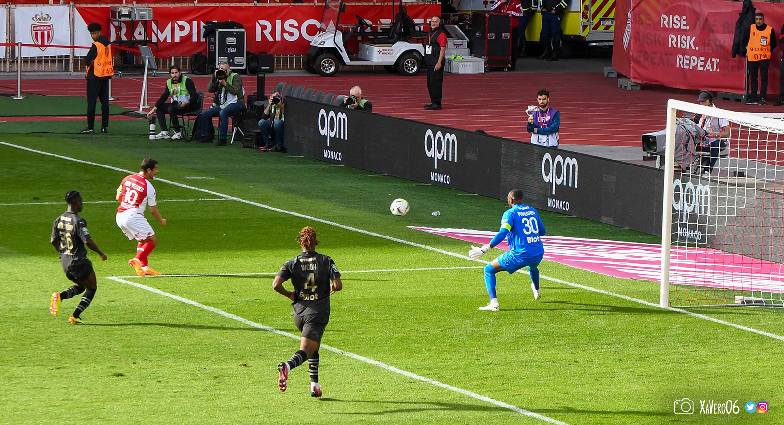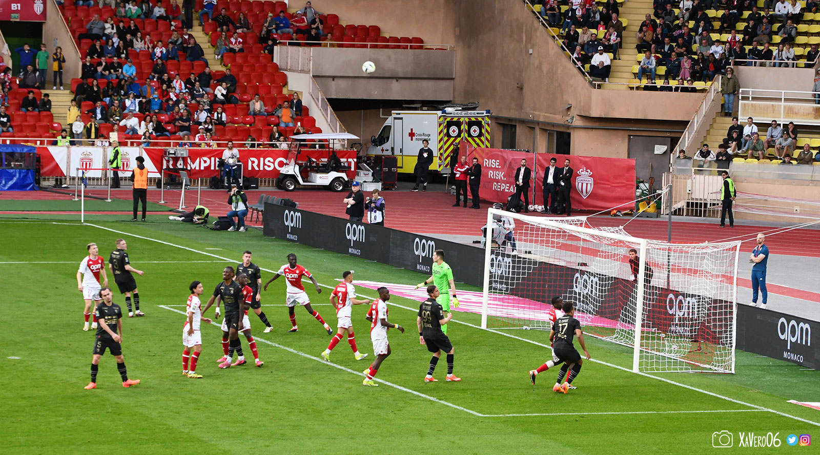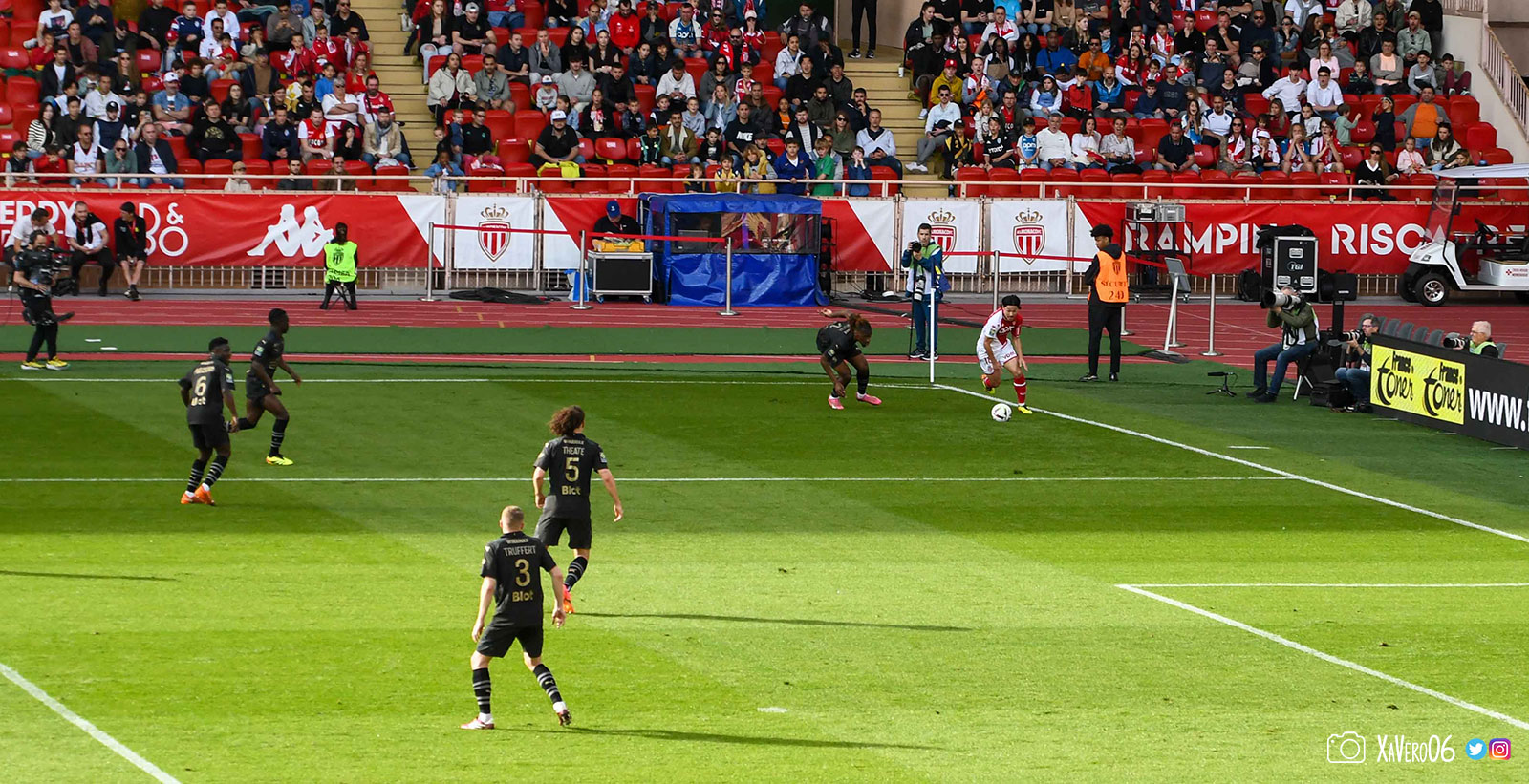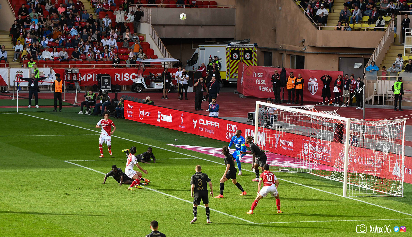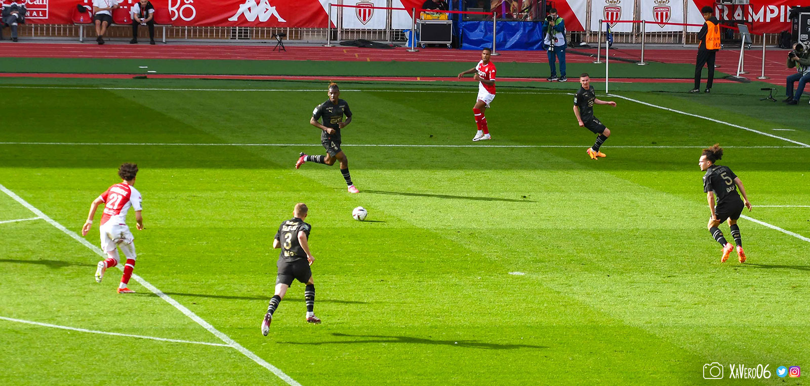 Attaque de l'ASM, avec un centre de Vanderson côté droit. Seidu est trop court au second poteau et prolonge du crâne derrière lui, sur Akliouche à l'angle des 6m, qui contrôle, feinte la frappe en centrant en retrait pour Minamino devancé par le tacle de Matusiwa. Corner (45e+1).