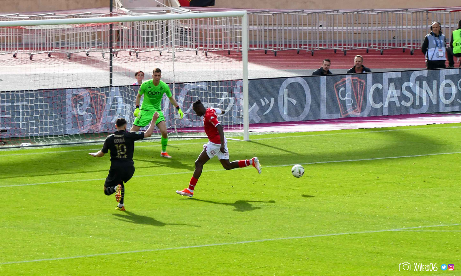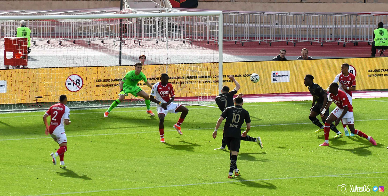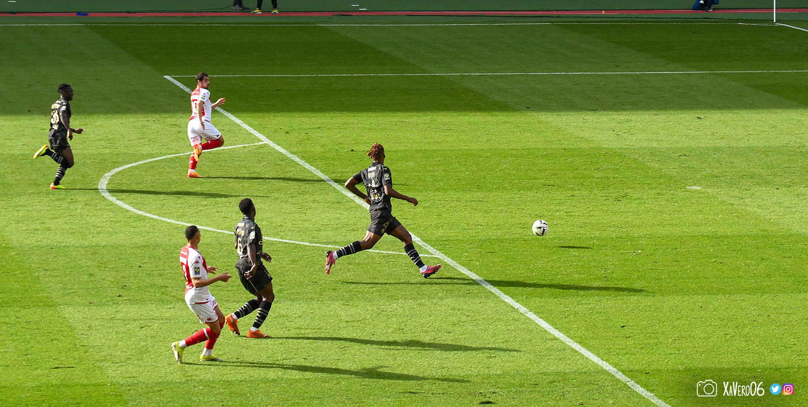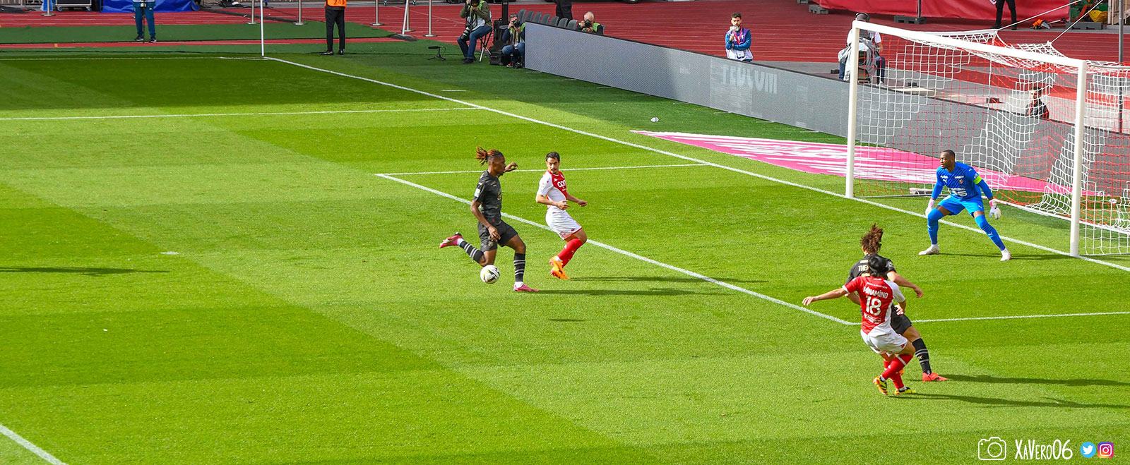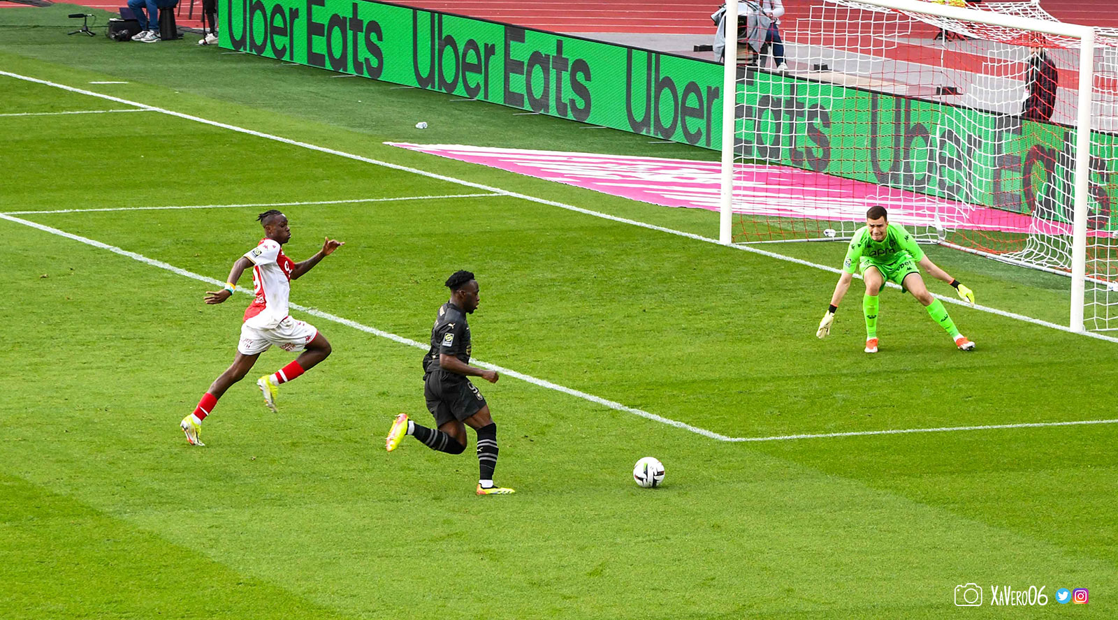 Attaque de l'ASM, avec un centre de Vanderson côté droit. Seidu est trop court au second poteau et prolonge du crâne derrière lui, sur Akliouche à l'angle des 6m, qui contrôle, feinte la frappe en centrant en retrait pour Minamino devancé par le tacle de Matusiwa. Corner (45e+1).