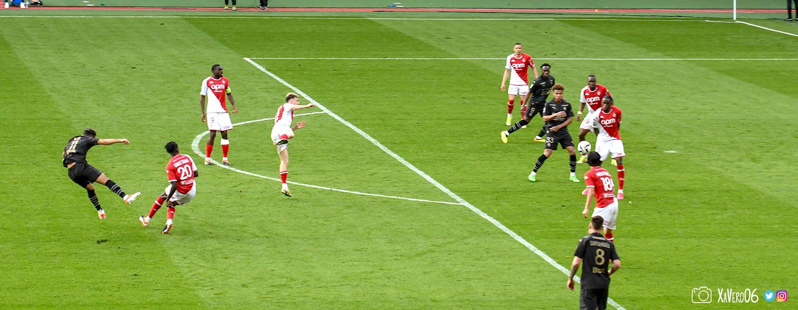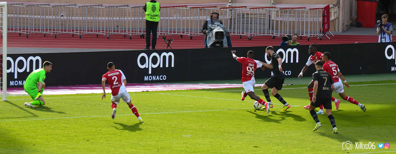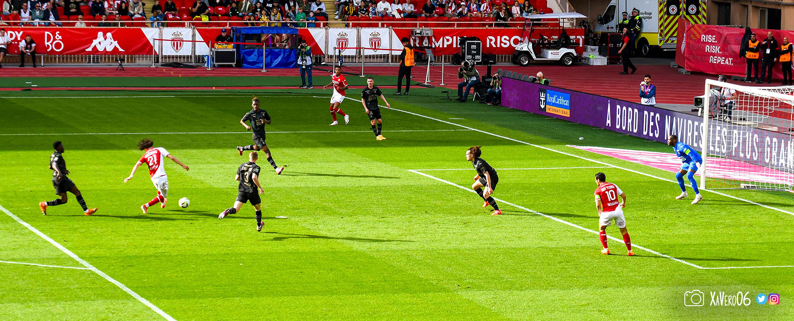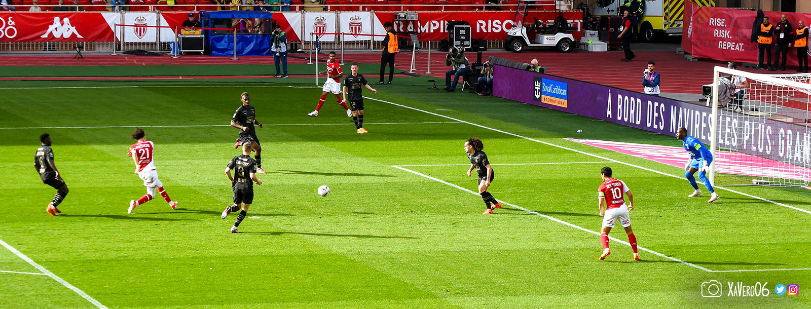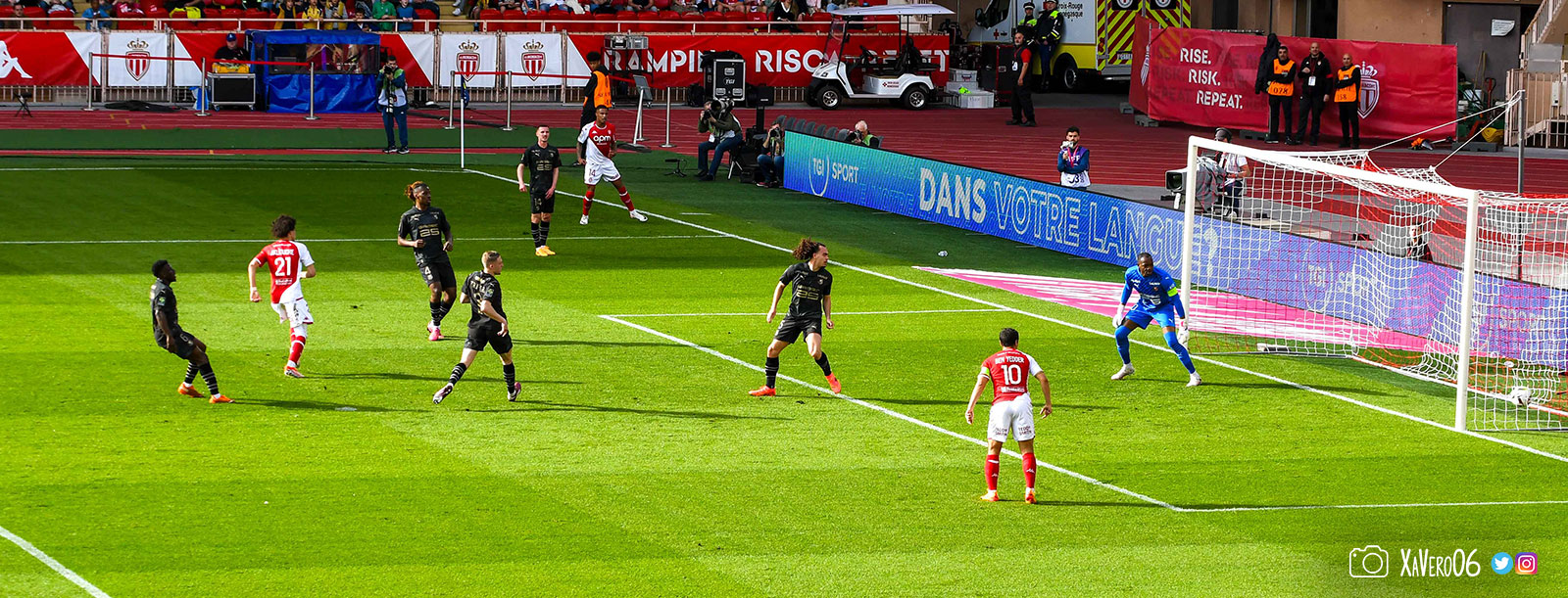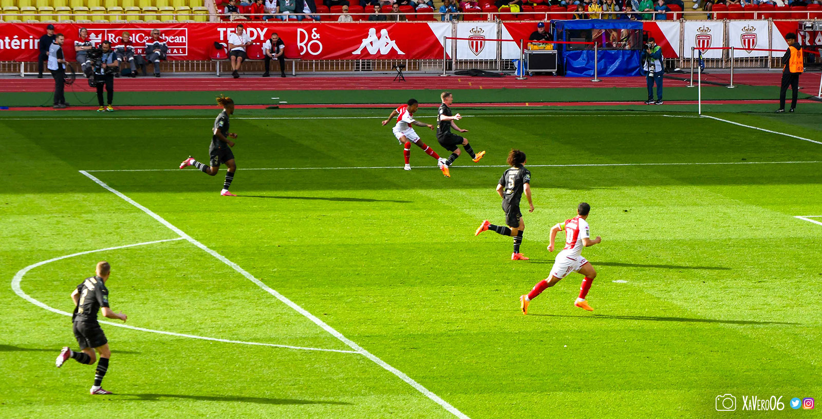 Attaque de l'ASM, avec un centre de Vanderson côté droit. Seidu est trop court au second poteau et prolonge du crâne derrière lui, sur Akliouche à l'angle des 6m, qui contrôle, feinte la frappe en centrant en retrait pour Minamino devancé par le tacle de Matusiwa. Corner (45e+1).