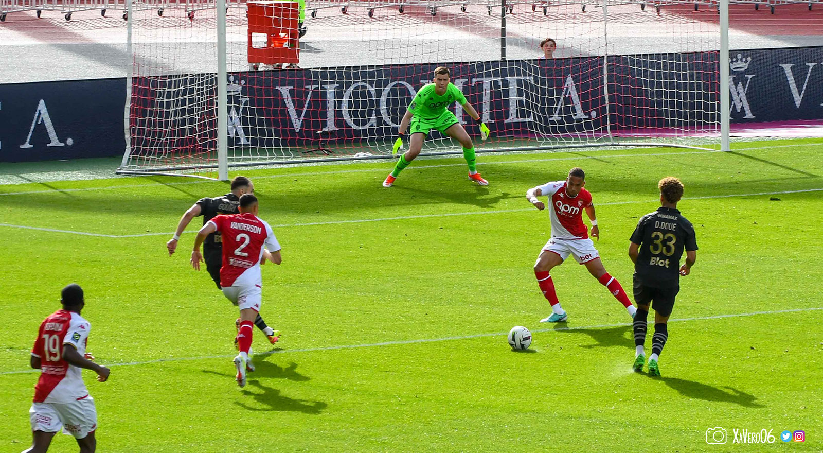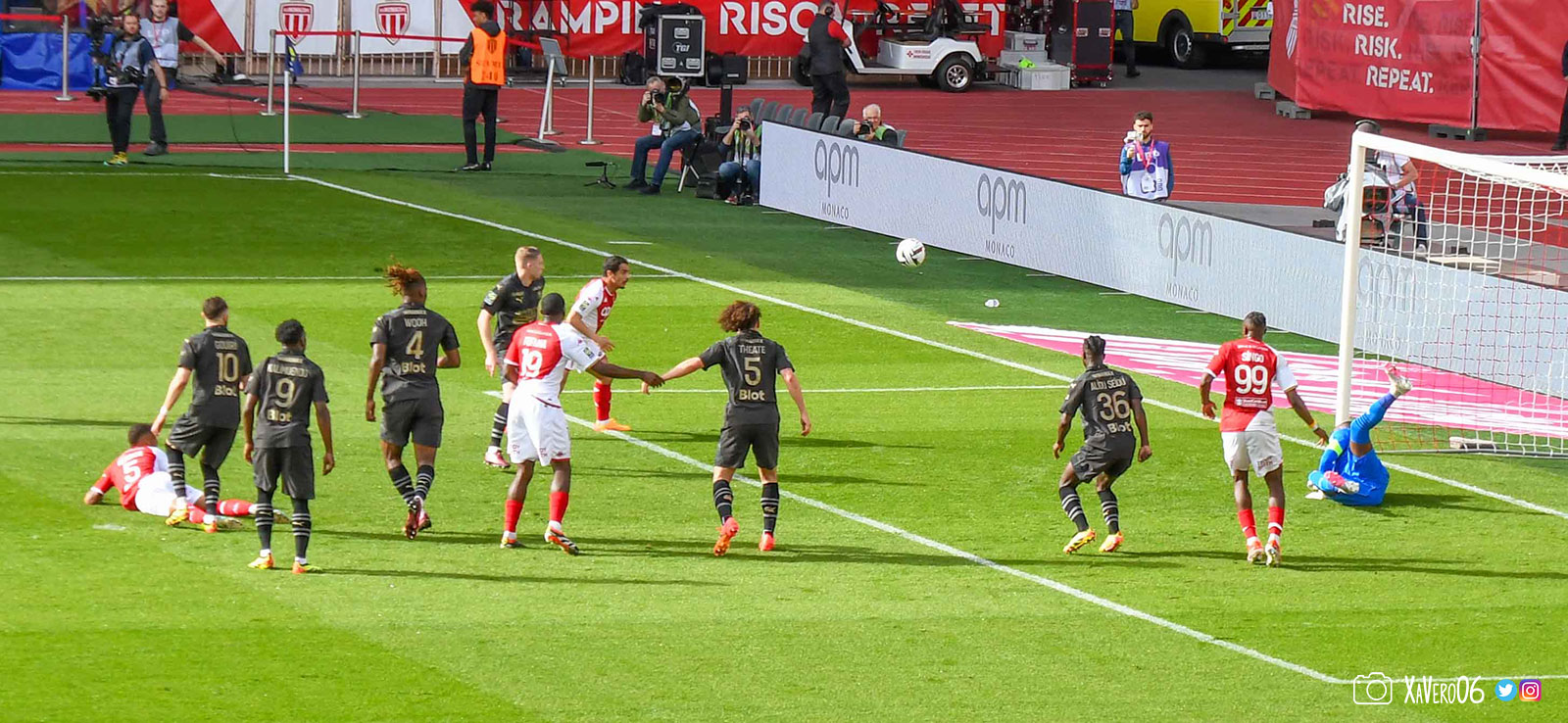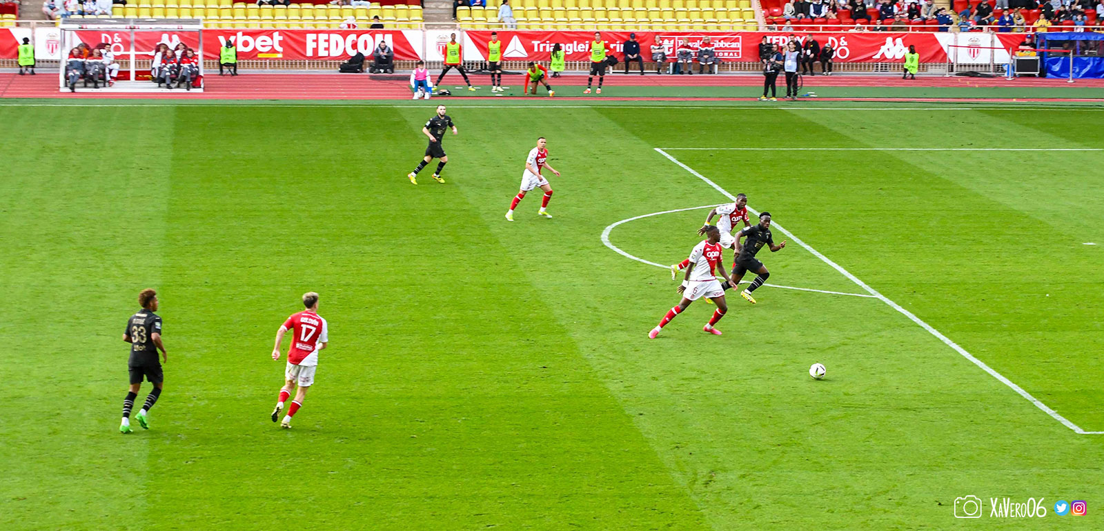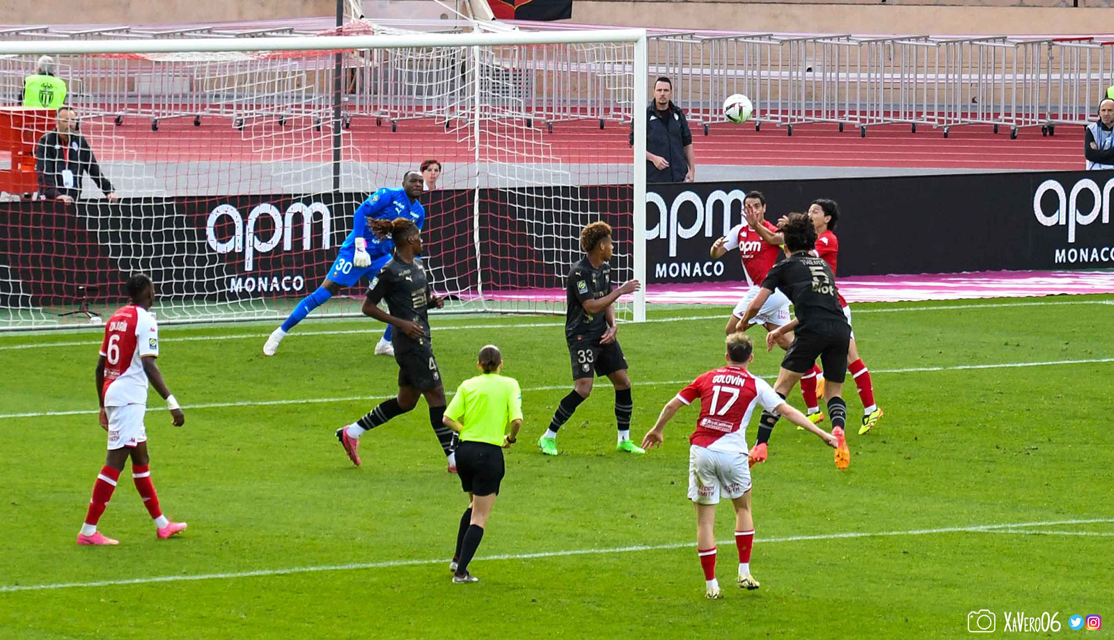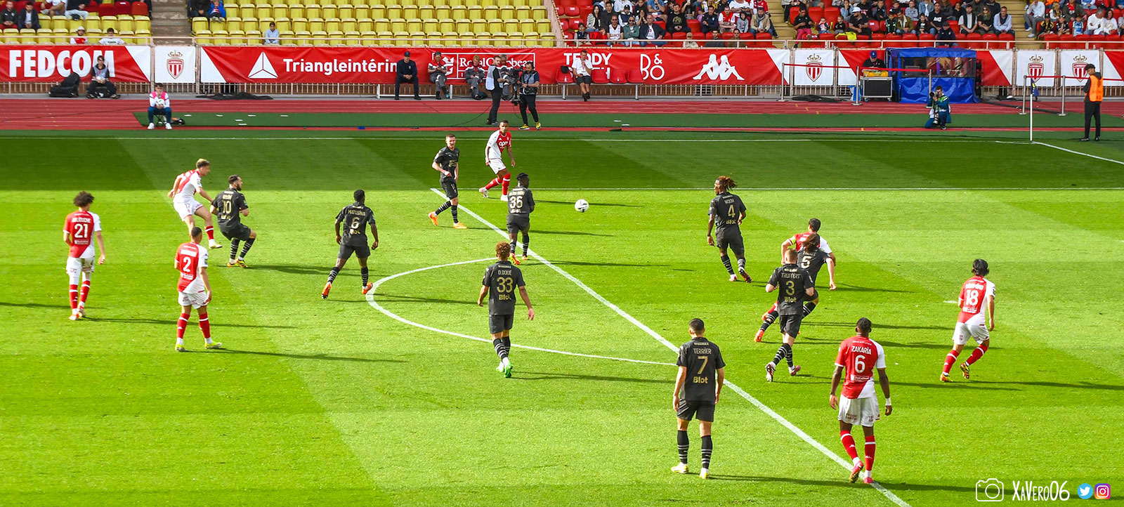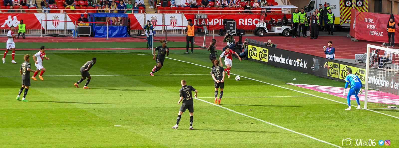 Attaque de l'ASM, avec un centre de Vanderson côté droit. Seidu est trop court au second poteau et prolonge du crâne derrière lui, sur Akliouche à l'angle des 6m, qui contrôle, feinte la frappe en centrant en retrait pour Minamino devancé par le tacle de Matusiwa. Corner (45e+1).