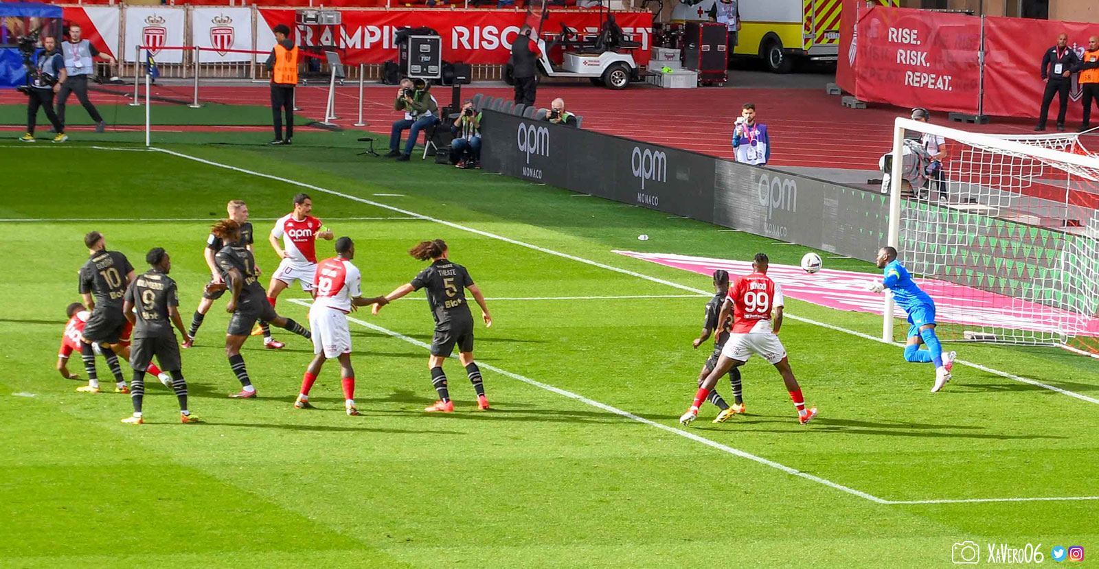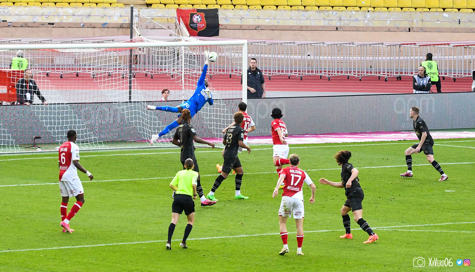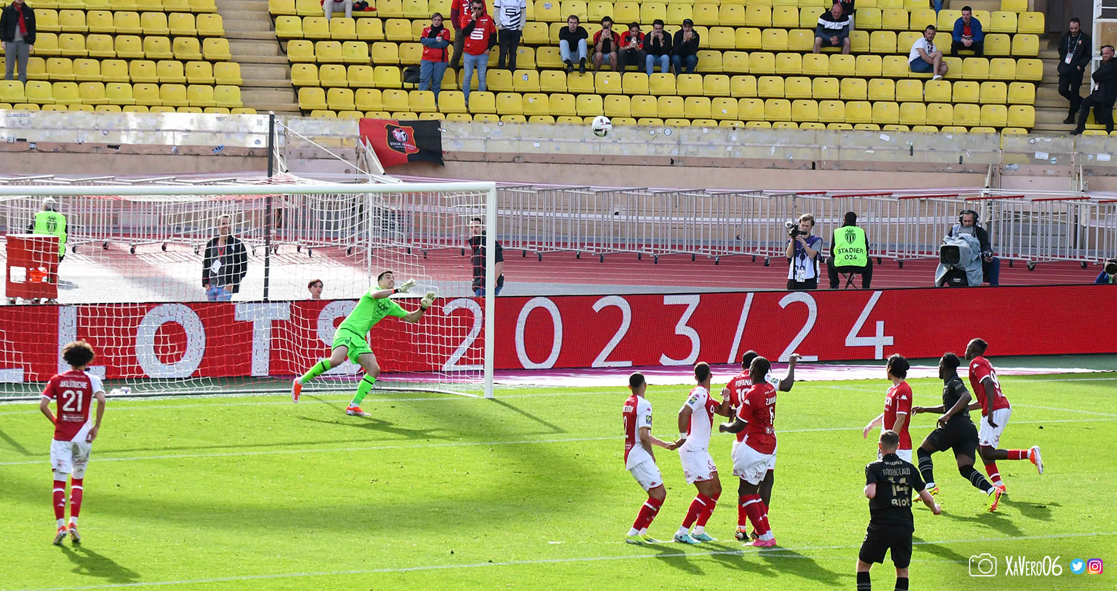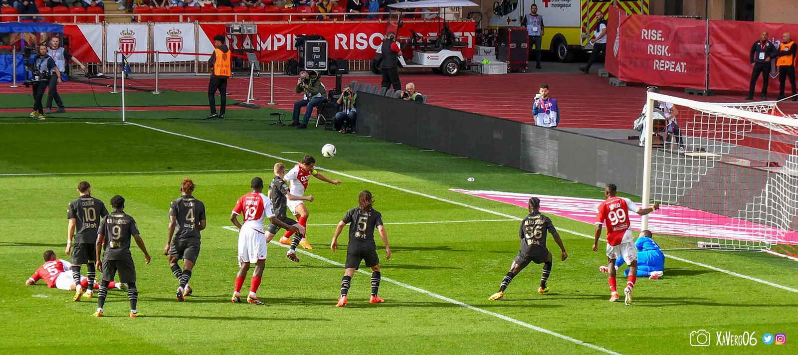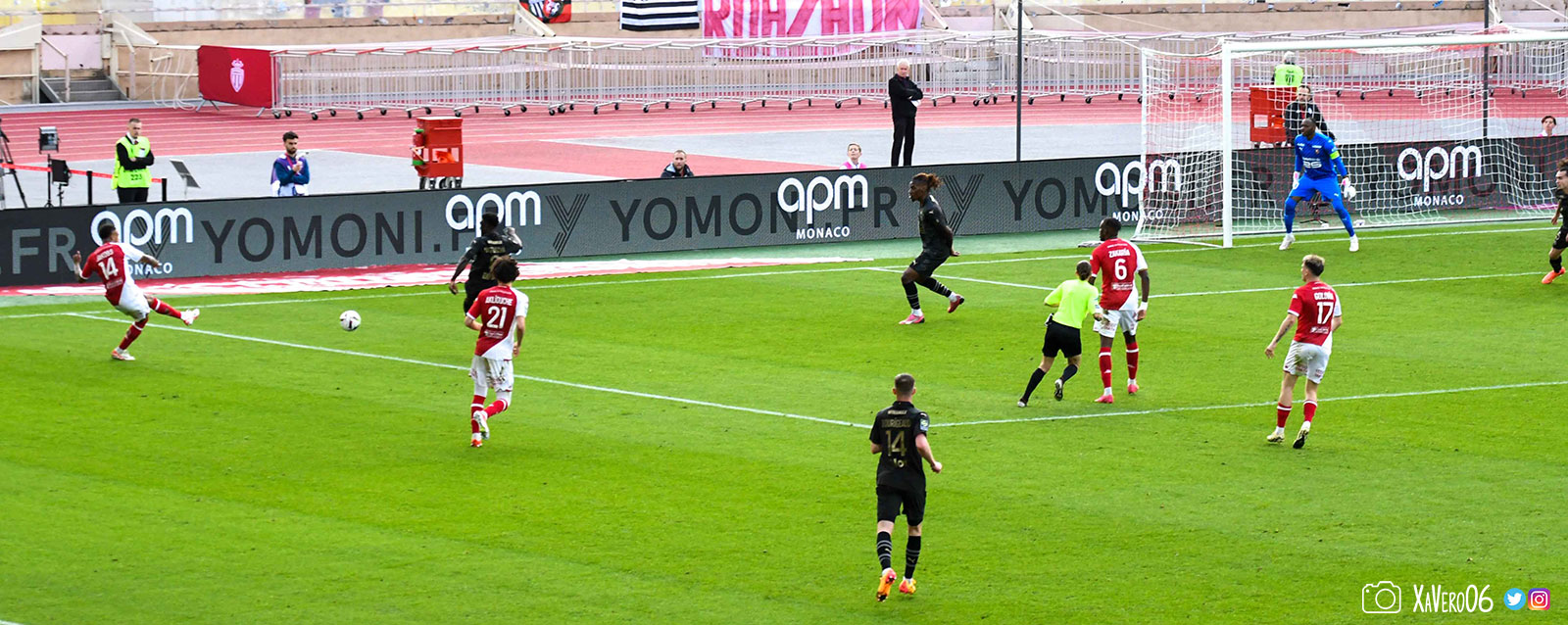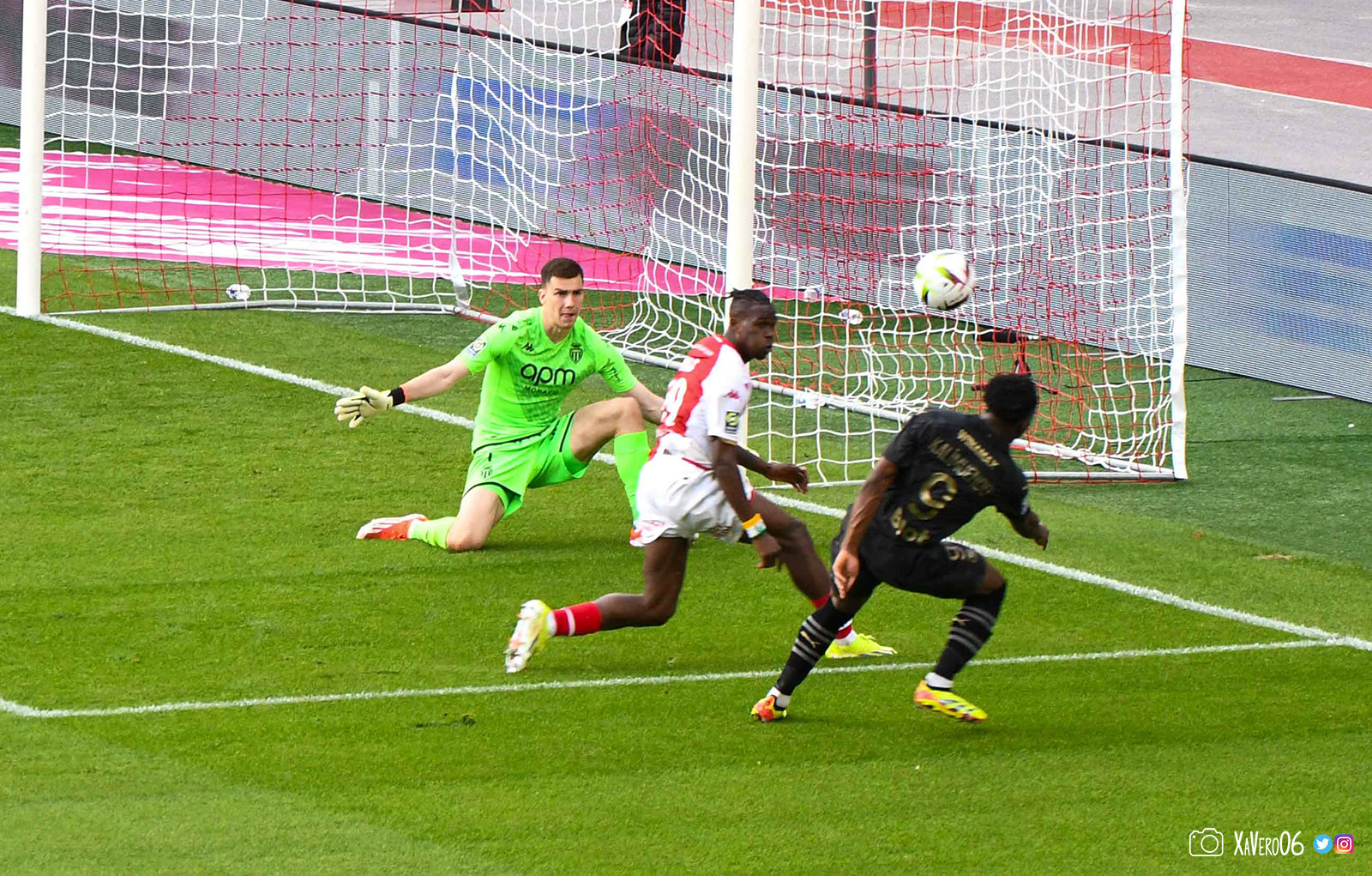 Attaque de l'ASM, avec un centre de Vanderson côté droit. Seidu est trop court au second poteau et prolonge du crâne derrière lui, sur Akliouche à l'angle des 6m, qui contrôle, feinte la frappe en centrant en retrait pour Minamino devancé par le tacle de Matusiwa. Corner (45e+1).