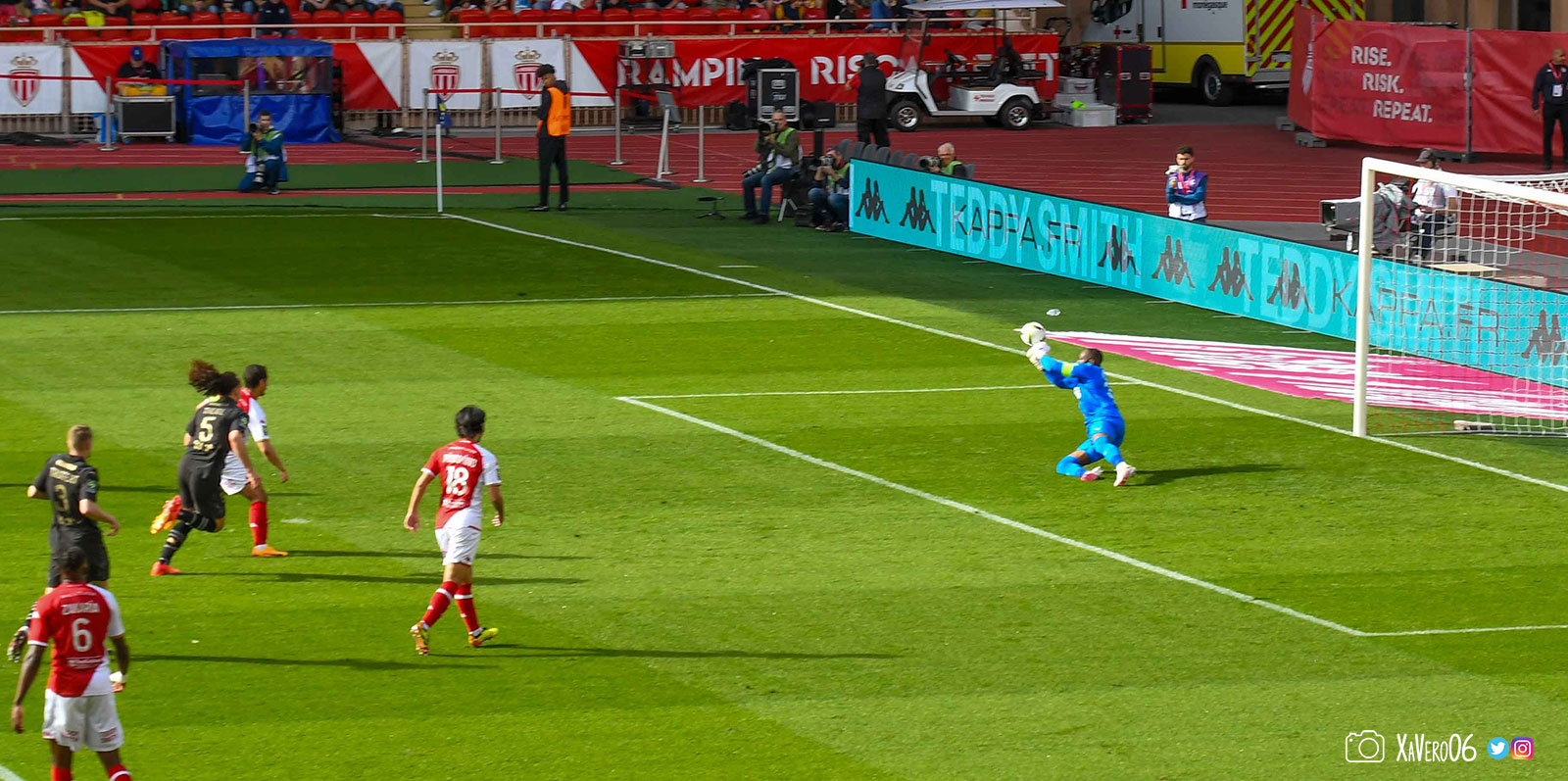 Monaco continue de pousser, Vanderson vient dans l'axe depuis son côté droit et donne pour Golovin aux 25m, qui frappe soudainement. Mandanda détourne en corner le ballon puissant (11e).