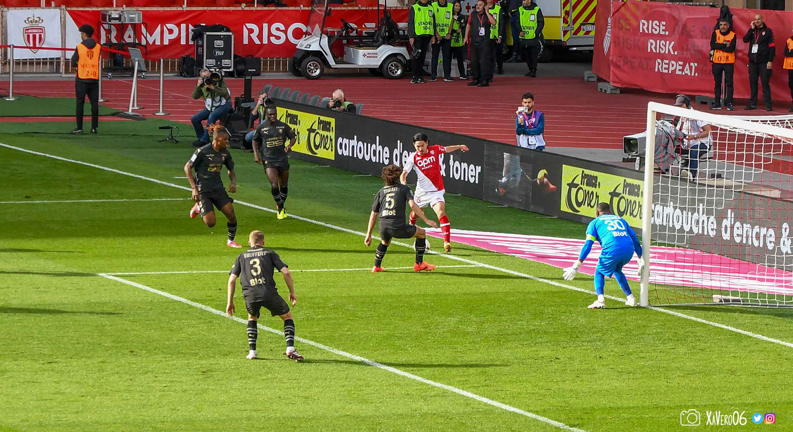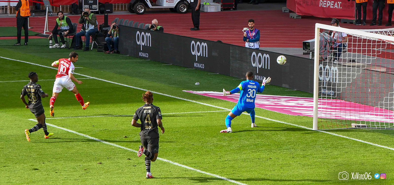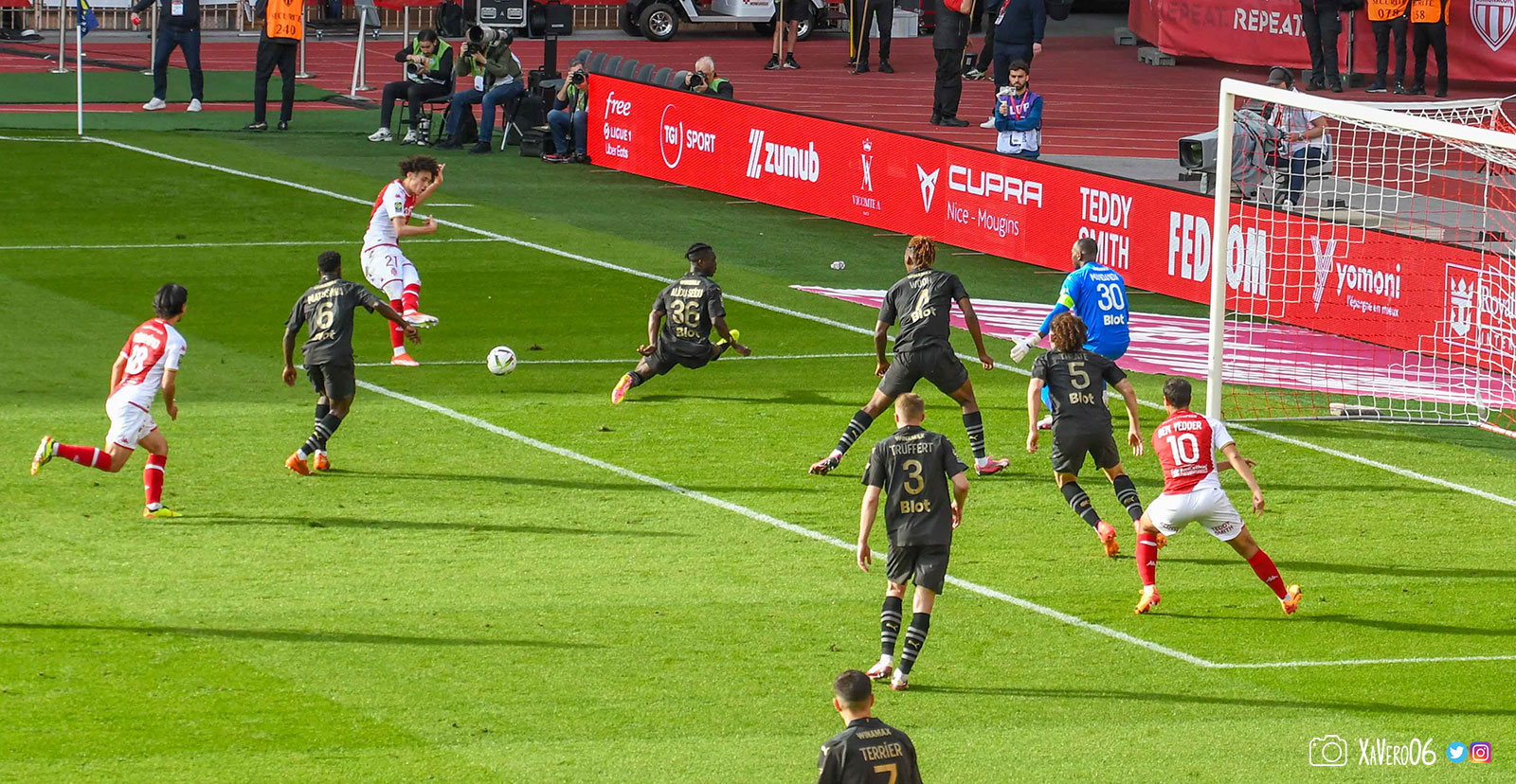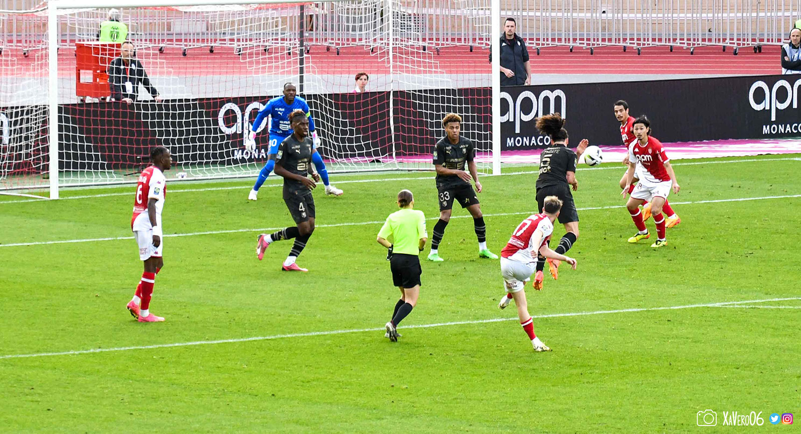 Et c'est rapidement payant, avec un ballon perdu de Bourigeaud. Minamino lance côté gauche Ismail Jakobs qui centre en aveugle et en retrait pour le point de pénalty où Maghnes Akliouche vient couper et reprendre du plat du pied gauche. Le ballon est croisé et hors de portée de Mandanda, battu (1-0, 25e).