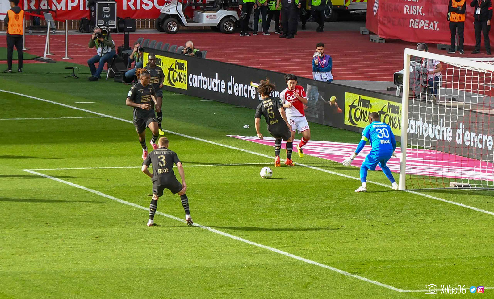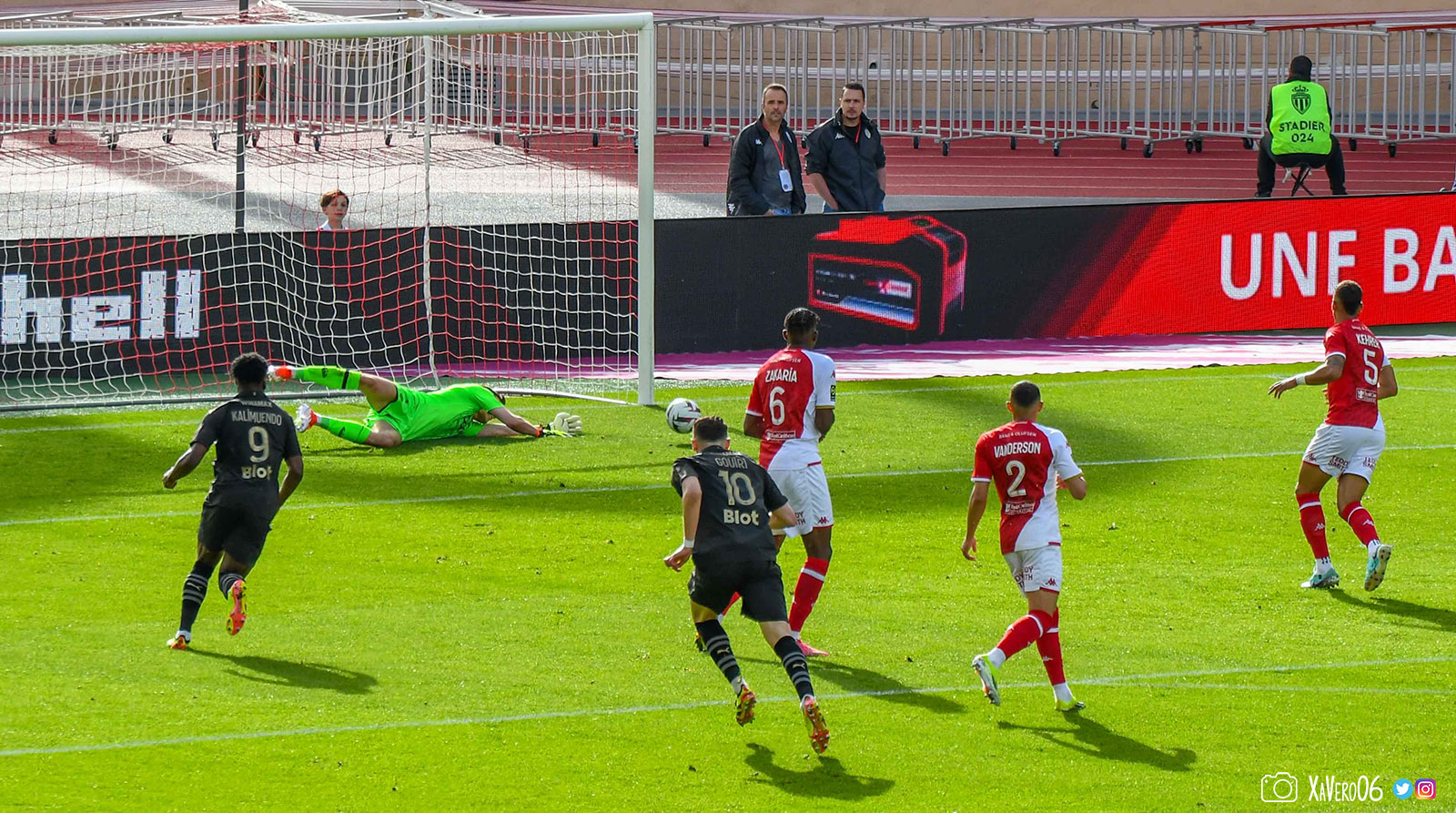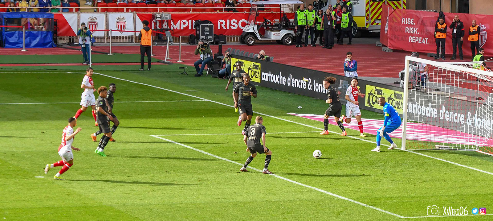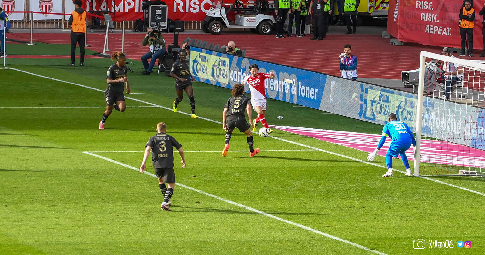 Et c'est rapidement payant, avec un ballon perdu de Bourigeaud. Minamino lance côté gauche Ismail Jakobs qui centre en aveugle et en retrait pour le point de pénalty où Maghnes Akliouche vient couper et reprendre du plat du pied gauche. Le ballon est croisé et hors de portée de Mandanda, battu (1-0, 25e).