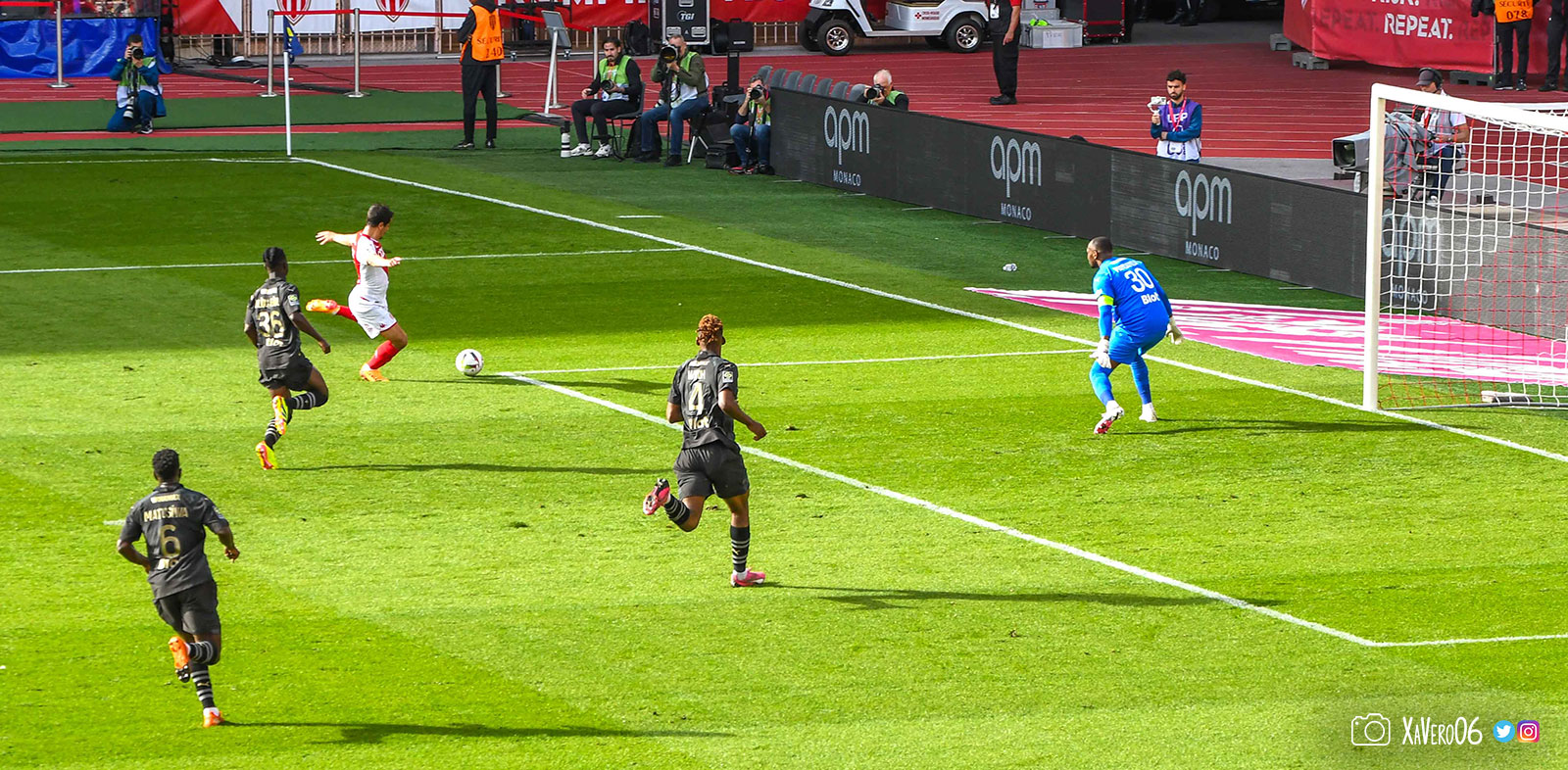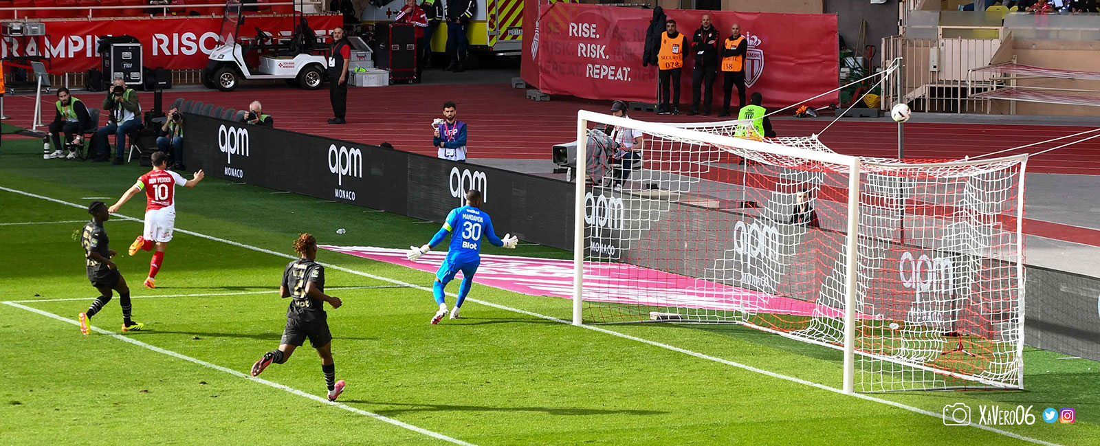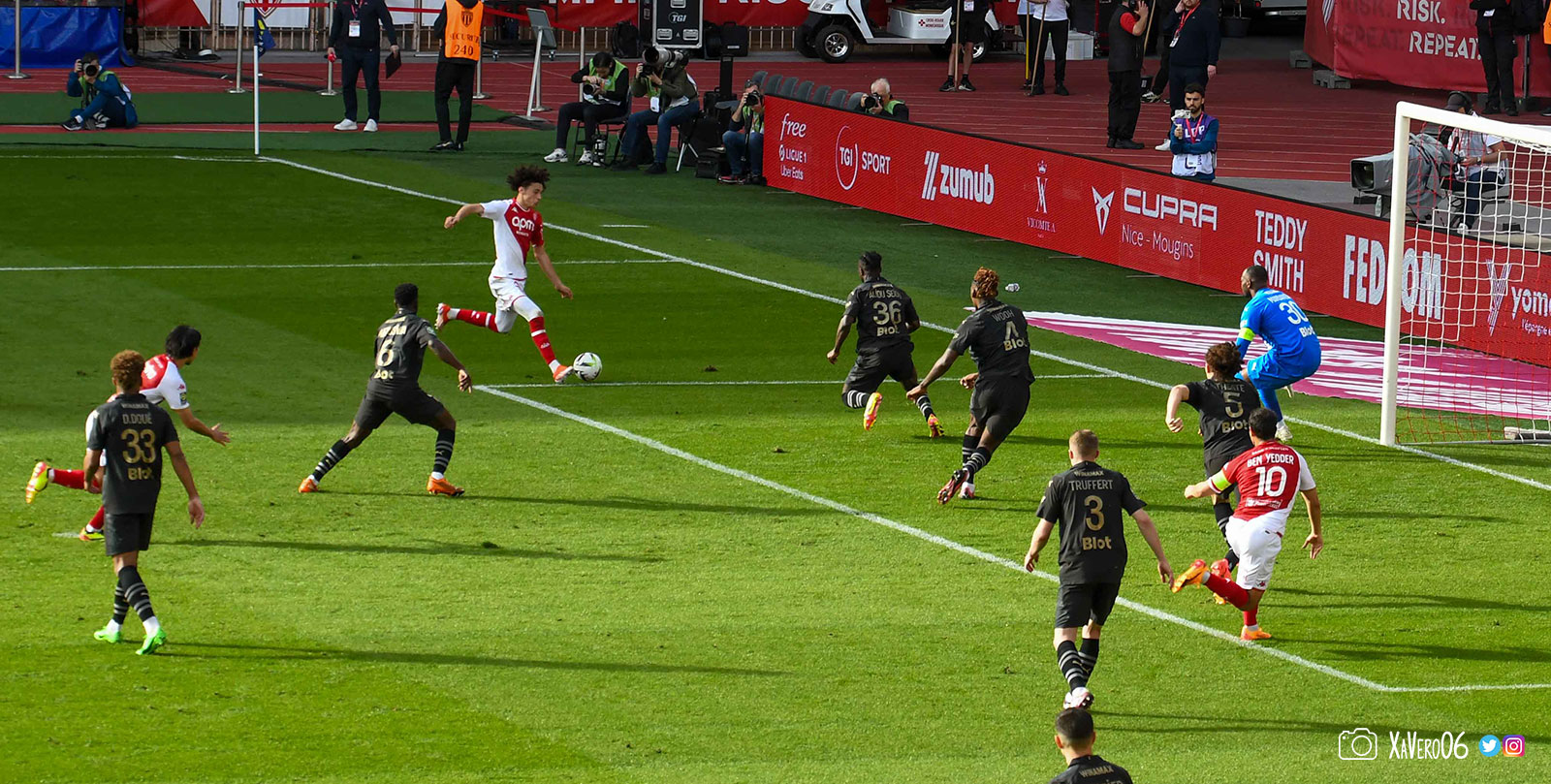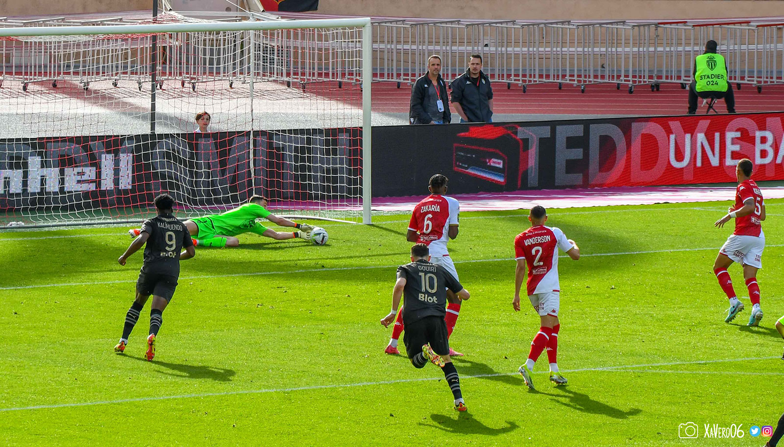 Et c'est rapidement payant, avec un ballon perdu de Bourigeaud. Minamino lance côté gauche Ismail Jakobs qui centre en aveugle et en retrait pour le point de pénalty où Maghnes Akliouche vient couper et reprendre du plat du pied gauche. Le ballon est croisé et hors de portée de Mandanda, battu (1-0, 25e).