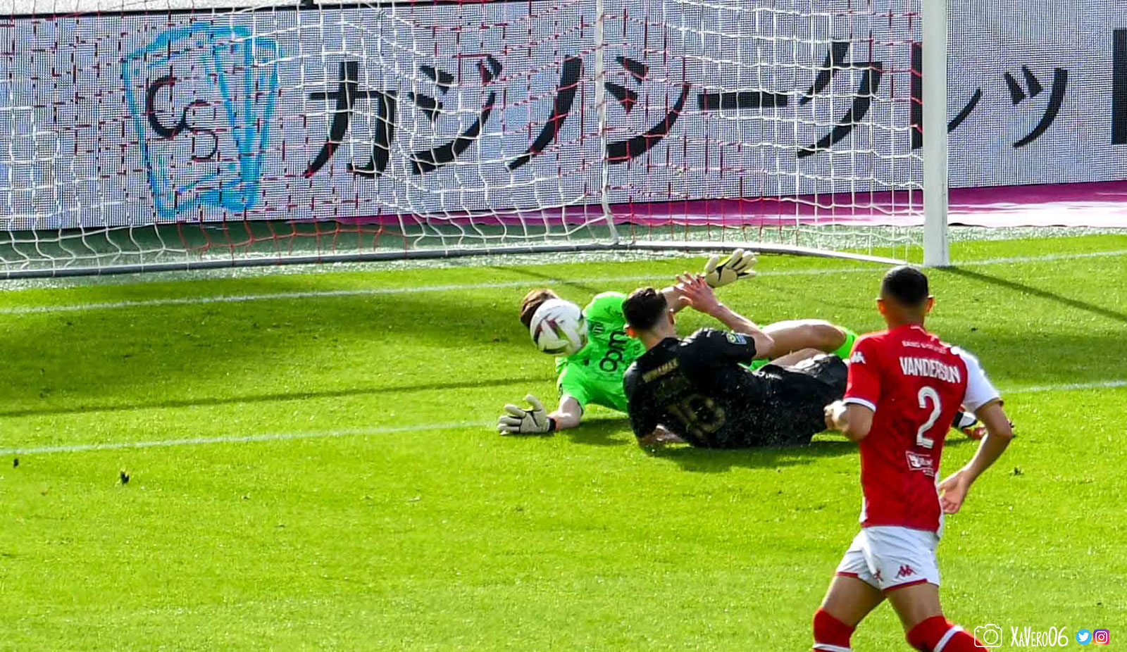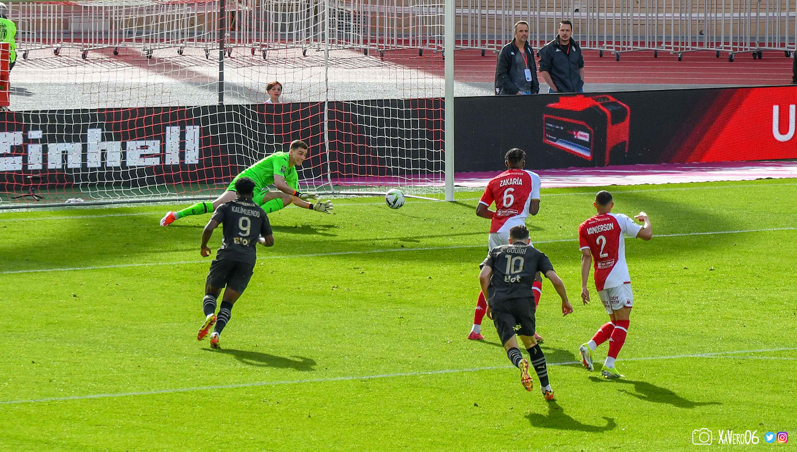 Centre de la droite de Kalimuendo pour Gouiri seul au second poteau. Singo coupe au point de pénalty, mais détourne seulement le ballon qui reste devant les 6m. Radoslaw Majecki se jette, comme Gouiri qui tacle, le portier polonais repousse à bout portant (15e).