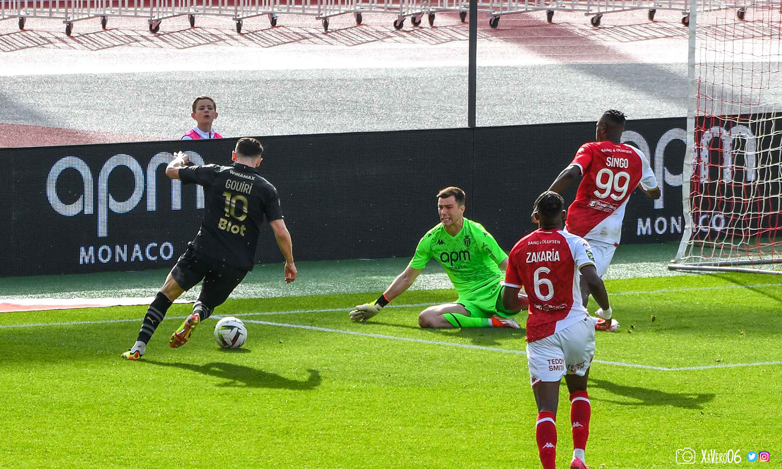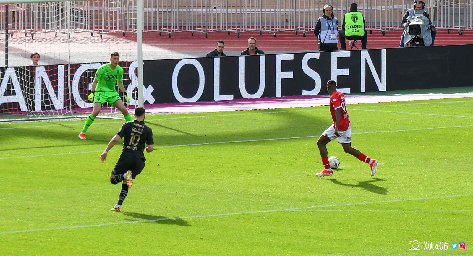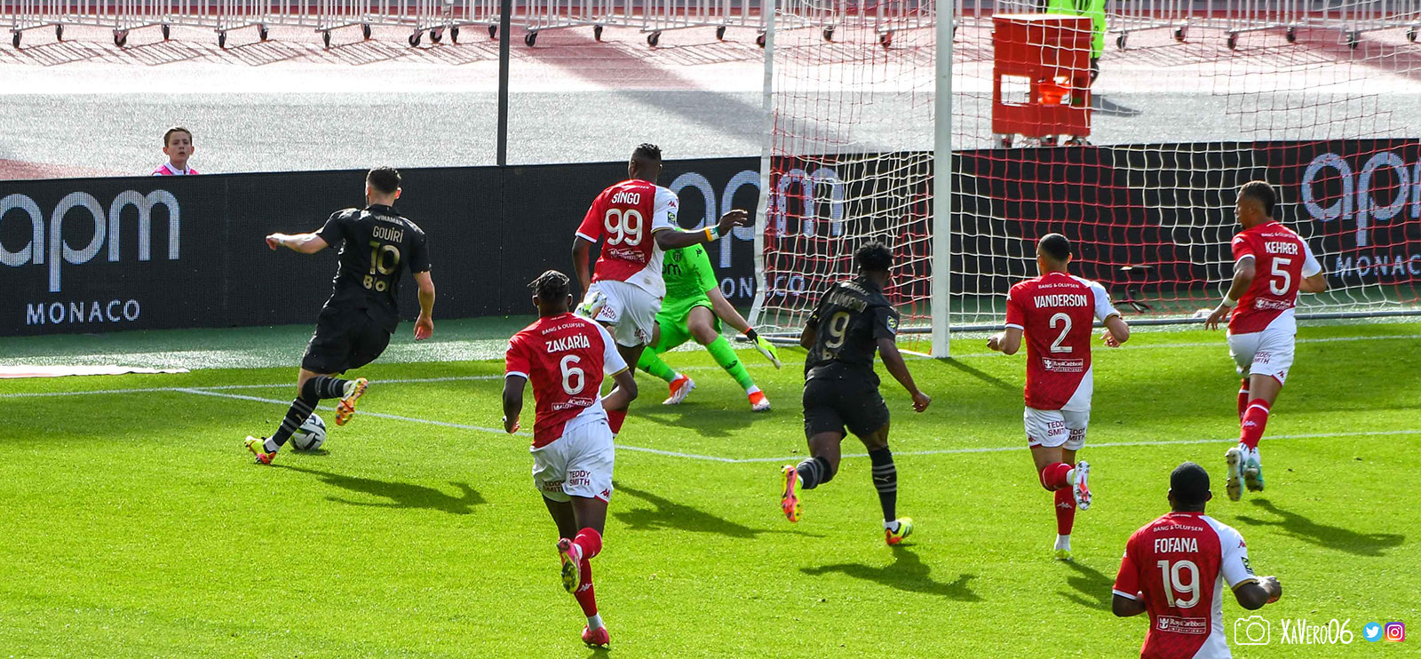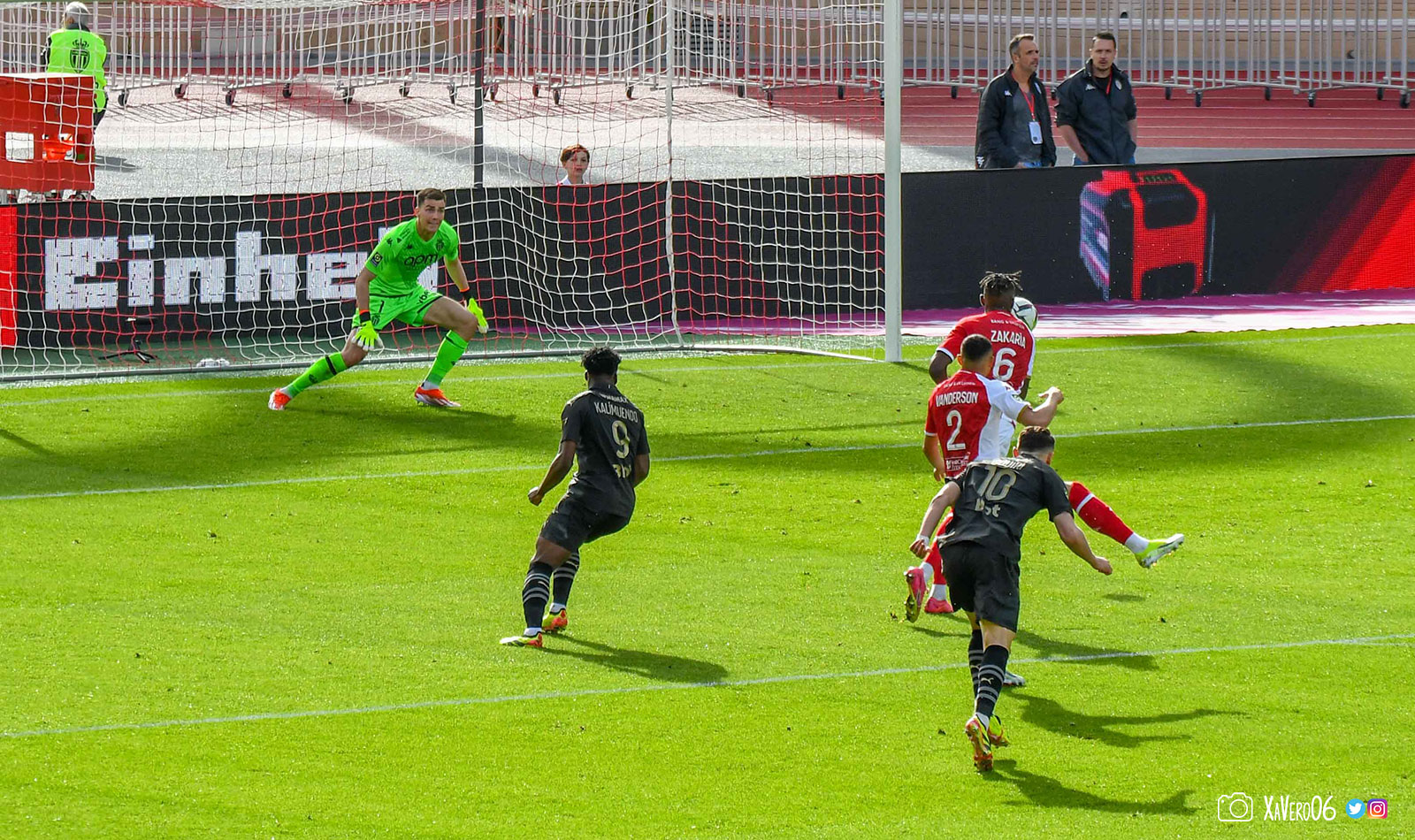 Action de Gouiri qui rentre dans la surface, poursuivi par Kehrer. Il résiste au monégasque, fait est face à Singo qui l'enferme dans l'angle, quasiment sur Majecki dans les 6m. Il frappe à côté du bout du pied (44e).
