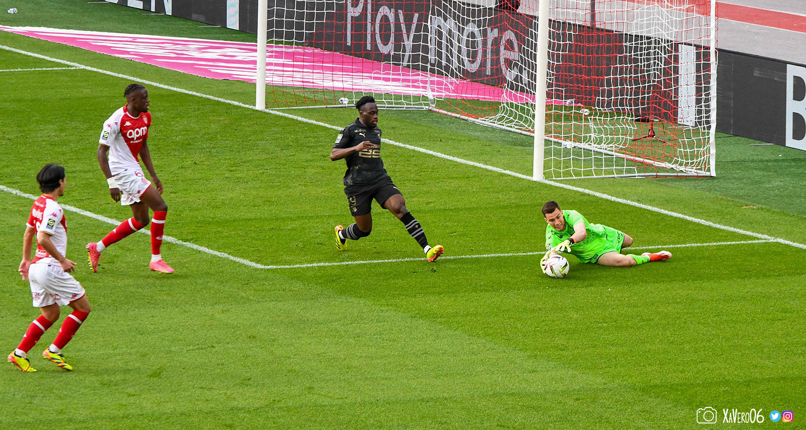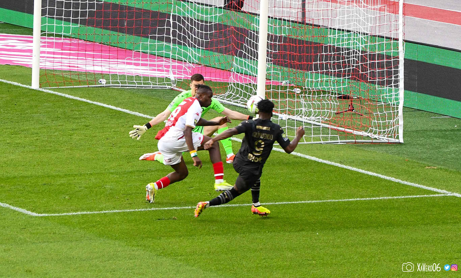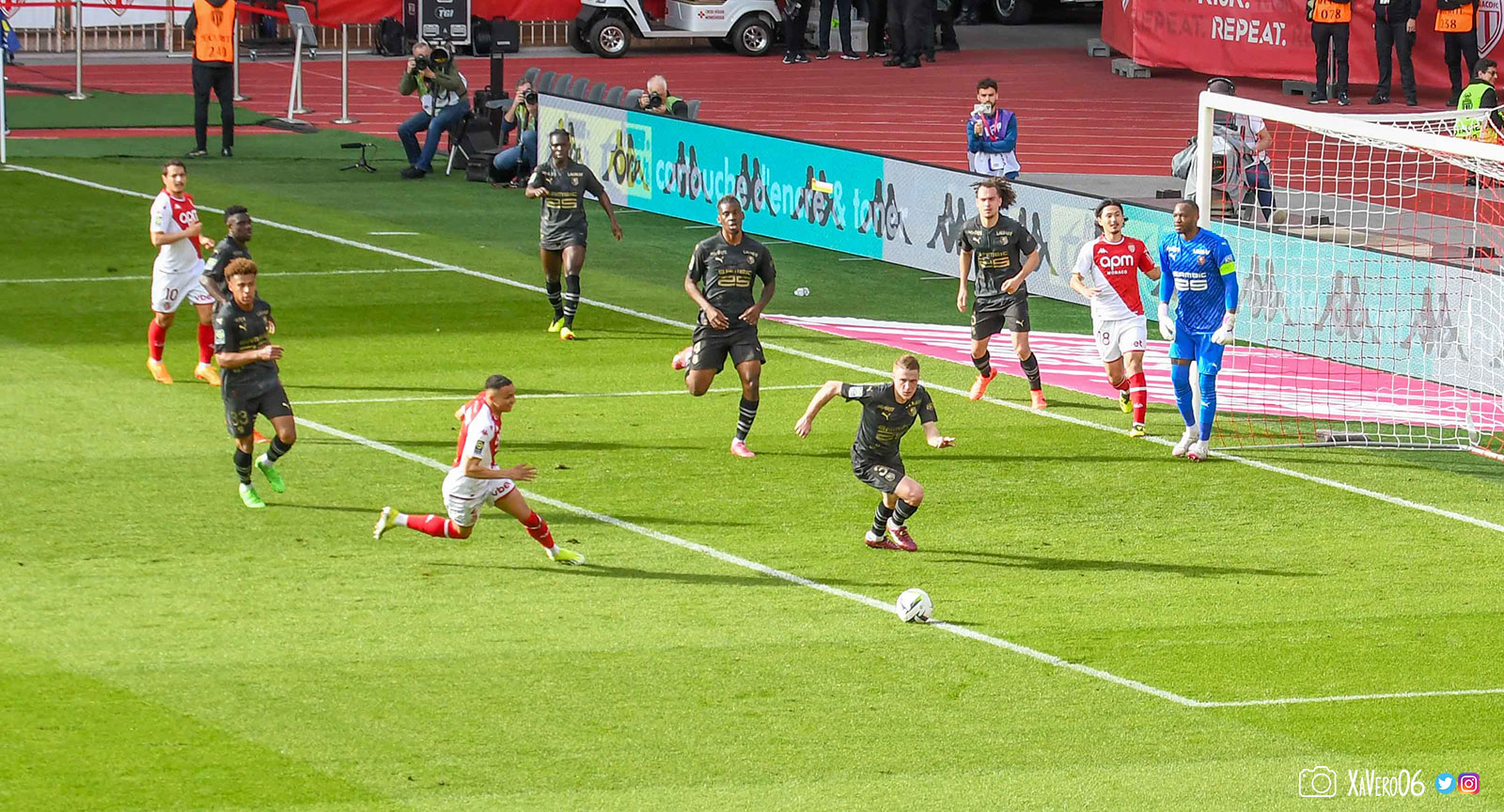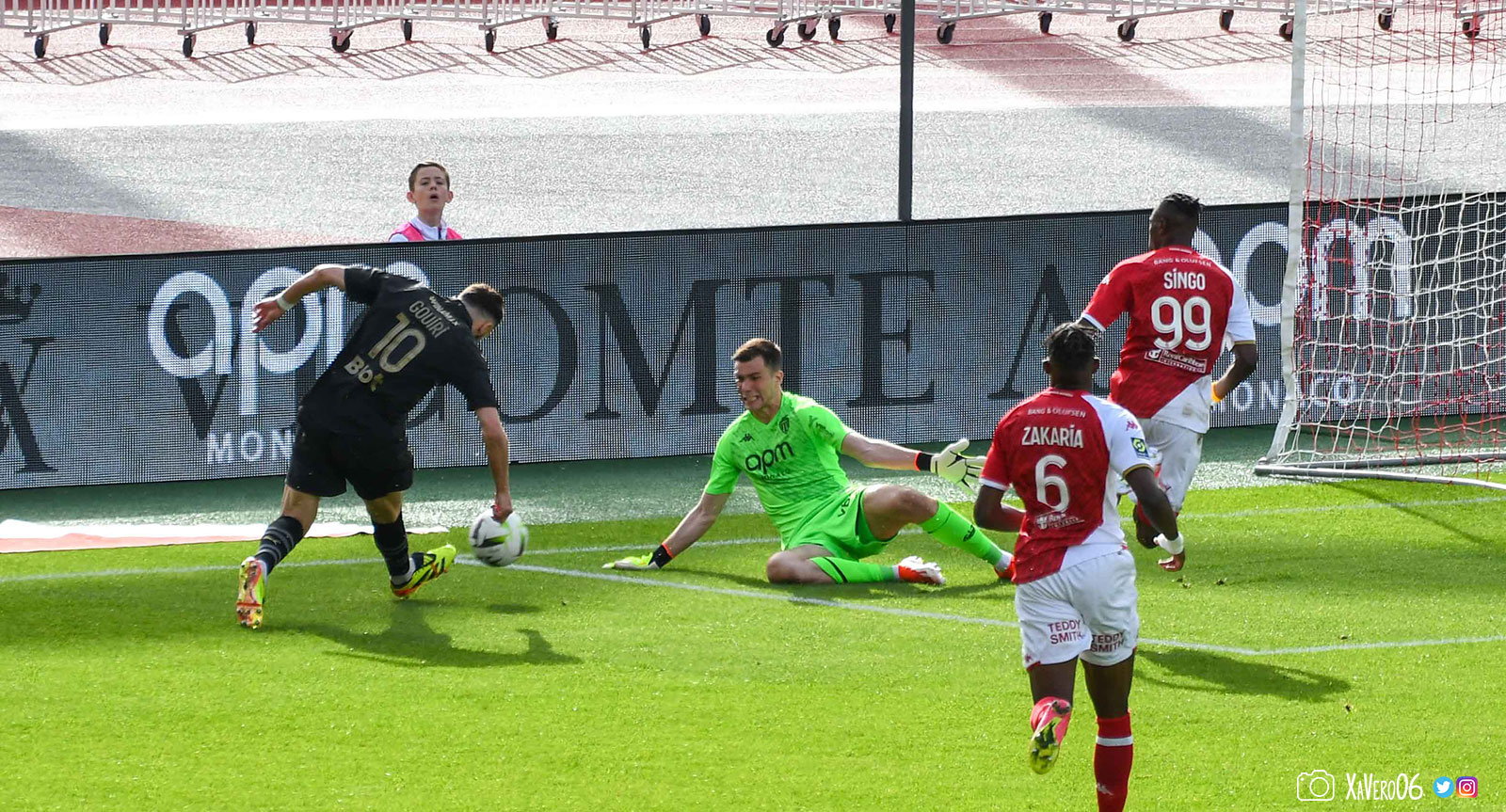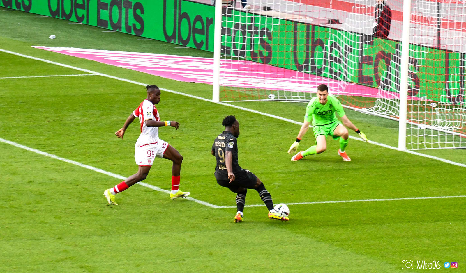 Action de Gouiri qui rentre dans la surface, poursuivi par Kehrer. Il résiste au monégasque, fait est face à Singo qui l'enferme dans l'angle, quasiment sur Majecki dans les 6m. Il frappe à côté du bout du pied (44e).