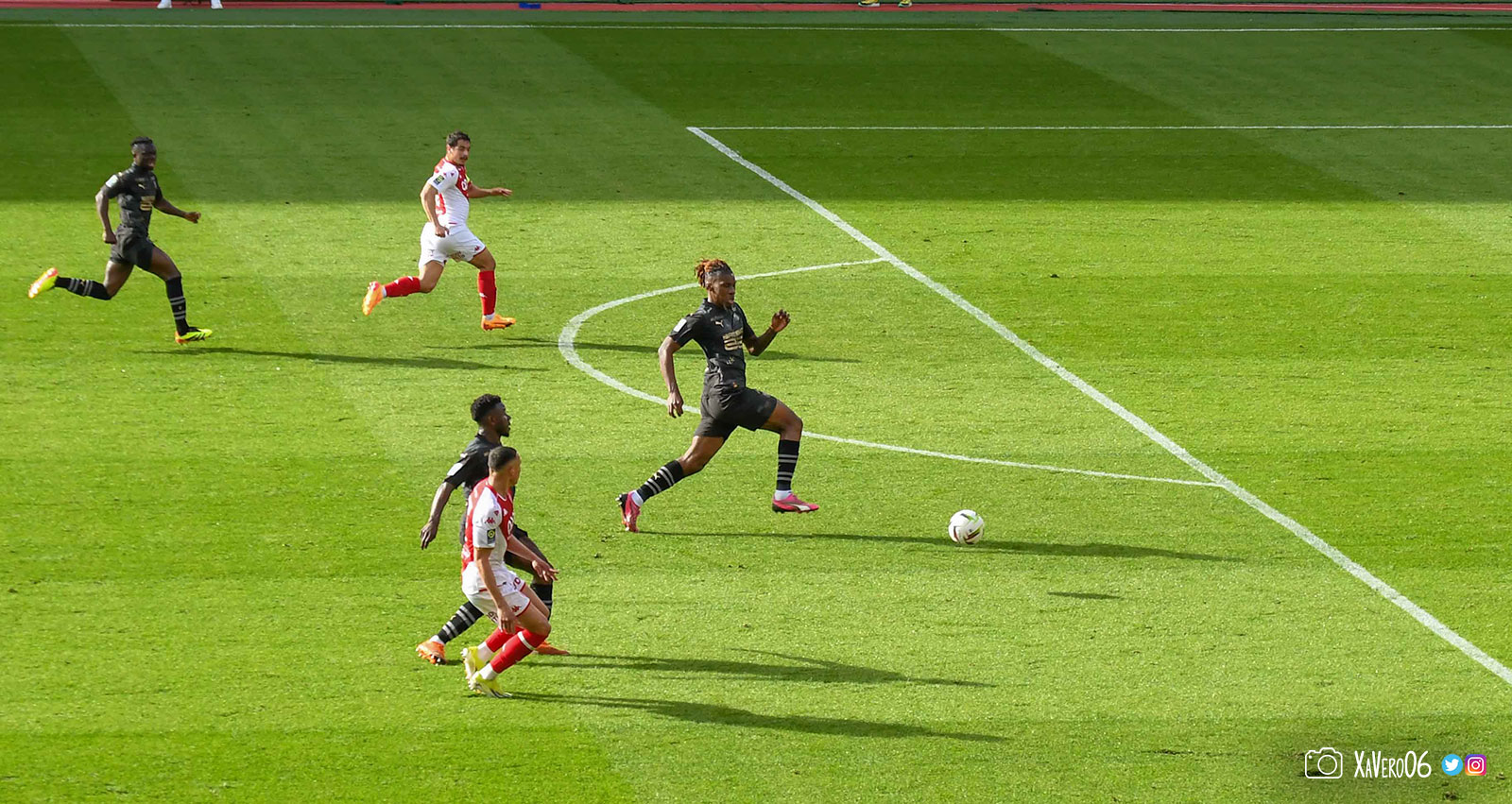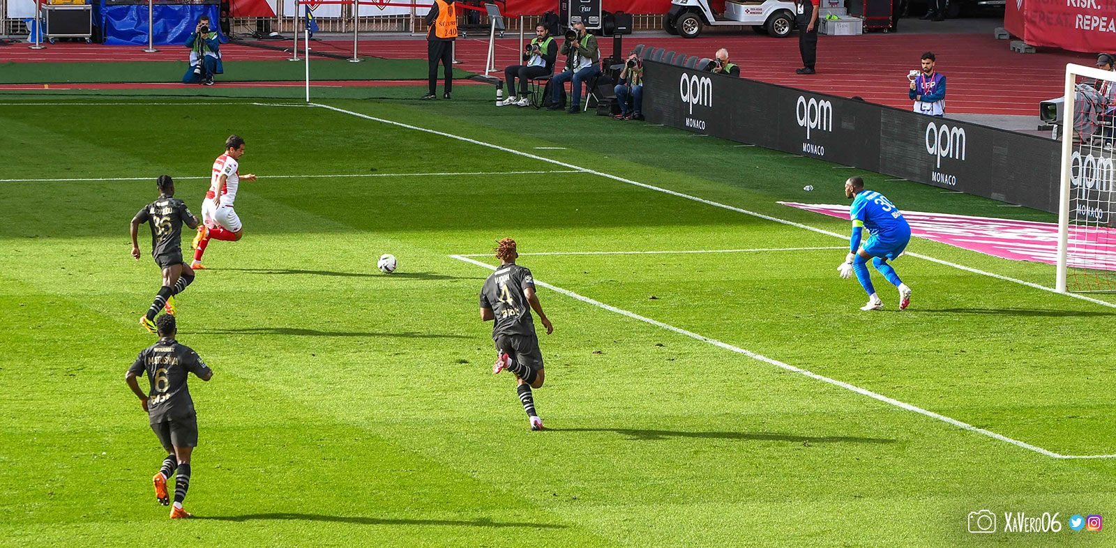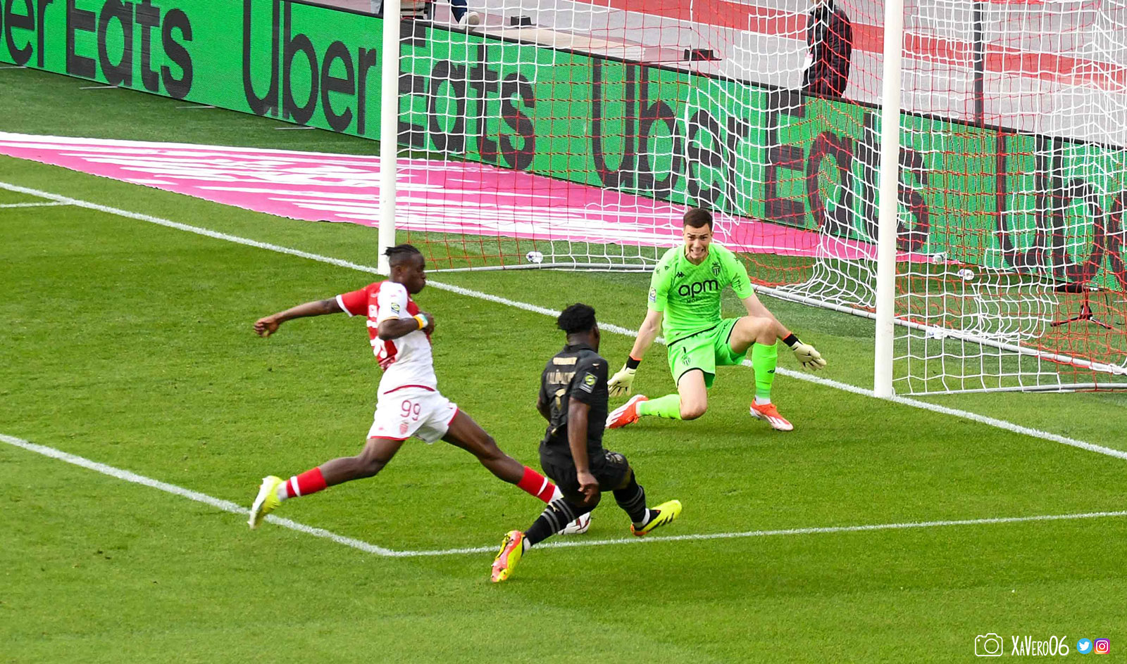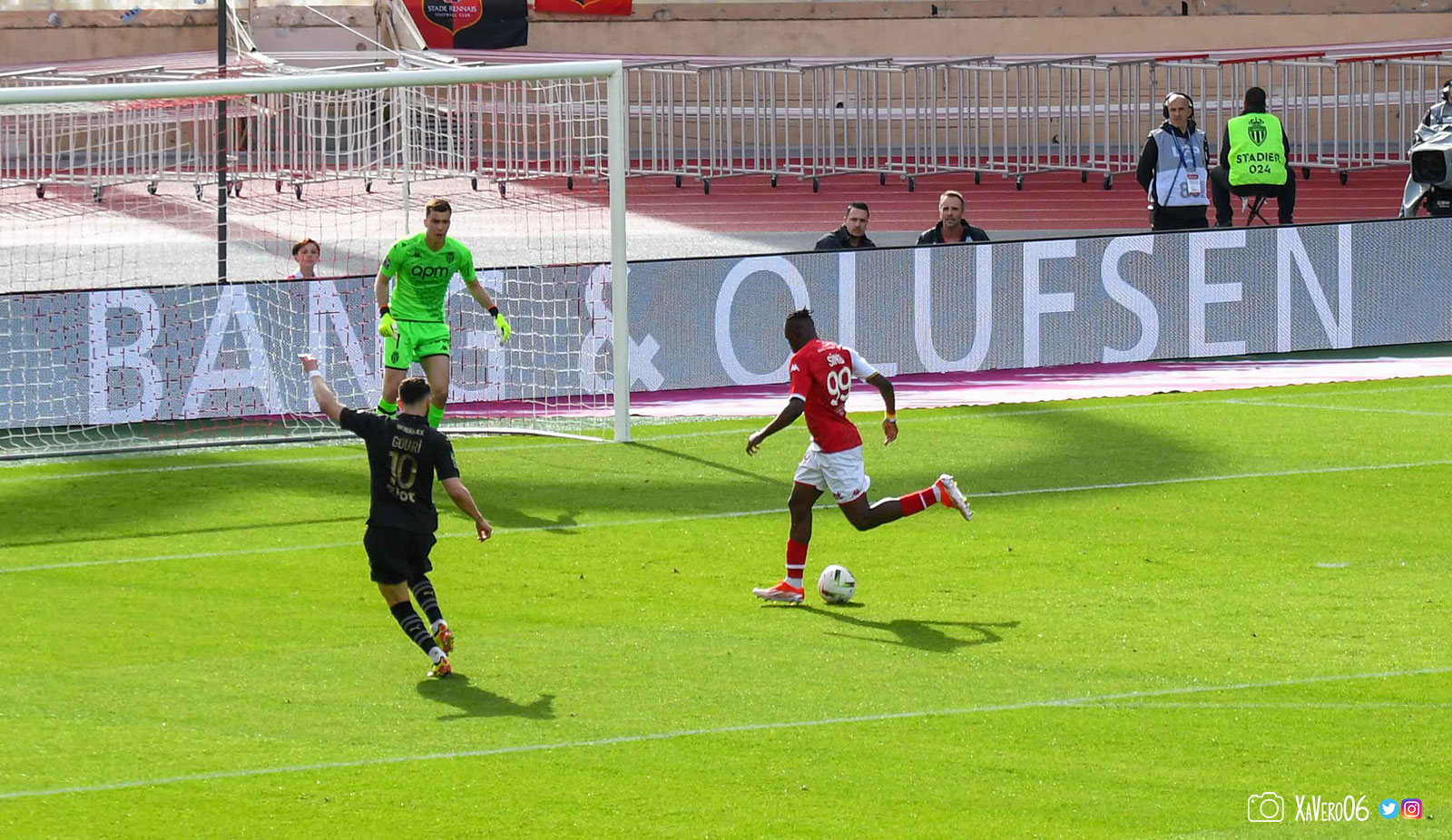Action de Gouiri qui rentre dans la surface, poursuivi par Kehrer. Il résiste au monégasque, fait est face à Singo qui l'enferme dans l'angle, quasiment sur Majecki dans les 6m. Il frappe à côté du bout du pied (44e).