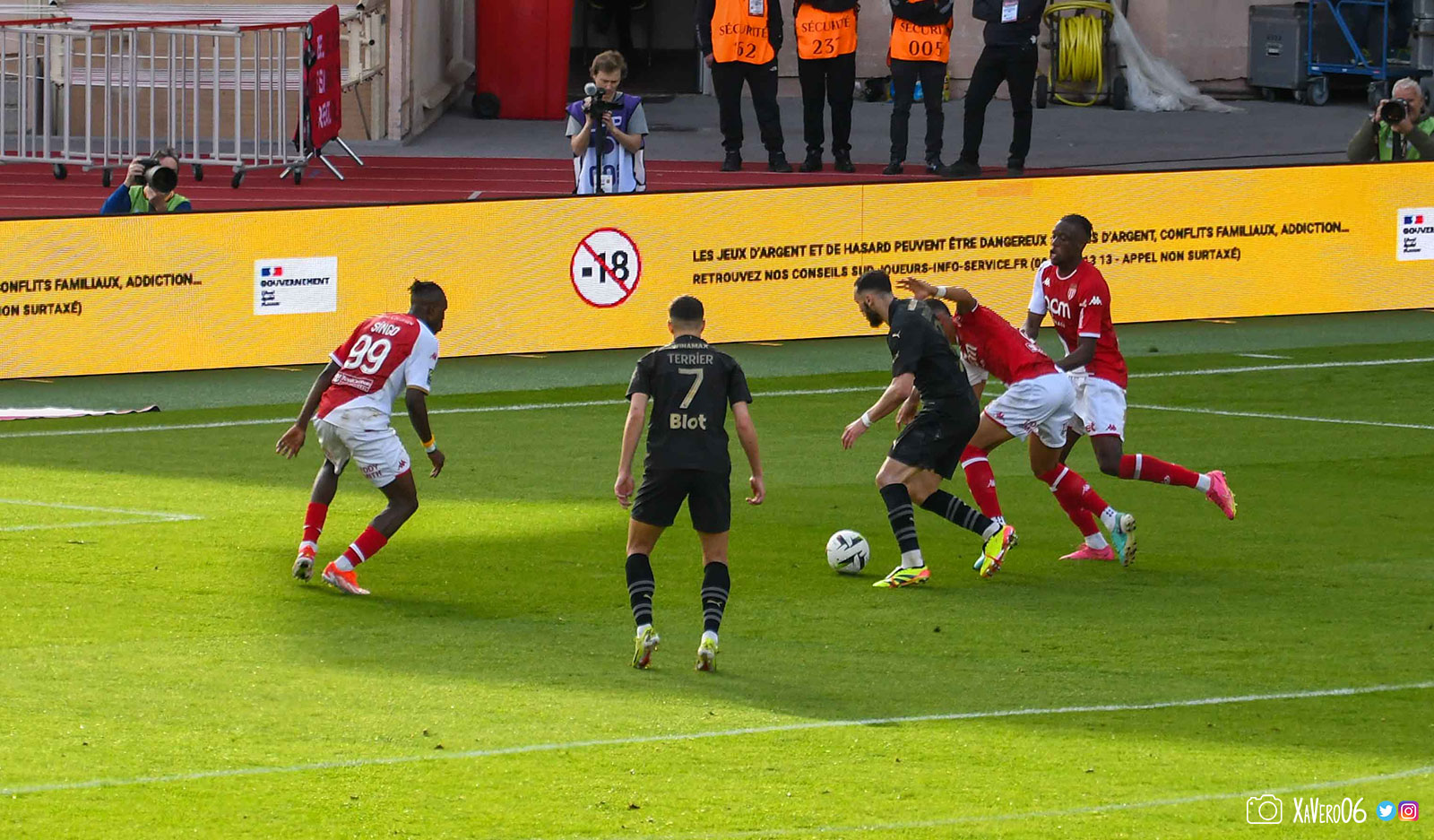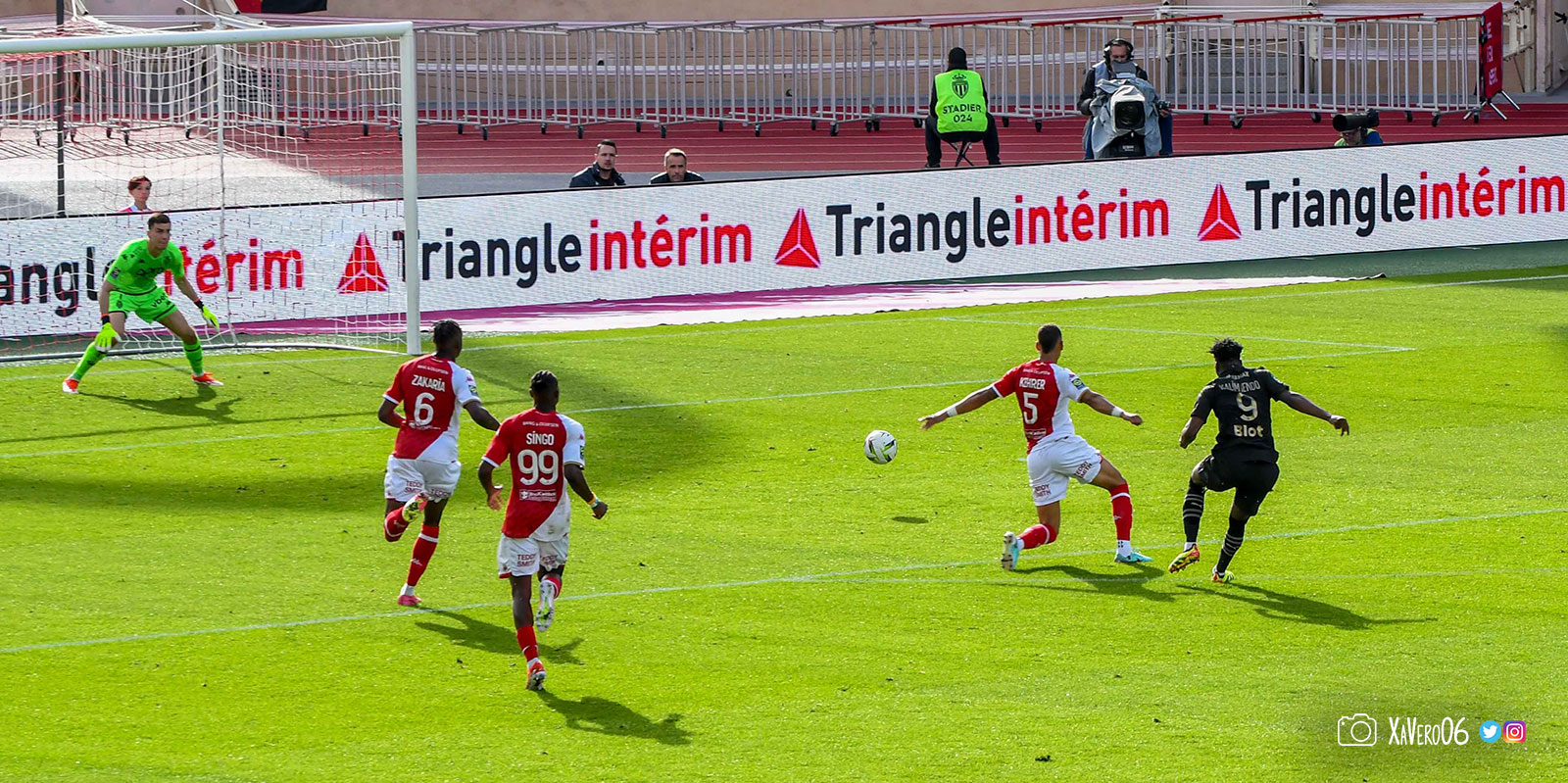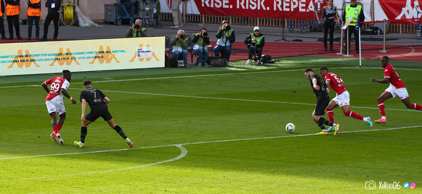 Contre monégasque, avec Akliouche qui lance Vanderson côté droit, qui centre trop profond ou trop fort pour Ben Yedder esseulé au second poteau, qui frappe en déséquilibre du gauche, le pied d'appui trop loin du ballon. À côté (35e).