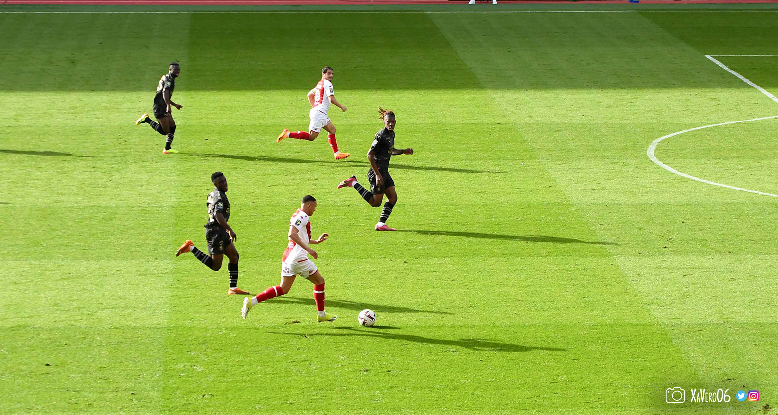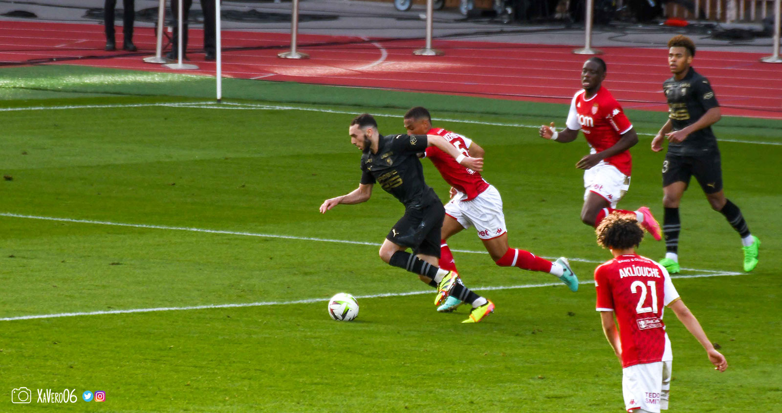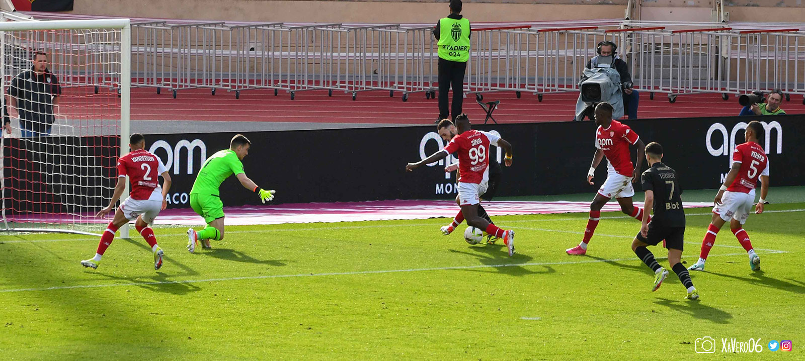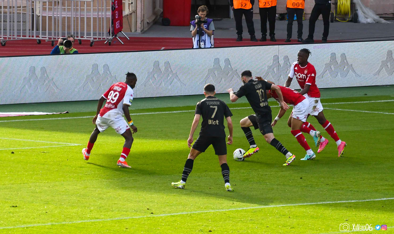 Contre monégasque, avec Akliouche qui lance Vanderson côté droit, qui centre trop profond ou trop fort pour Ben Yedder esseulé au second poteau, qui frappe en déséquilibre du gauche, le pied d'appui trop loin du ballon. À côté (35e).