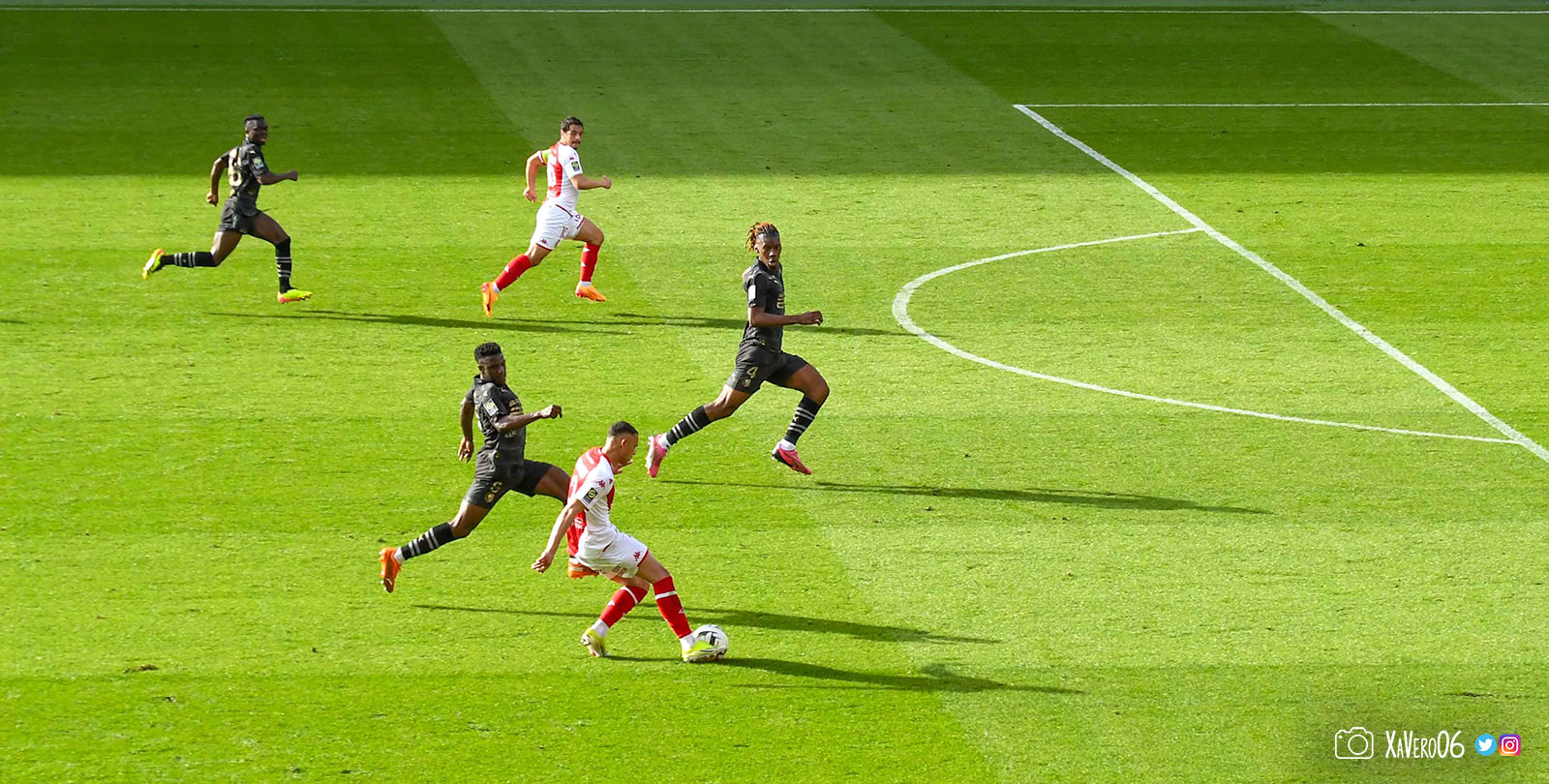 Festival de Takumi Minamino au poteau de corner côté gauche, qui élimine facilement Wooh, rentre dans la surface en longeant la ligne de but tel un funambule, pour centrer en évitant les jambes de Theate, malheureusement, personne n'a suivi pour la pousser au fond (28e).
