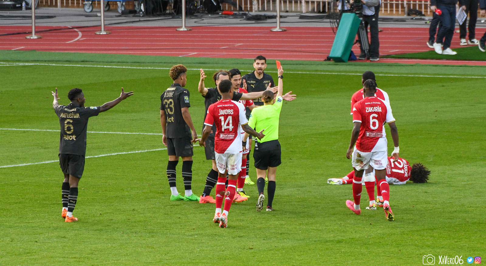 Et ce second acte débute avec un geste dangereux de Terrier sur un mollet d'Akliouche, après 25 secondes. Mme Frappard n'hésite pas et sort directement le carton rouge (46e).