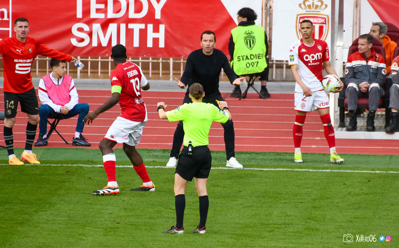 Monaco était bien parti, Rennes a s'est procuré de belles opportunités de scorer, et Adi Hütter donne des consignes à ses joueurs pendant que Seidu se fait soigner (22e).