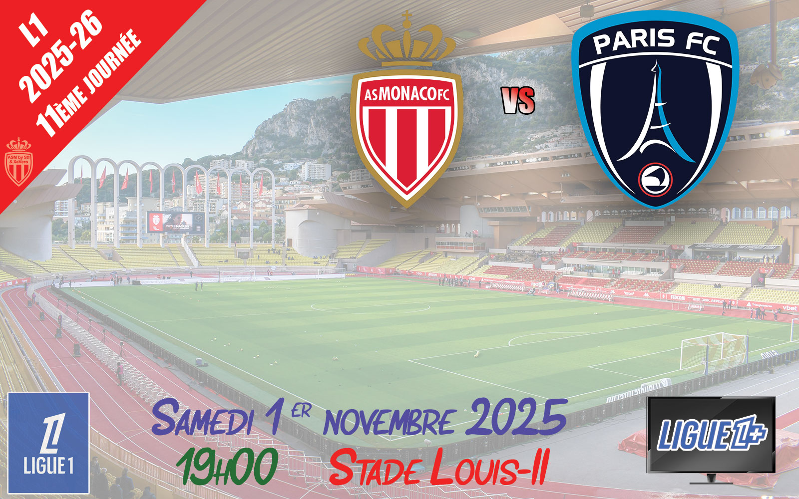 Pour la 11ème journée de Ligue 1, l'AS Monaco (2ème avec 20 points) reçoit le Paris FC (12ème avec 11 points).