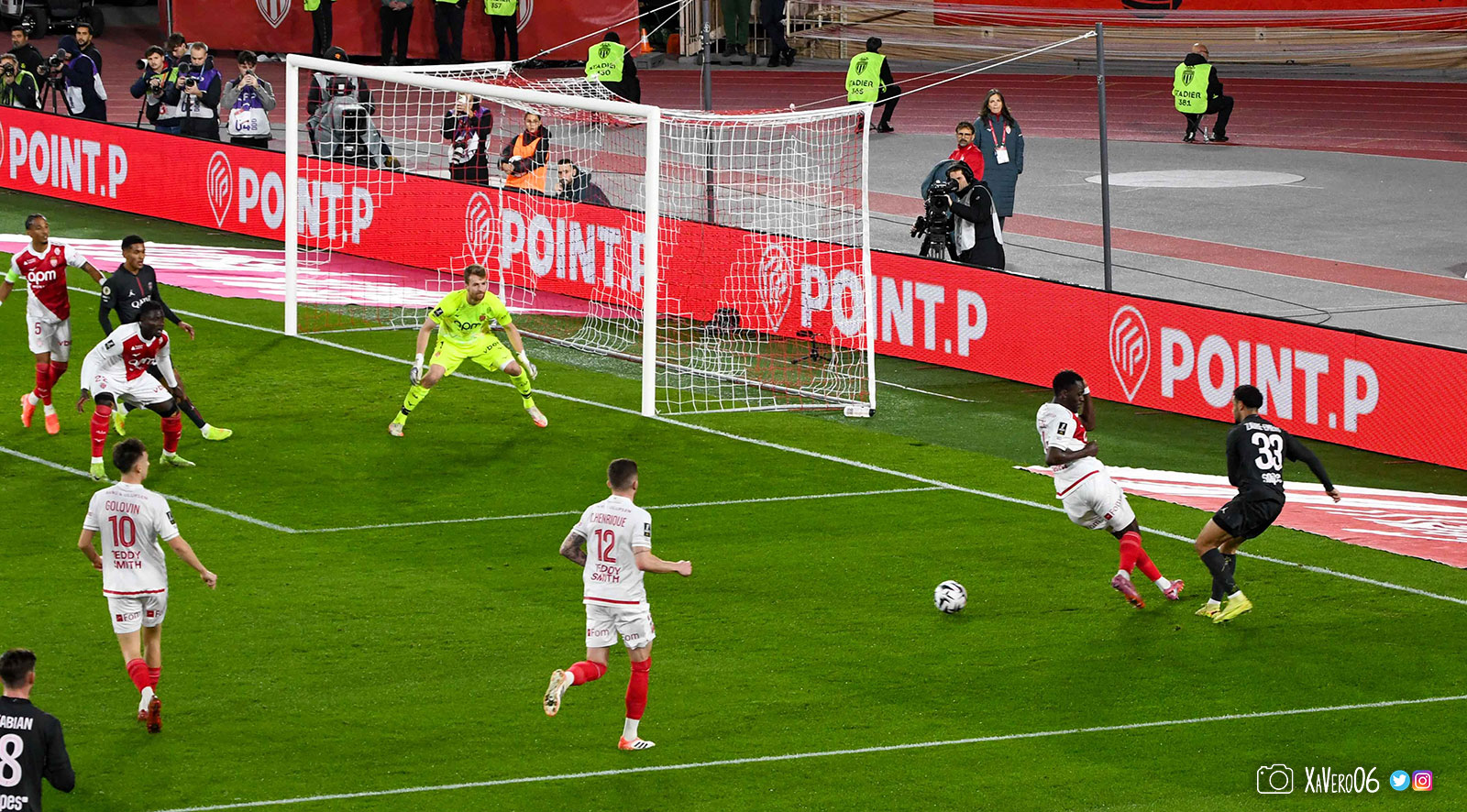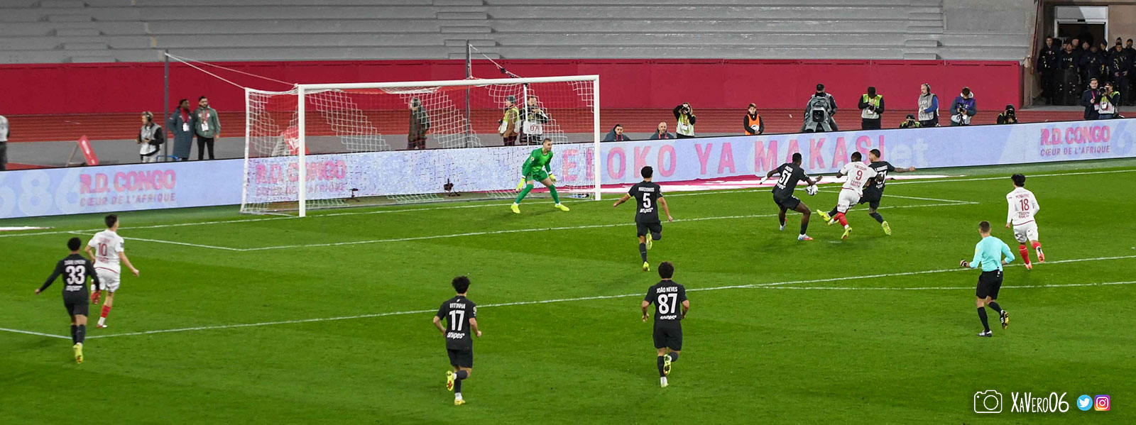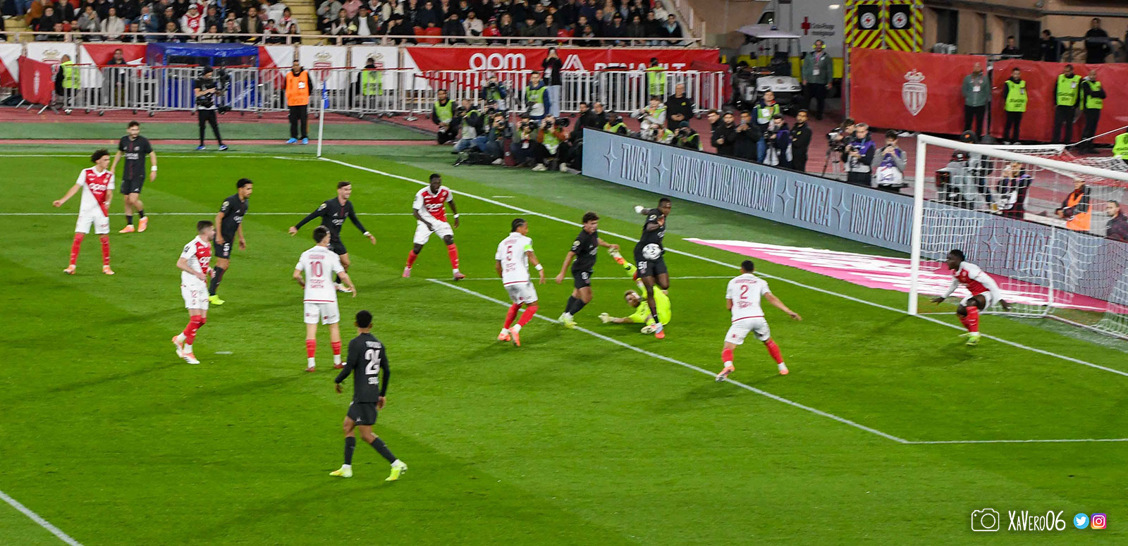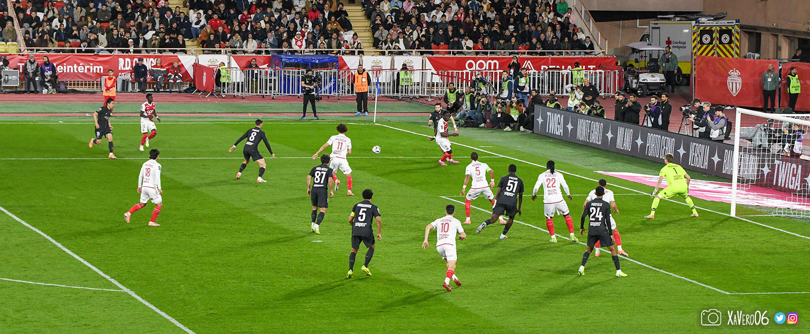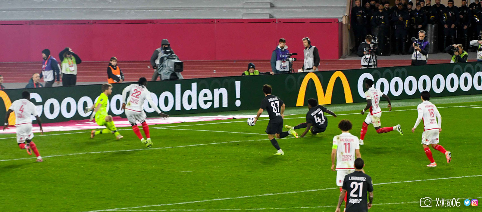 - Passe lobée de Teze pour Akliouche dans la surface, parti dans le dos de la défense. Le ballon est un peu fort et le monégasque ne peut le prendre aux 6m au premier poteau (21e).
