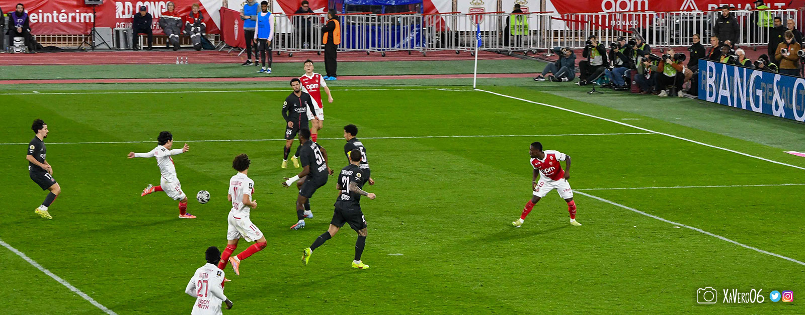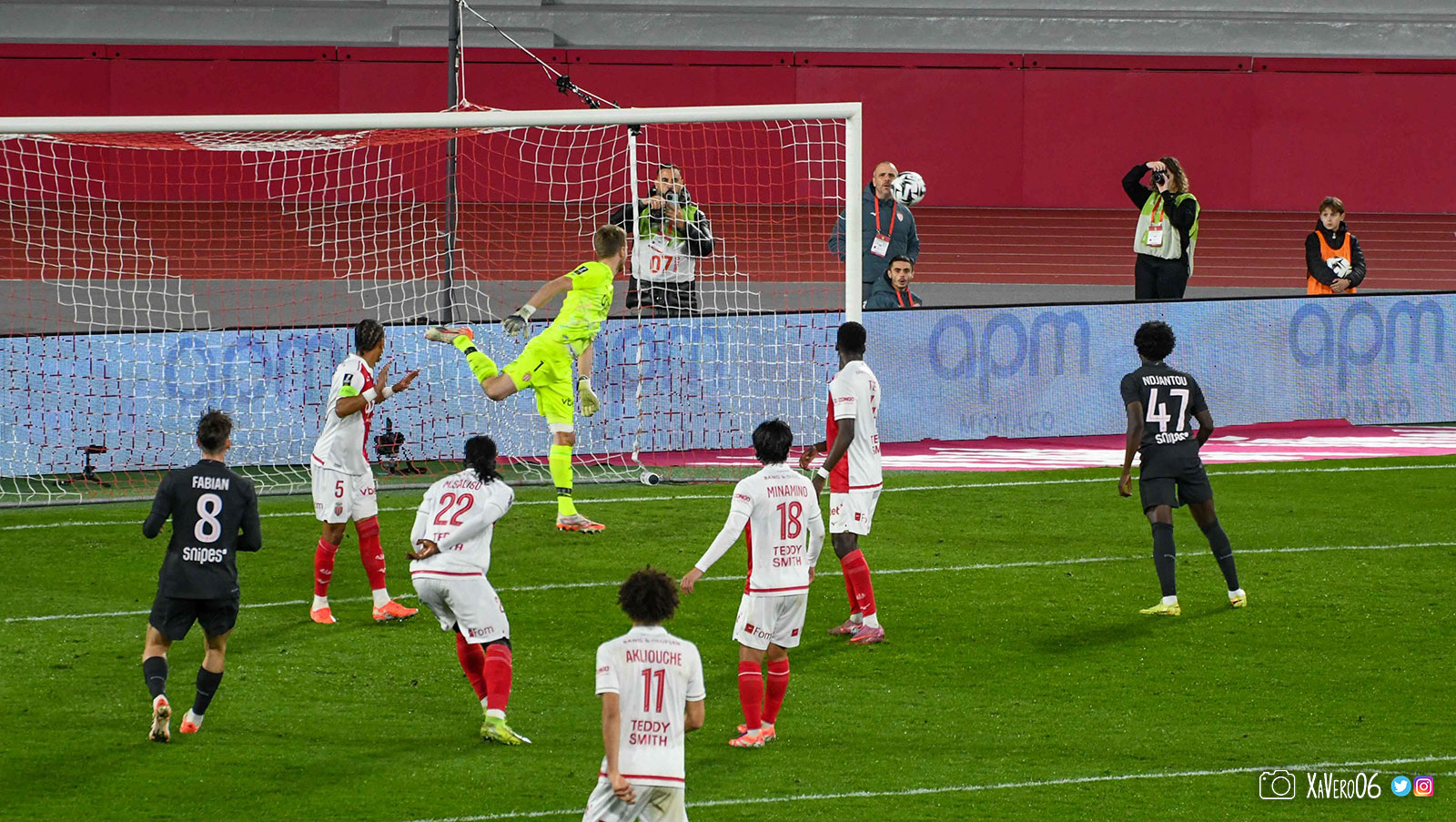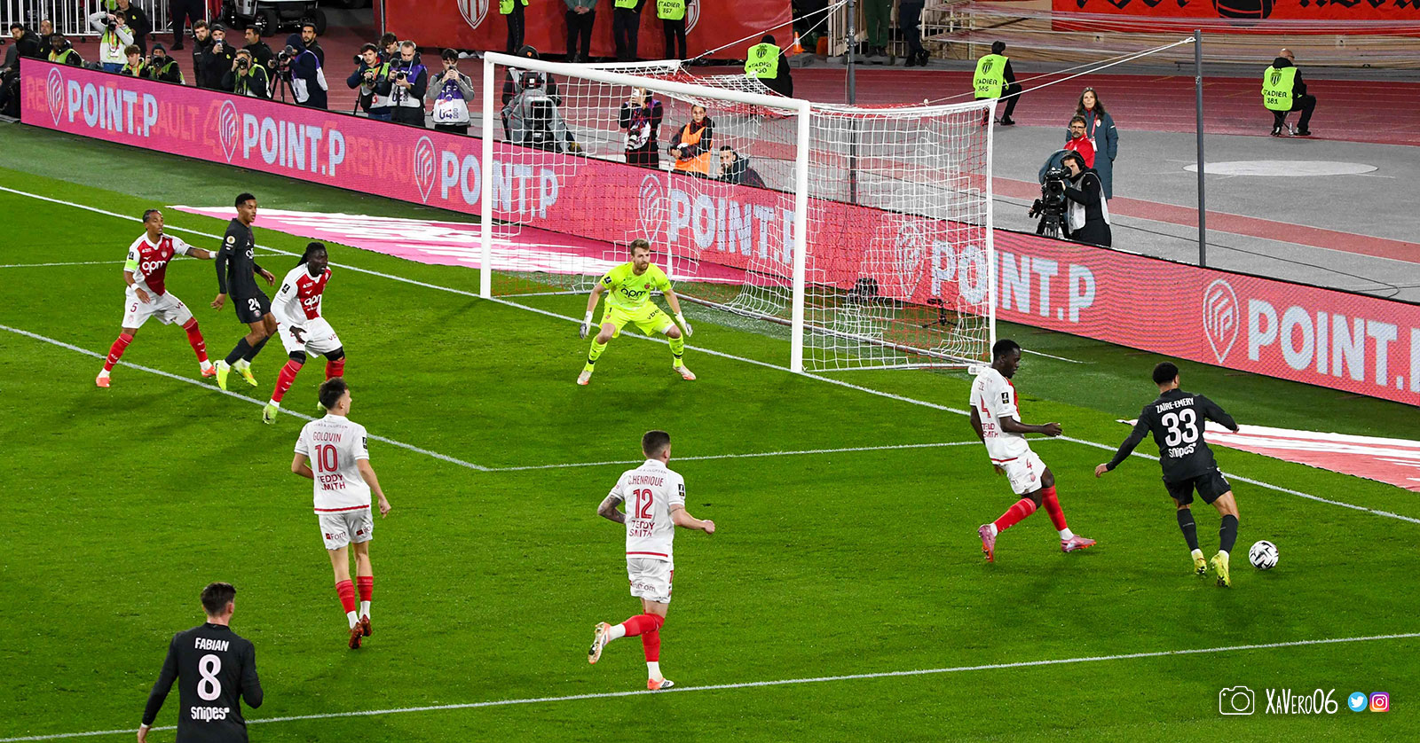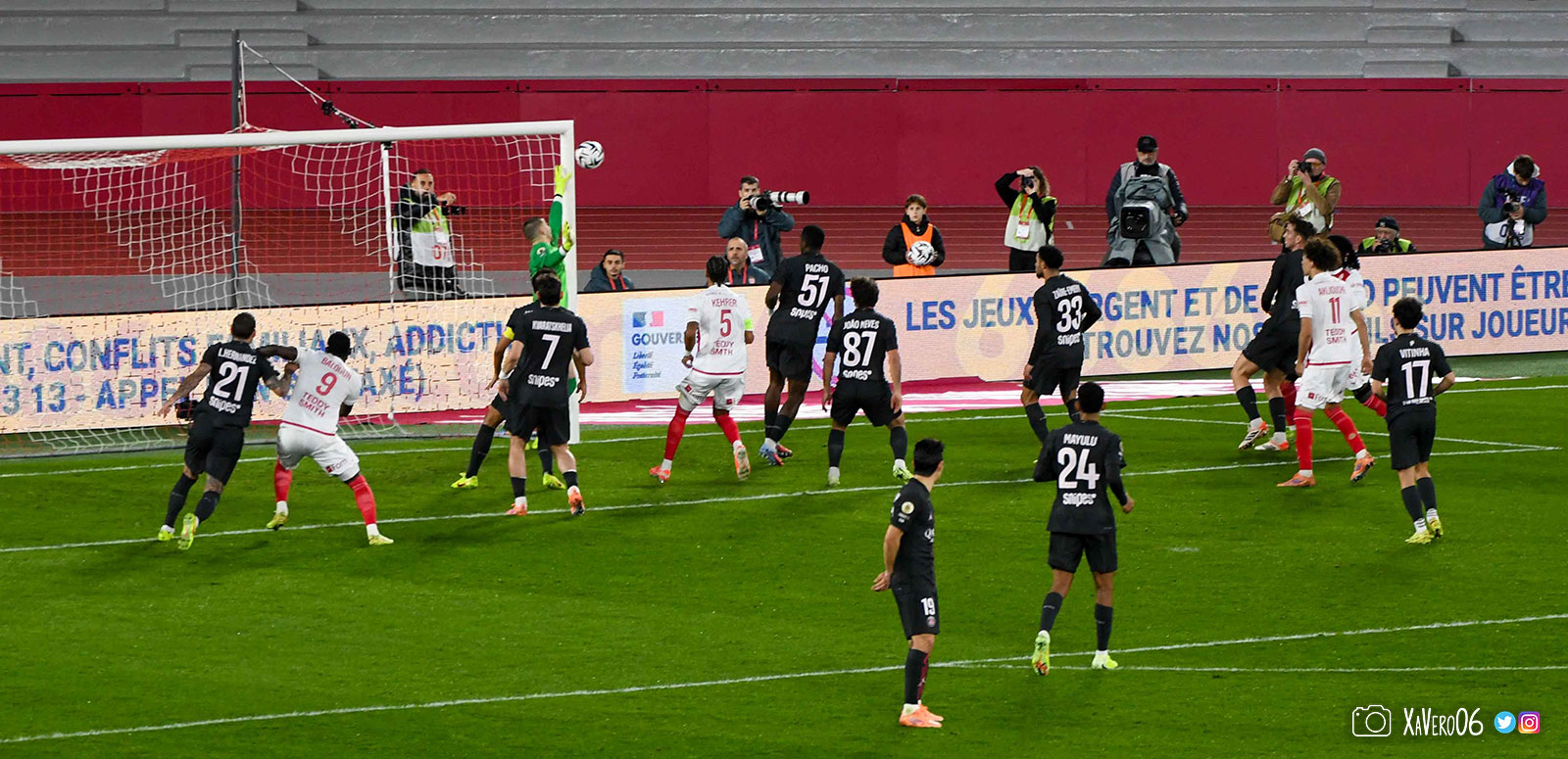 - Passe lobée de Teze pour Akliouche dans la surface, parti dans le dos de la défense. Le ballon est un peu fort et le monégasque ne peut le prendre aux 6m au premier poteau (21e).